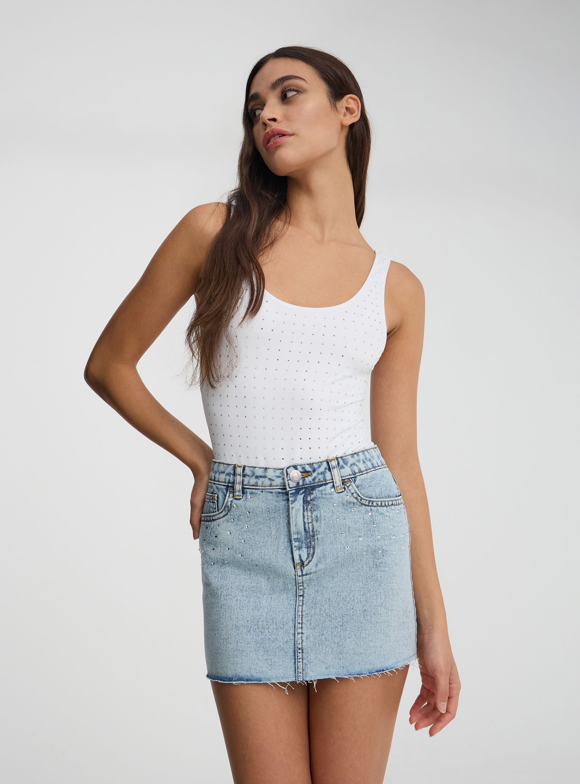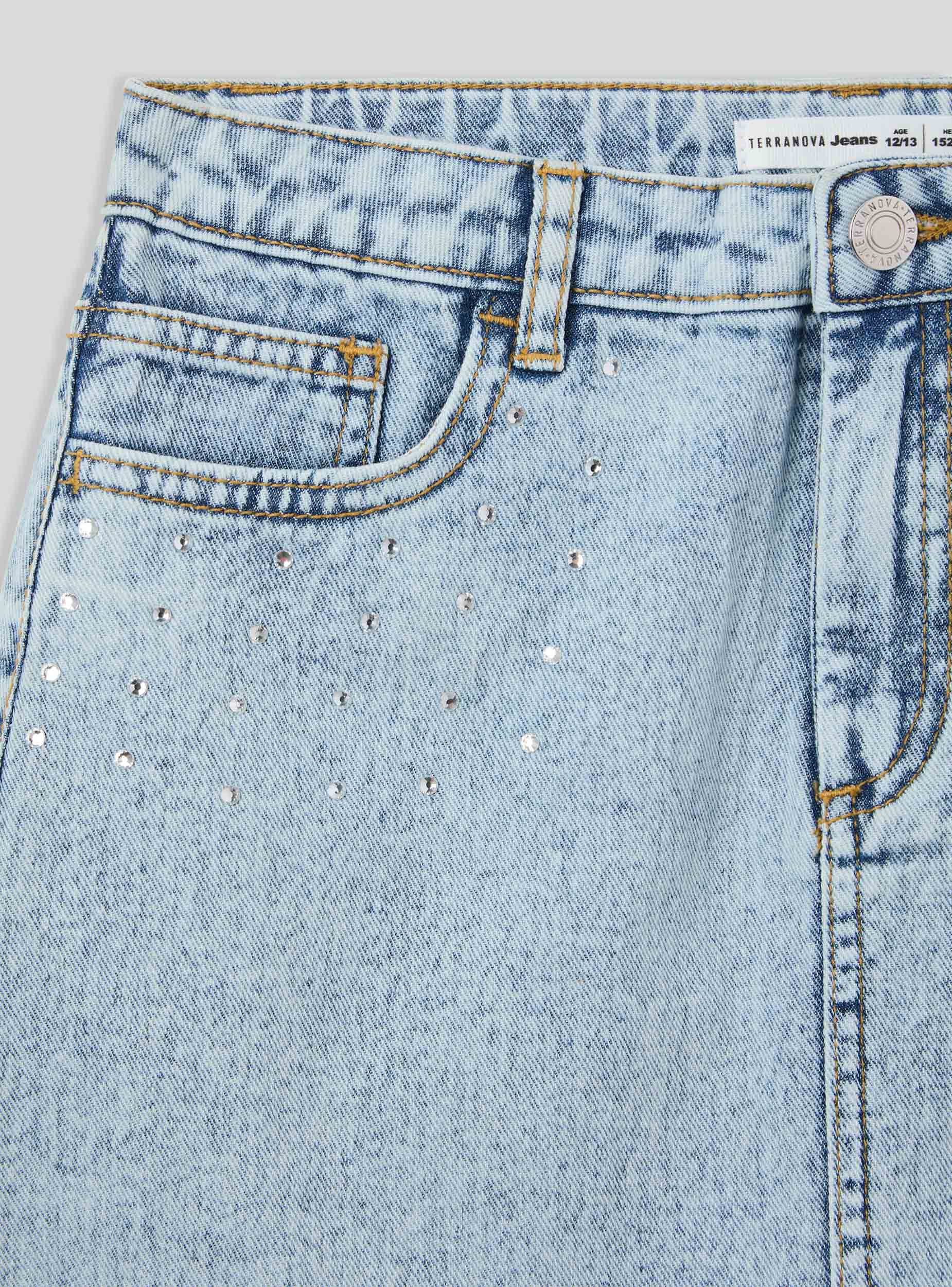 Mini funde për vajza në denim me strass, e karakterizuar nga një linjë casual-chic. Ka kalime në beli për shtimin e mundshëm të një rripi dhe një mbyllje me button përpara për më shumë praktikë. Dizajni kompletohet me xhepa të rehatshëm, të përshtatshëm për të ruajtur objekte të vogla. Ideale për të kompletuar pamje verore dhe dinamike.