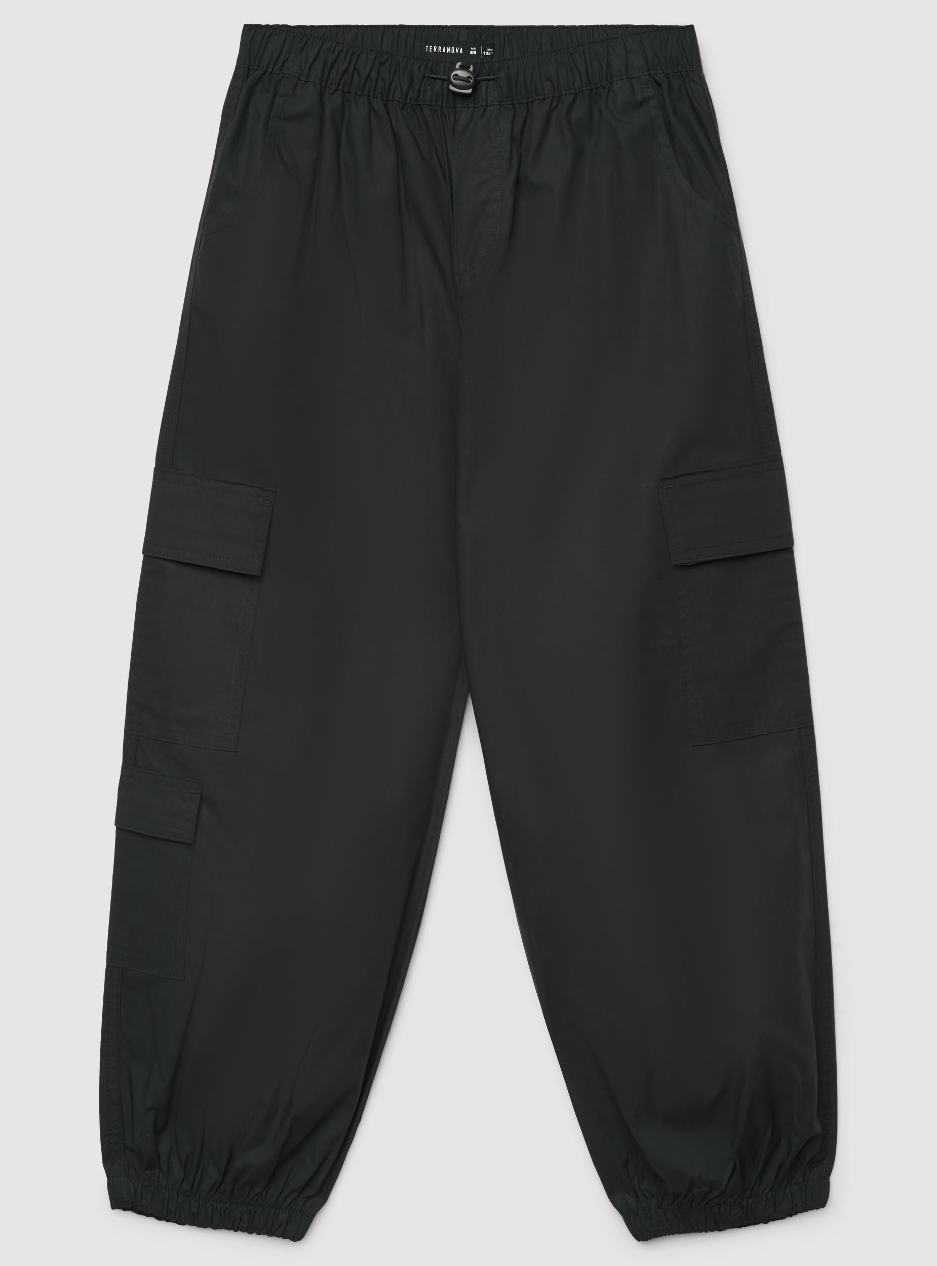 Pantallona vajzash me ngjyrë të vetme nga pambuku popelin me stil cargo, të përshtatshëm për shkollë dhe kohën e lirë. Bel elastik me lidhëse dhe fikse për rehati dhe rregullim, ndërsa xhepat anësorë dhe xhepat me kapak në këmbë shtojnë praktikë. Këmba e gjerë me fund elastik për një përshtatje të rehatshme, të përshtatshme me fanella dhe atlete.Detajet