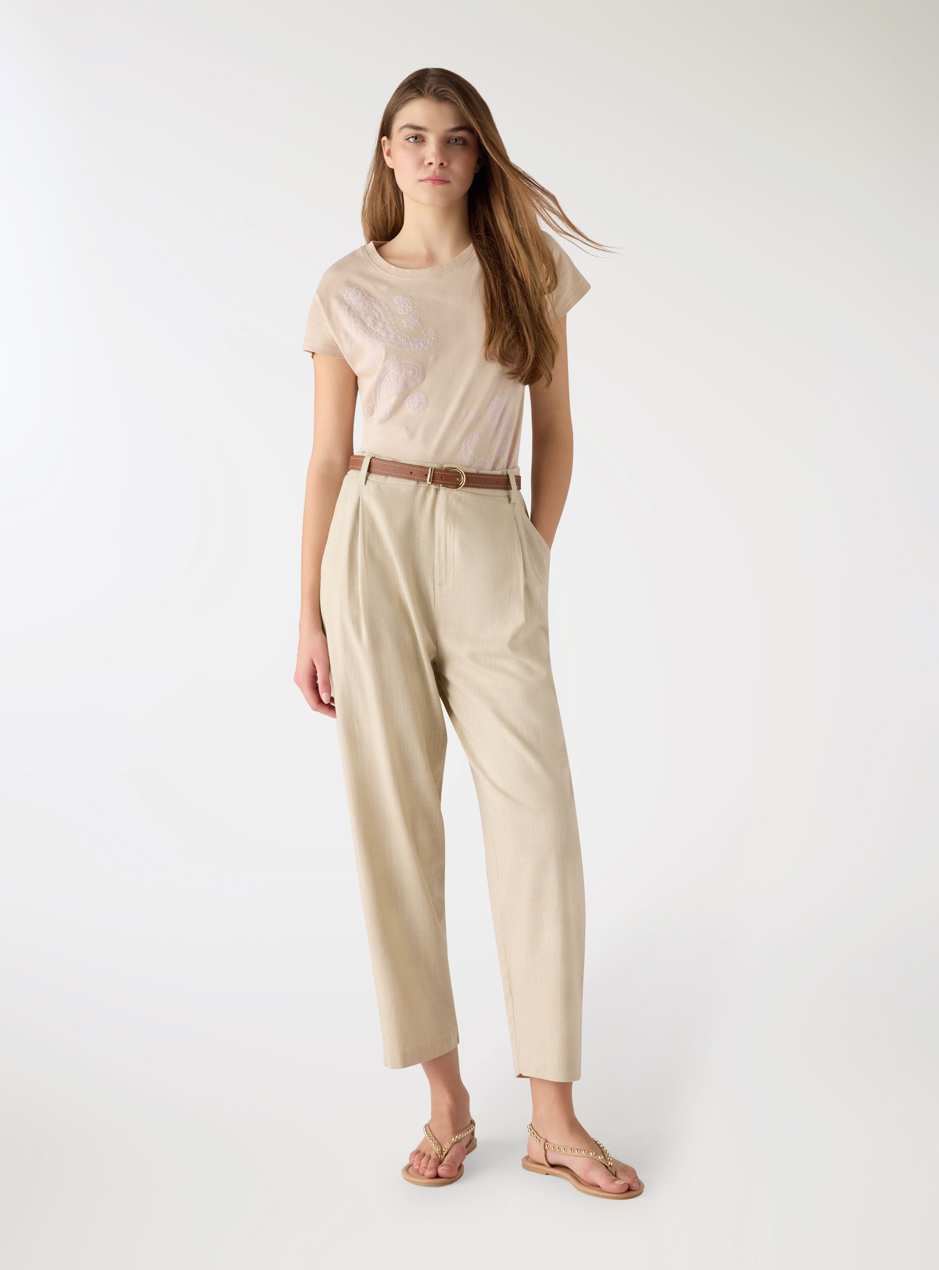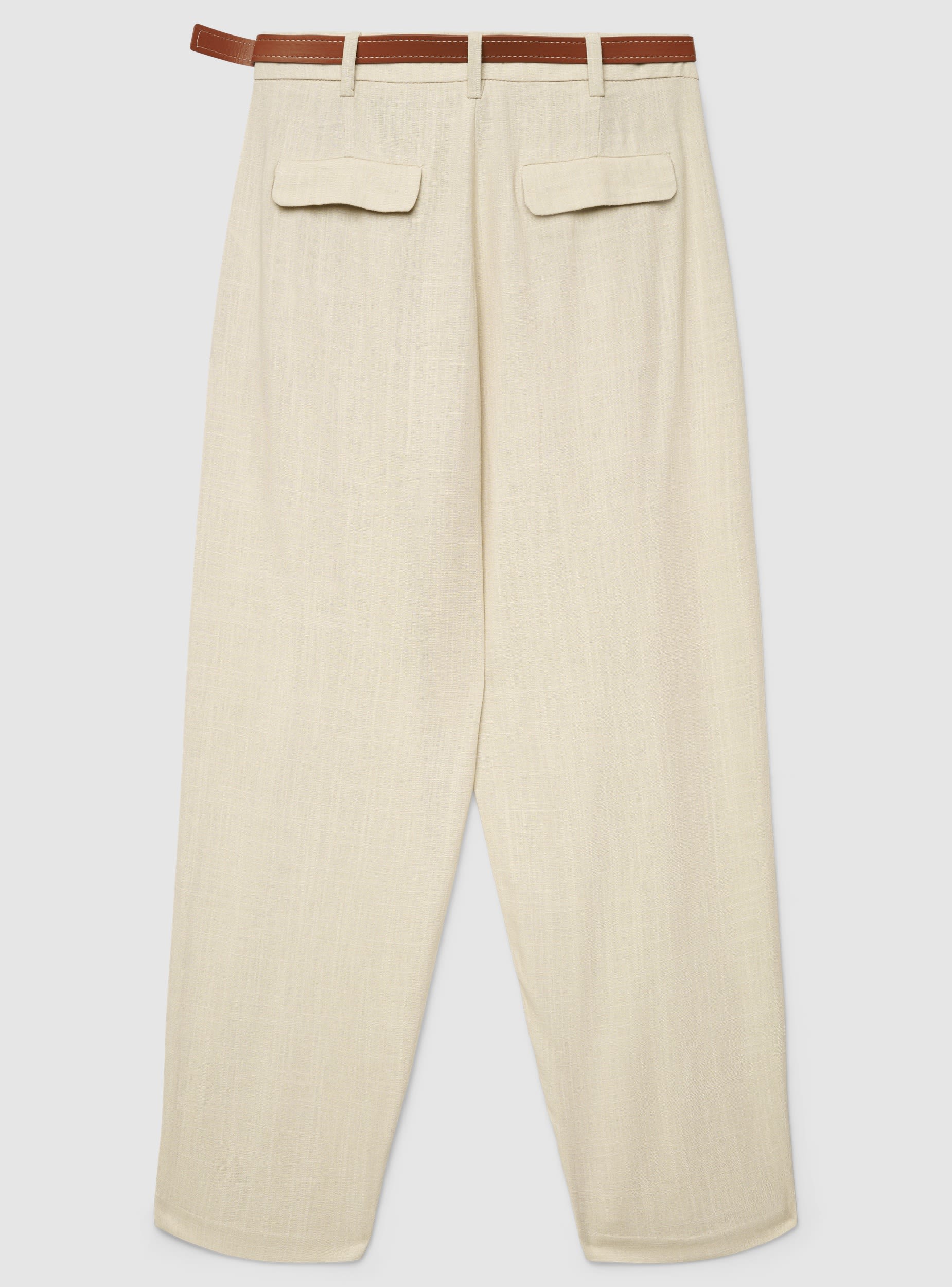 Pantallona të gjata për femra me ngjyrë të vetme, me stil chino dhe të shumëanshëm për pamje ditore ose zyre. Brezi në bel përcakton siluetën, ndërsa plisat në pjesën e përparme shtojnë volum dhe rehati. Mbyllje me zinxhir dhe buton, rripa në bel dhe xhepa anësorë të hollë. Ideale me këmisha, topa ose blazer për veshje të përkujdesura.Detajet