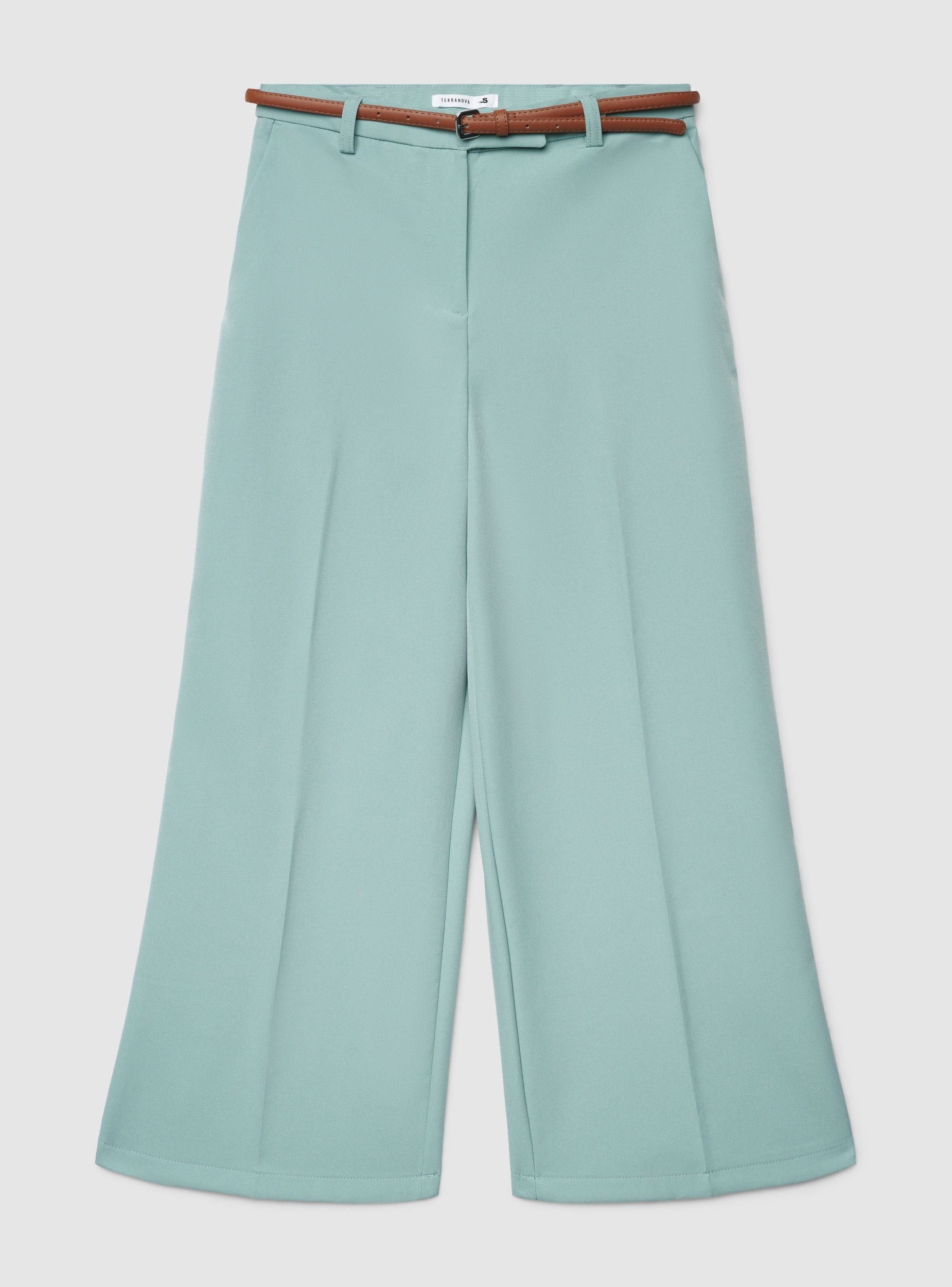 Pantallona për gra me ngjyrë të njëtrajtshme, prerje culotte wide leg, idealë për stil urban dhe zyre. Mbyllje me zinxhir dhe button. Bel i lartë me rripa dhe brez të përshtatur, plisë në pjesën e përparme që zgjat figurën dhe përshtatje e gjerë. Me xhepa anësorë dhe xhepa të pasmë të ngushtë. Perfektë me bluzë, top të ngushtë ose blazer dhe atlete ose sandale.Detajet