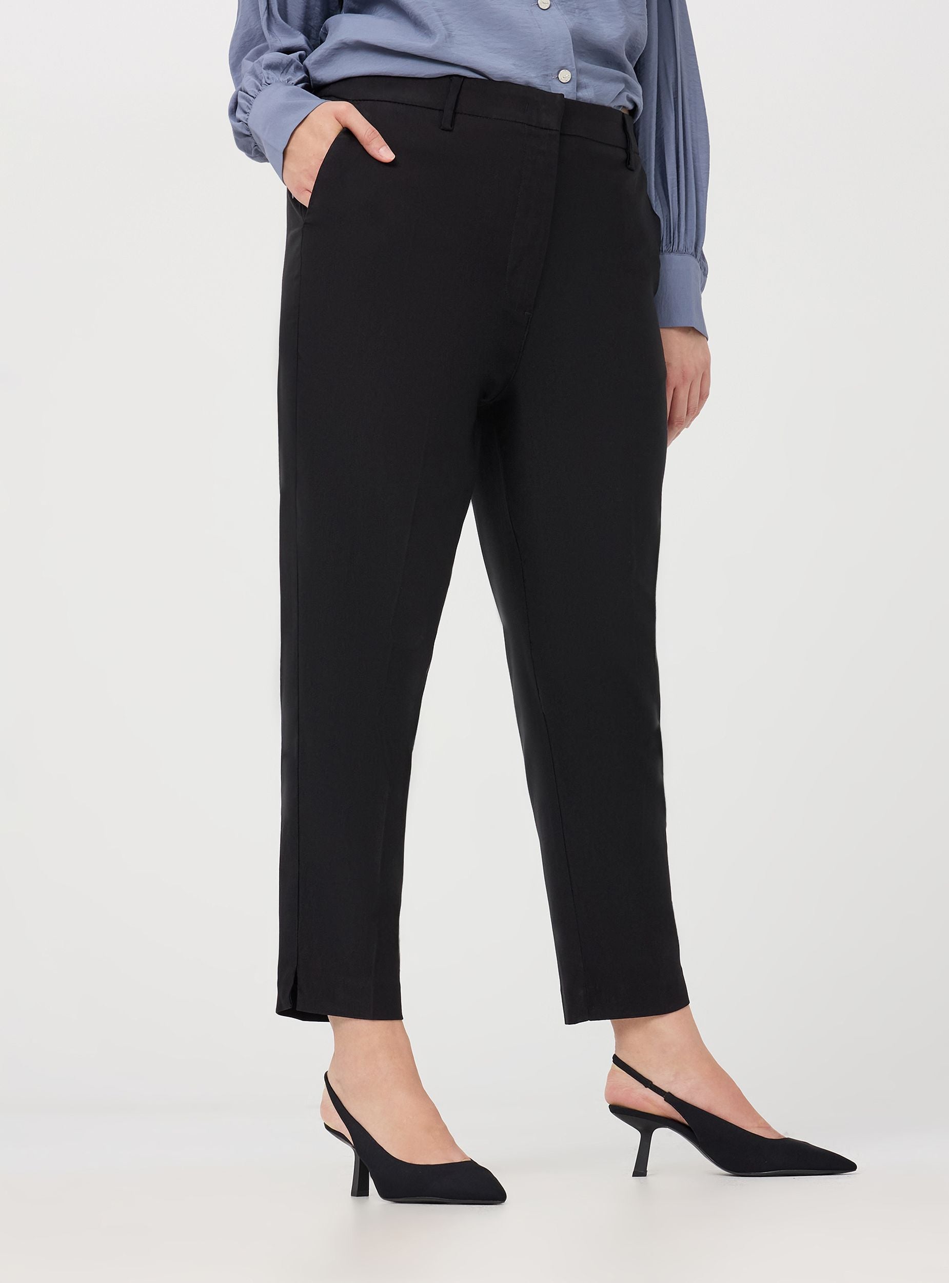 Pantallona elegante për gra me xhepa të francezëve. Ky artikull ka një linjë klasike me palosje të përparme dhe të prapme për një efekt sartorial. Pjesa e belit është e pajisur me një elastik të brendshëm për të garantuar komoditet dhe përshtatje, ndërsa një mbyllje me hunj metalik dhe zinxhir të përparmë siguron një mbyllje të sigurt. Të përshtatshme si për raste formale ashtu edhe për një pamje casual-chic.Detajet
