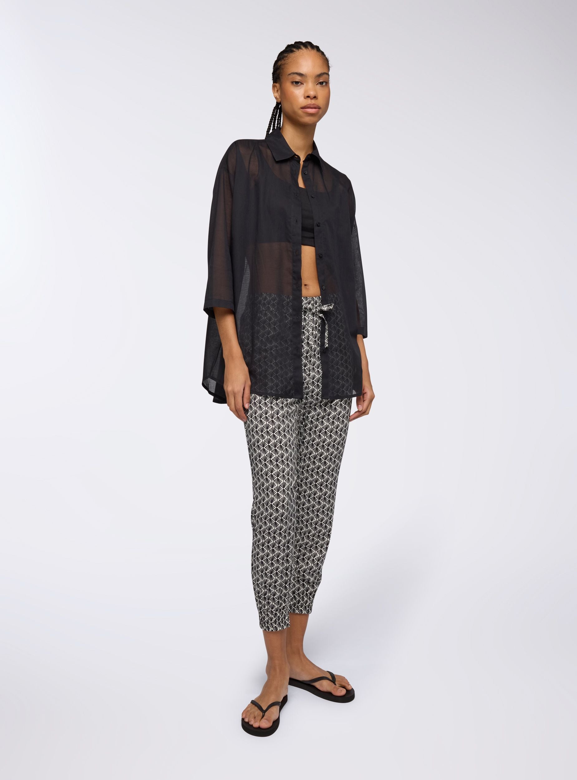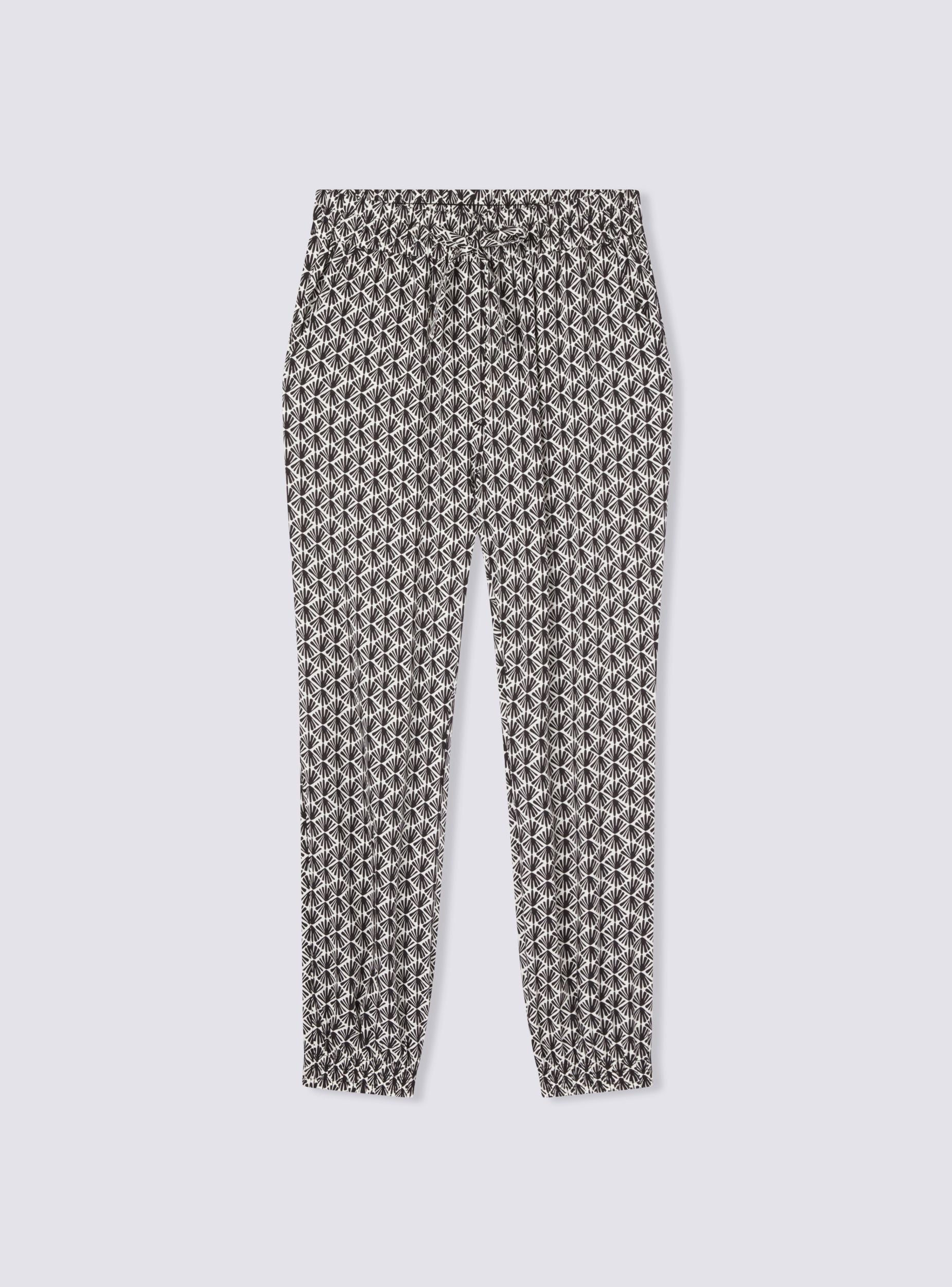 Pantallona për gra në stilin jogger me një fantazi etnike tërheqëse, perfekte për ata që e duan një pamje të rastësishme por origjinale. Të pajisura me një rrip të rregullueshëm në bel dhe xhepa praktikë anësorë, ofrojnë komoditet dhe stil në çdo rast. Ideale për outfit të relaksuar me sneakers dhe t-shirt ose për një prekje urban-chic me top dhe sandale.Detajet