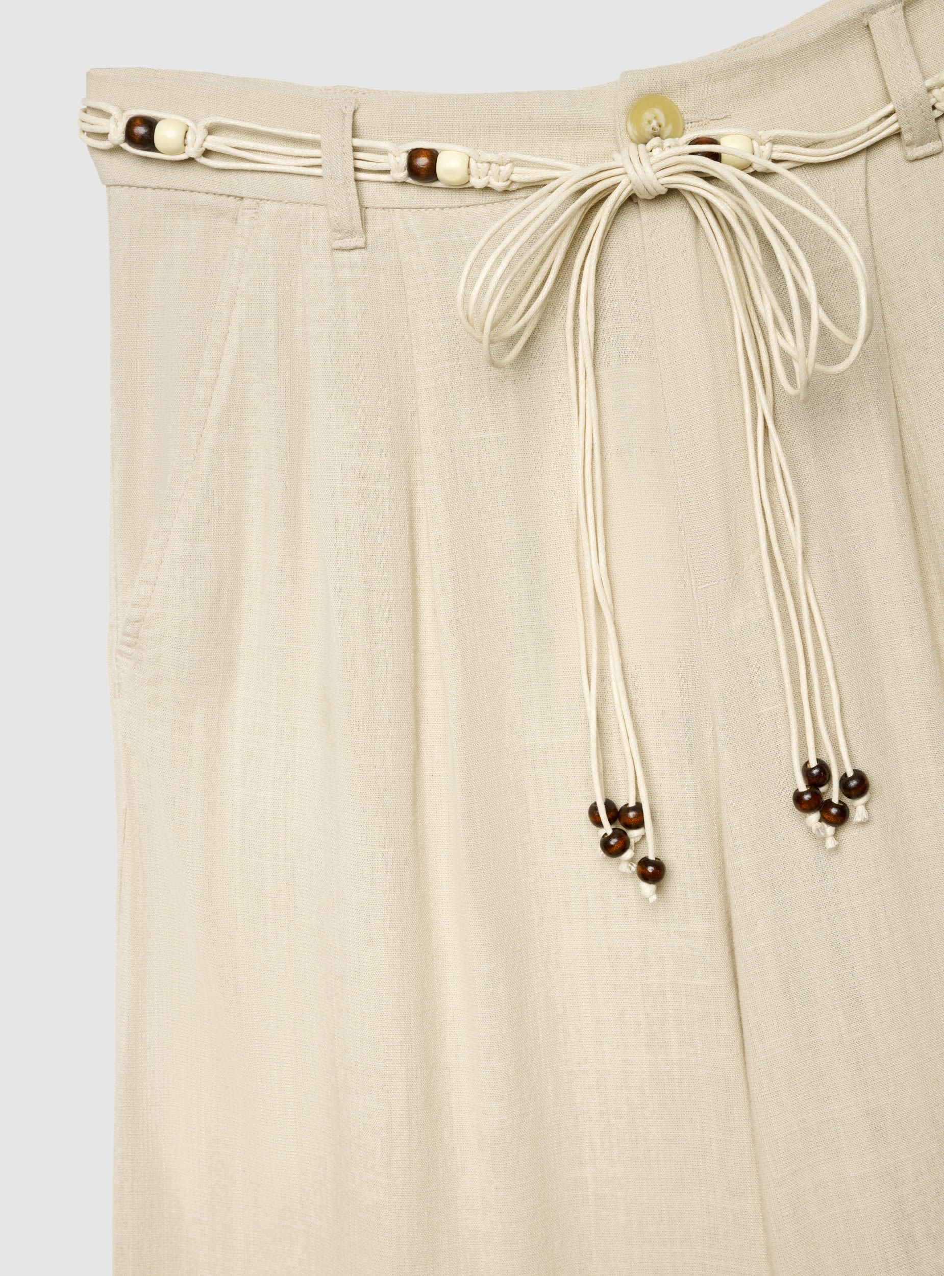 pantolona të shkurta:87% Viskoze 10% Lino 3% Lyocell rrip:Pjesa kryesore:65% Pambuk 35% Poliestër Zbukurim:100% Dru