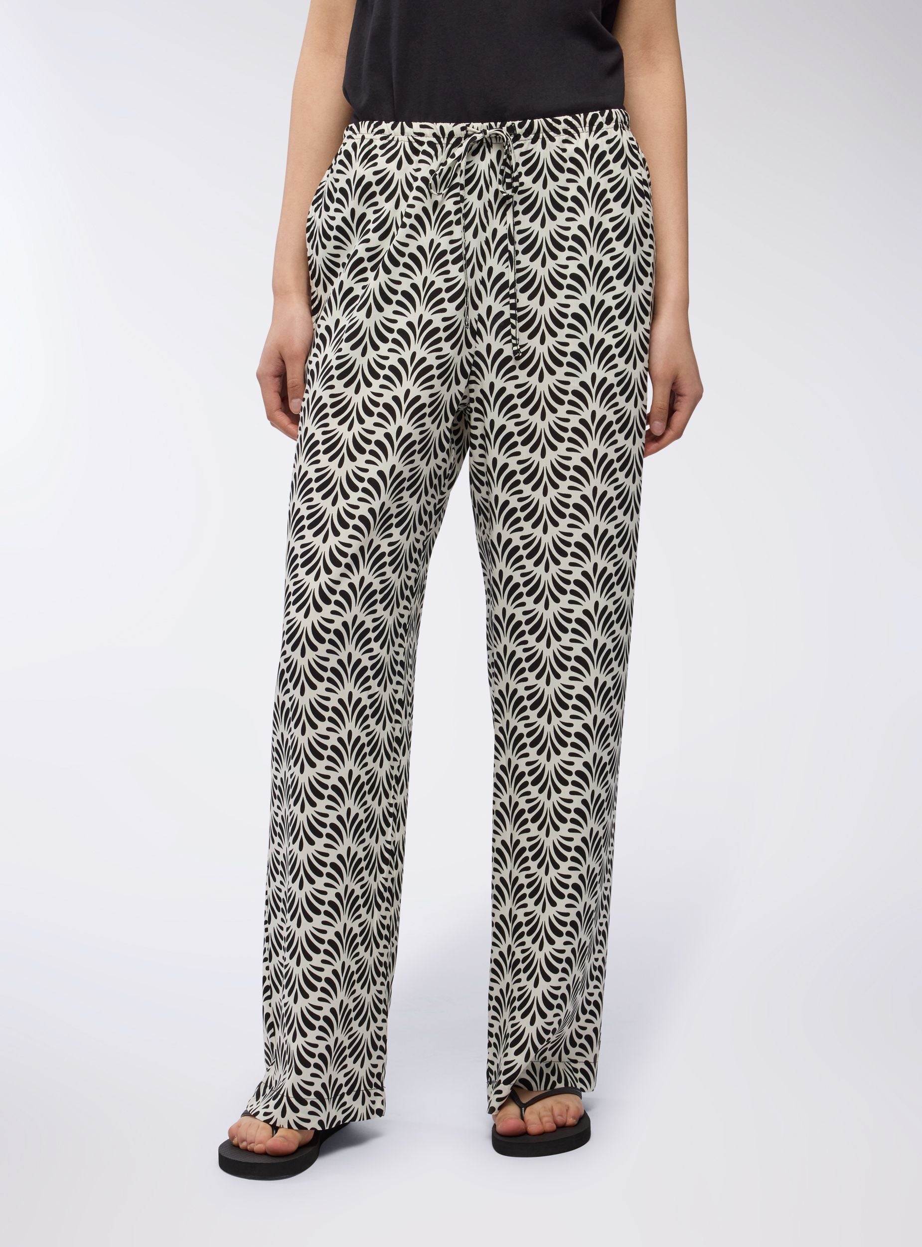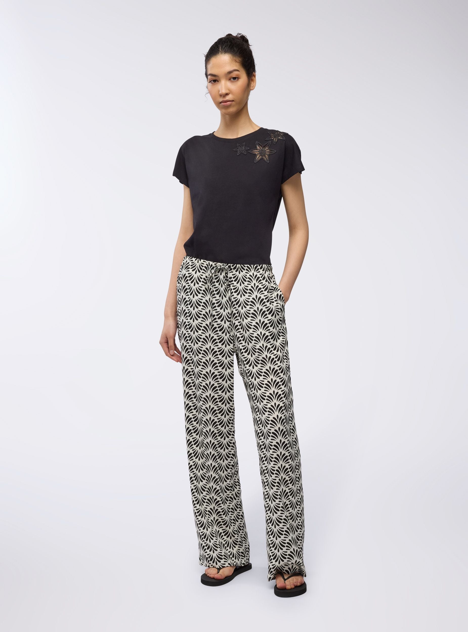 Pantallona për gra me këmbë të gjera me një model etnik, të përsosur për një pamje freskuese dhe origjinale. Dizajni i gjerë ofron komoditet dhe lehtësim, ndërsa kërkesa e rregullueshme në bel siguron një përshtatje të përsosur. Xhepat anësorë shtojnë praktikën, duke i bërë ato ideale për kohën e lirë dhe pushimet. Të përsosur me një bluzë të ngushtë dhe sandale për një veshje të relaksuar, ose me një bluzë të lirshme për një prekje më sofisticuar. Ideale për ditët verore dhe shëtitjet në qytet.Detajet