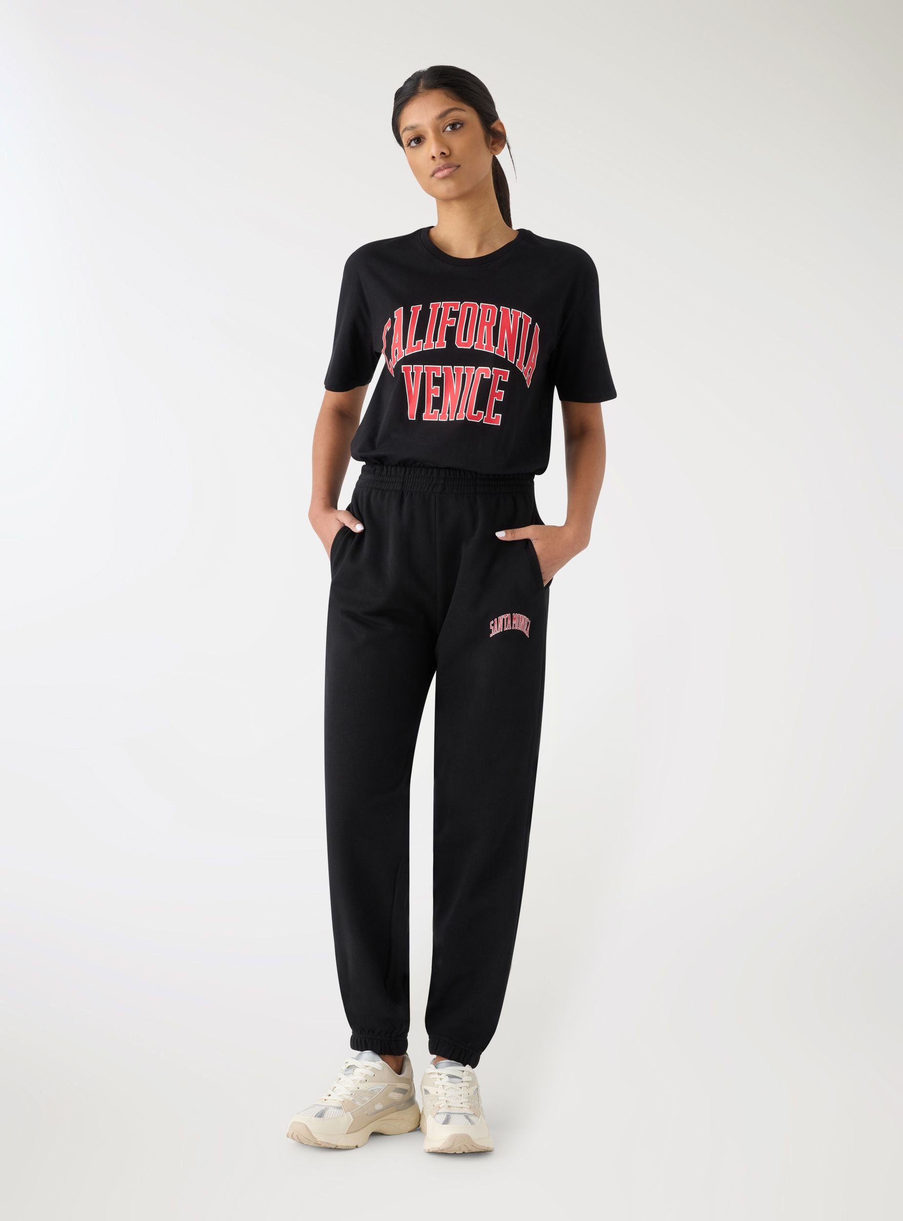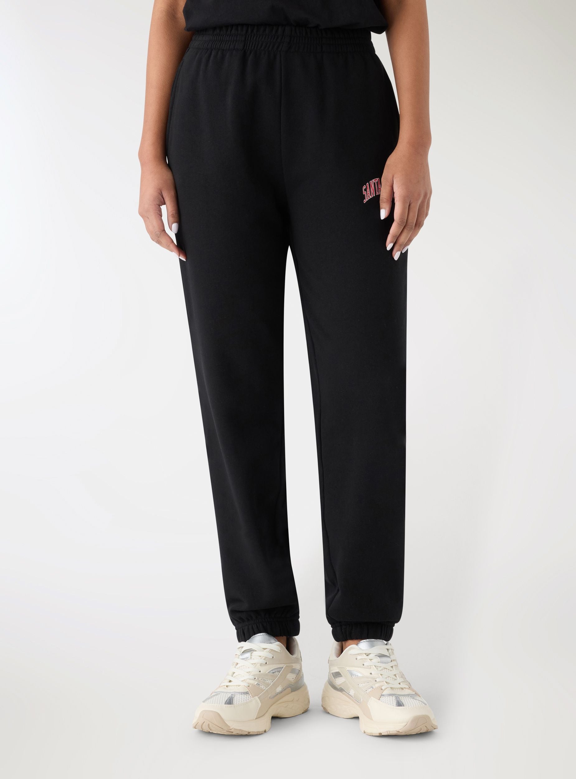 Pantallona sportive për femra me ngjyrë të njëtrajtshme dhe me shkrim kolegji. Bel i lartë me elastik dhe fundi i këmbës me manshetë. Ideale për kohën e lirë, palestër apo udhëtime, kombinohen me triko me kapuç ose fanella dhe atlete. Përshtatje normale, gjatësi në kyçin e këmbës, xhepa anësorë praktikë.