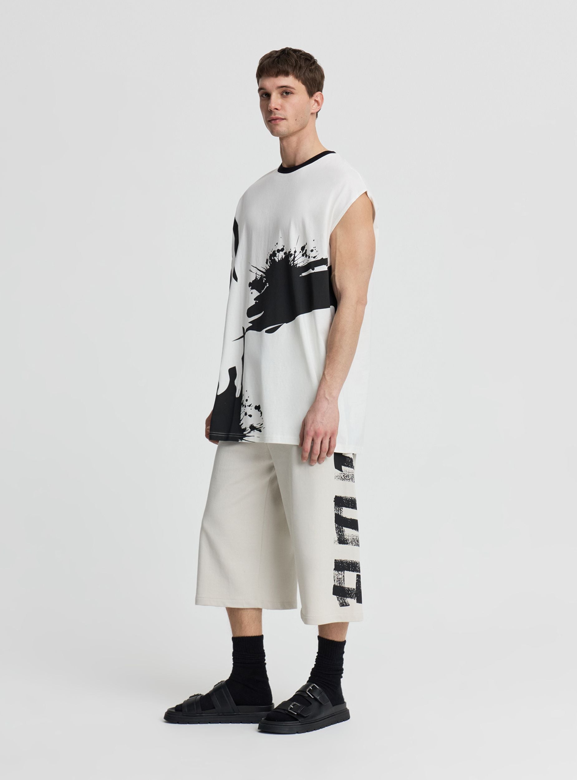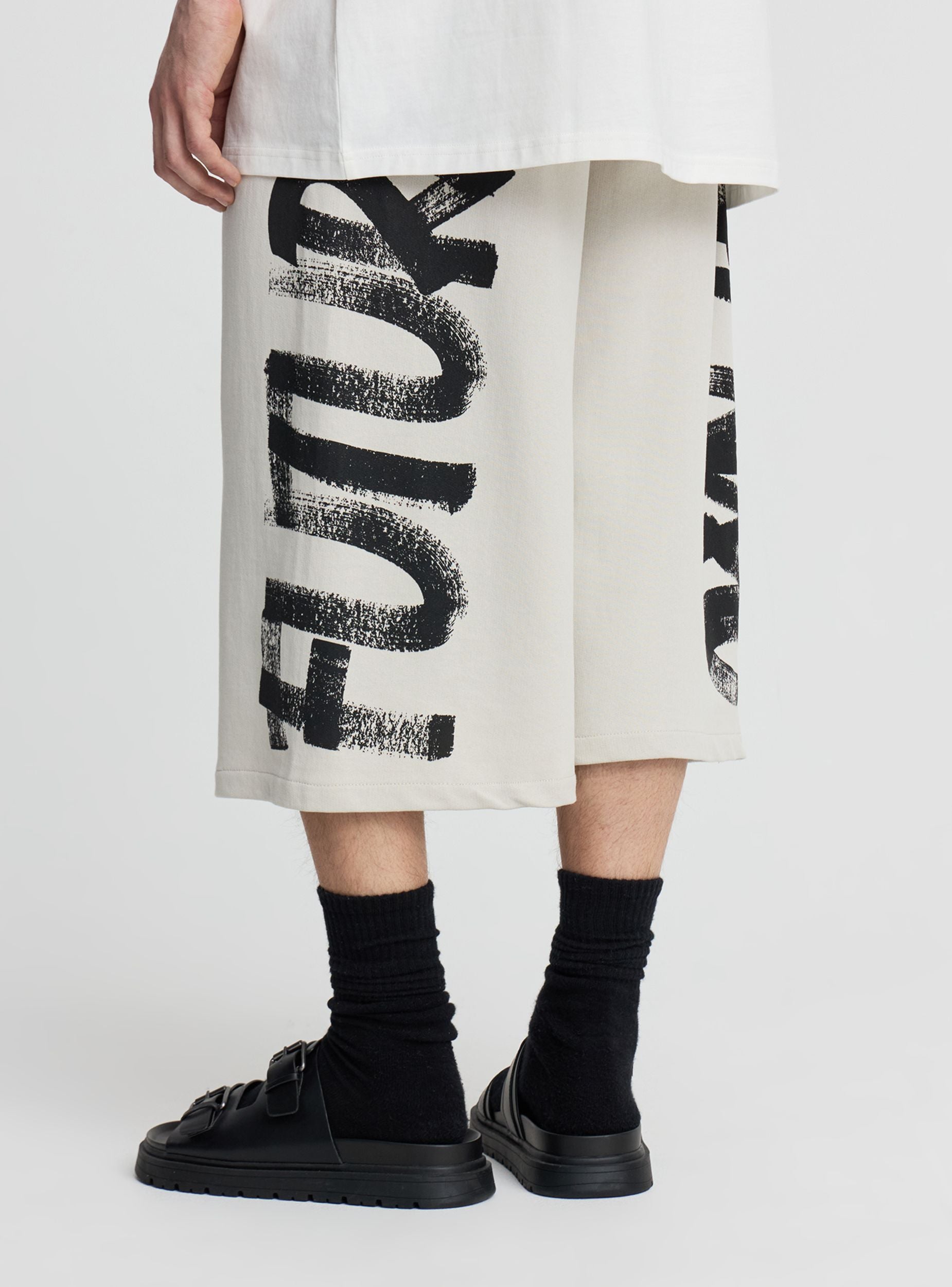 Pantallona të shkurtra për burrat prej materiali të lehtë. Stil urban me printim me shkronja në efekt grafiti në këmbë. Model super i gjerë me brez elastik dhe lidhëse të rregullueshme për rehati dinamike. Xhepa anësorë me zinxhir dhe xhep pasme me zinxhir për të ruajtur gjërat e vogla me siguri. Të përshtatshme me xhup dhe atlete për kohën e lirë.Detajet