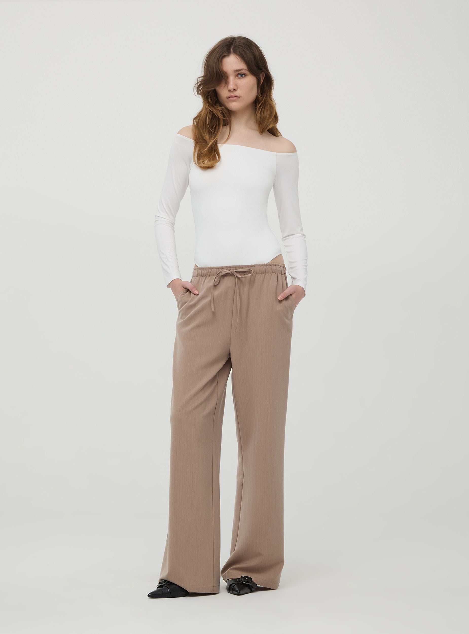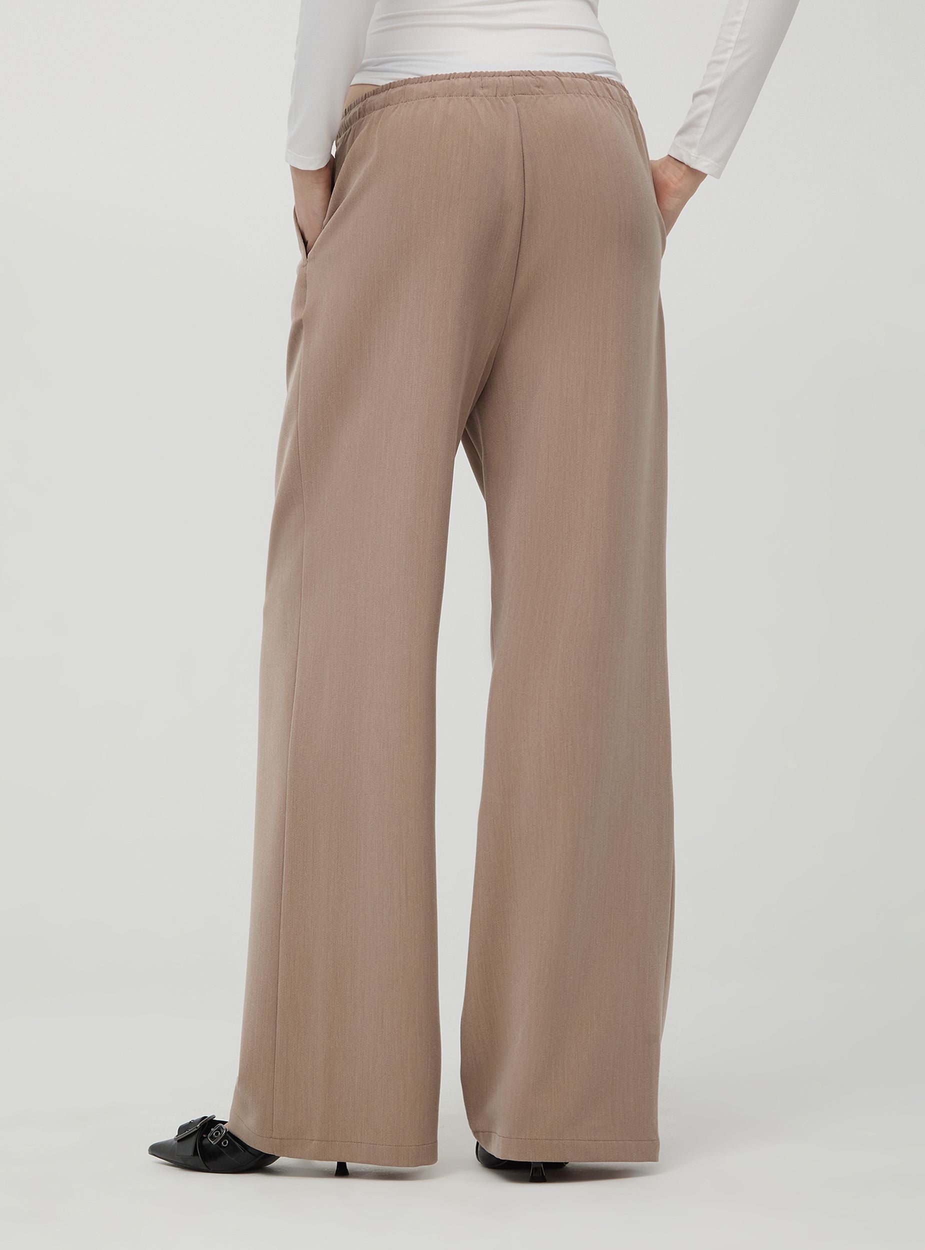 Pantallona për gra modeli wide leg, me kulisë në bel dhe xhepa anësorë. Të realizuara në stof poliviskoz me efekt melange. Një pjesë must-have për të pasur në gardërobë, perfekte për një pamje të rastësishme dhe komode. Përshtatje e gjerë.Detajet