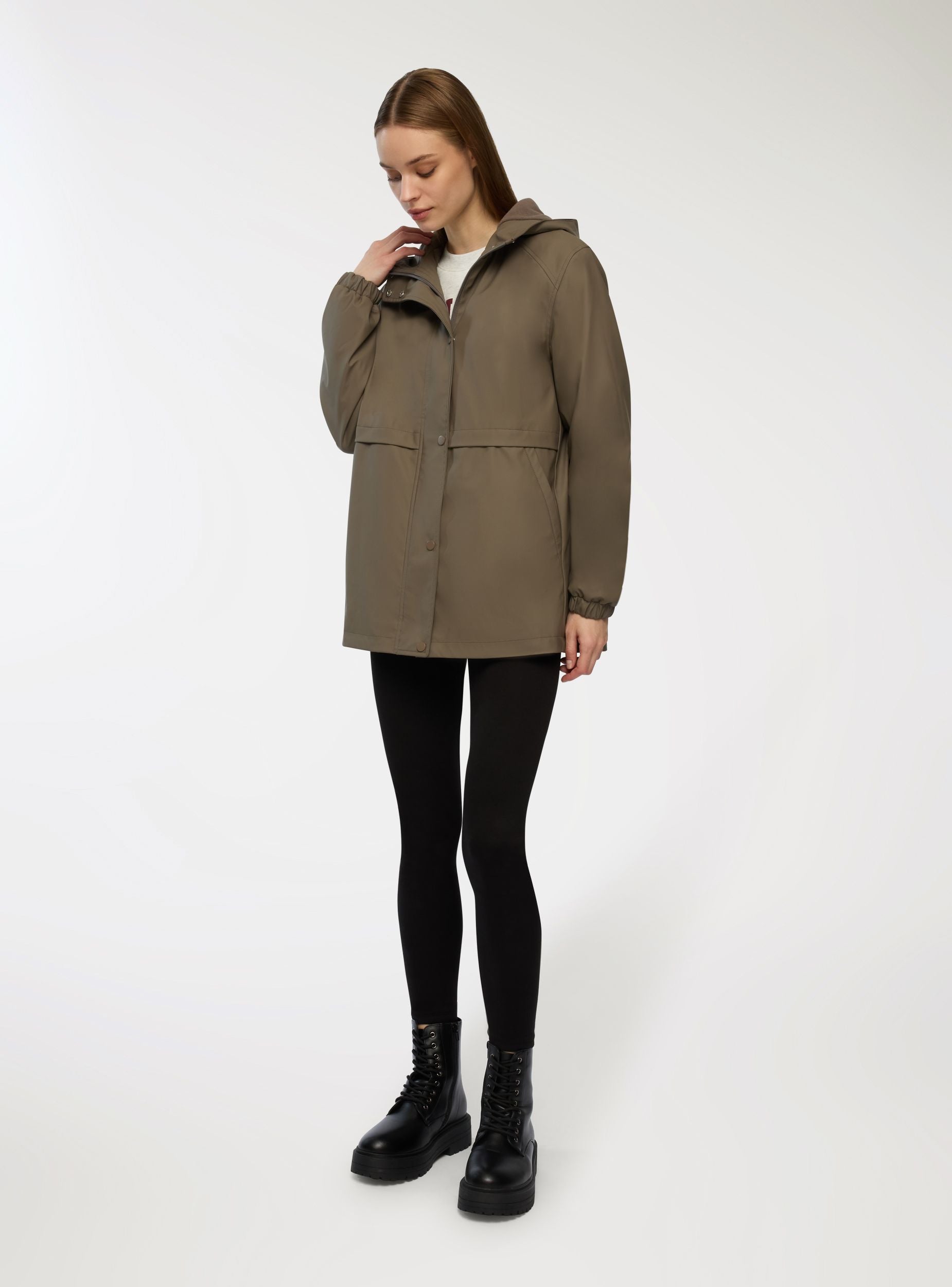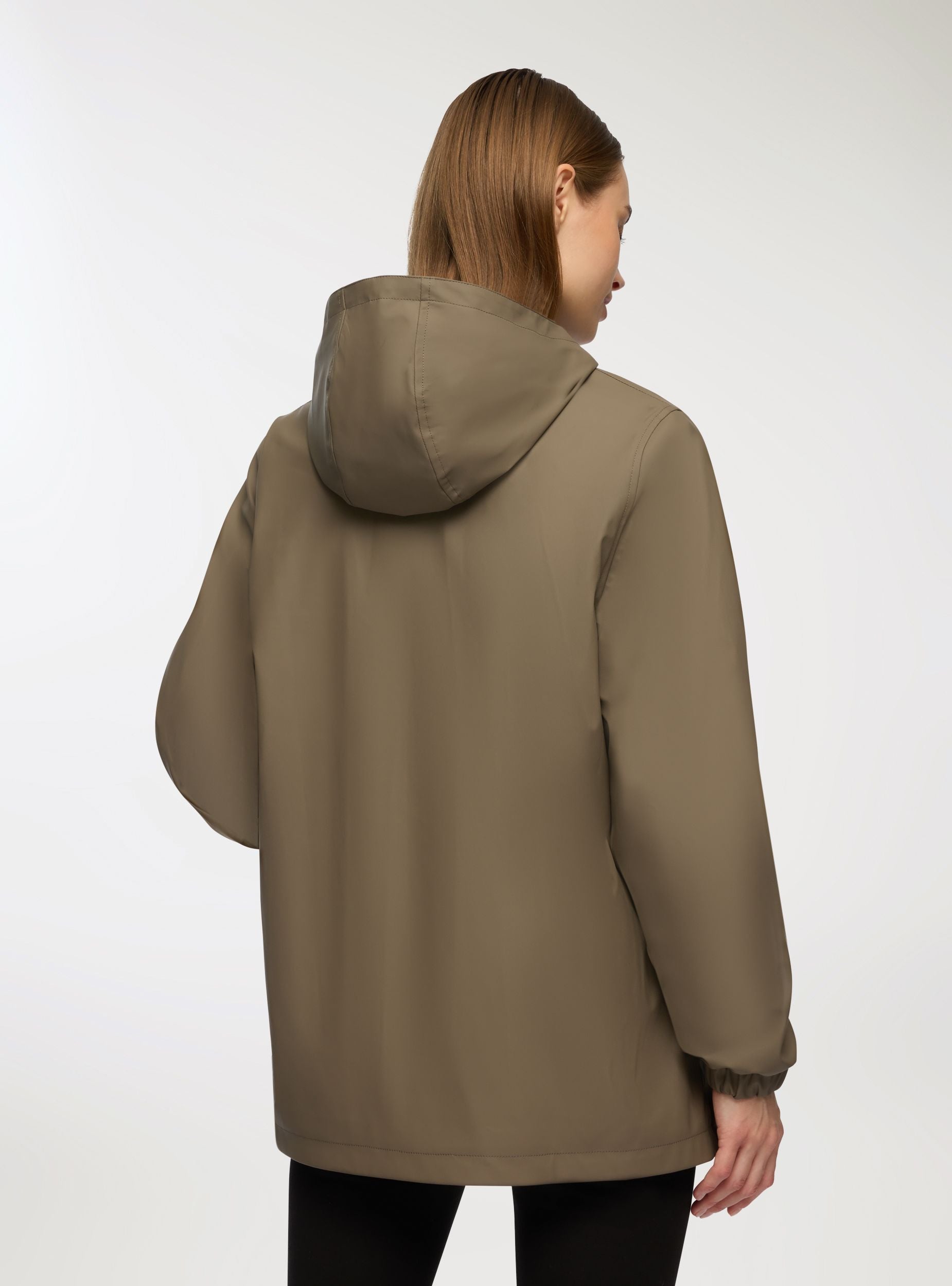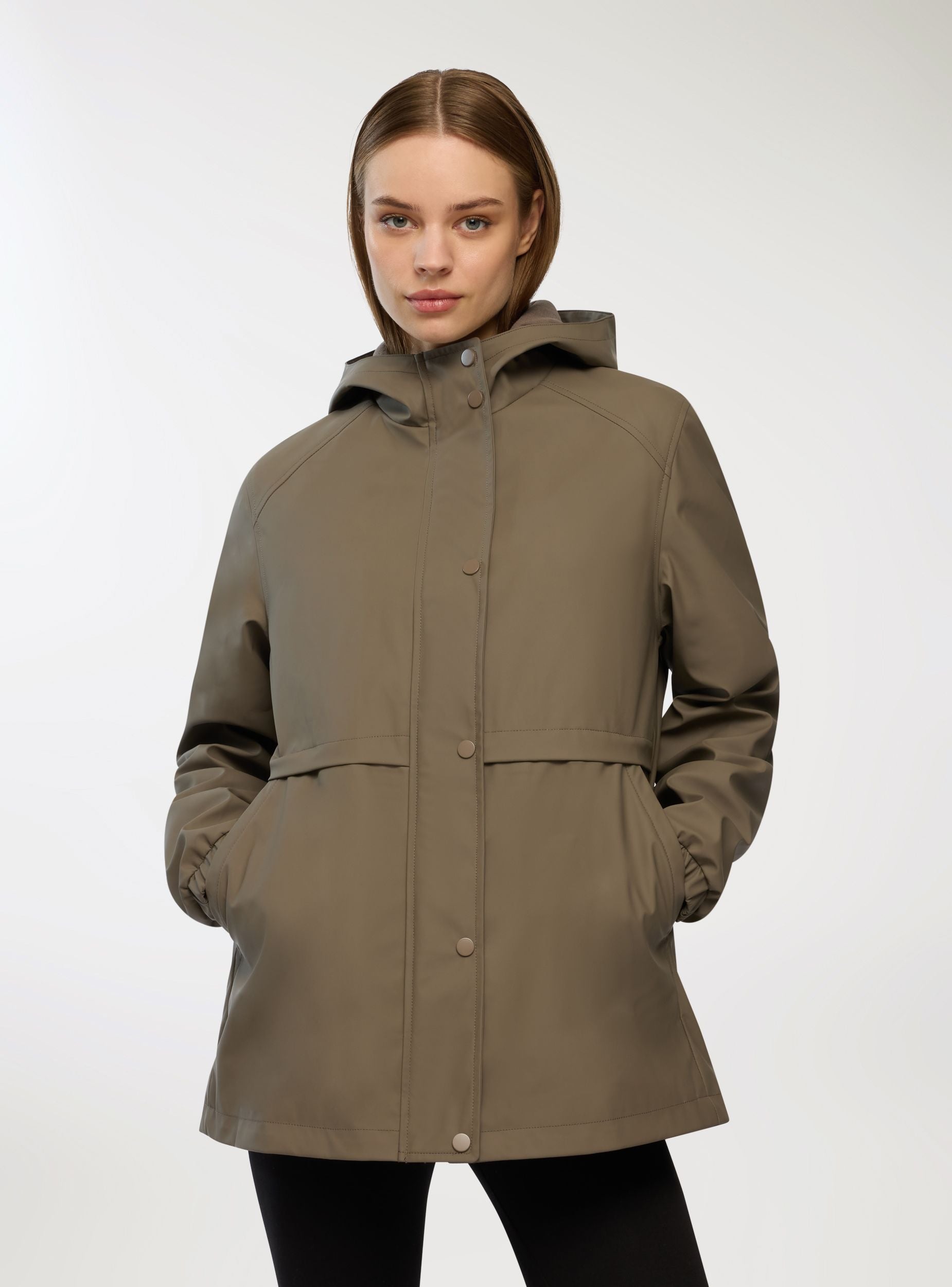 Xhaketë impermeabile për gra me kapuç për mbrojtje optimale, e pajisur me mbyllje me butona me shtypje dhe zinxhir, si dhe xhepa anësorë për më shumë praktikë. Pllaka me veti water repellent dhe water resistant është trajtuar për të shpëlarë ujin në kontakt dhe për të rezistuar depërtimit të lagështirës gjatë ekspozimeve të shkurtra ndaj shiut. Përshtatja e rregullt e bën të rehatshëm për përdorim të përditshëm, ndërsa dizajni minimalist e bën të përshtatshëm për t’u kombinuar me xhinse dhe atlete.Detajet