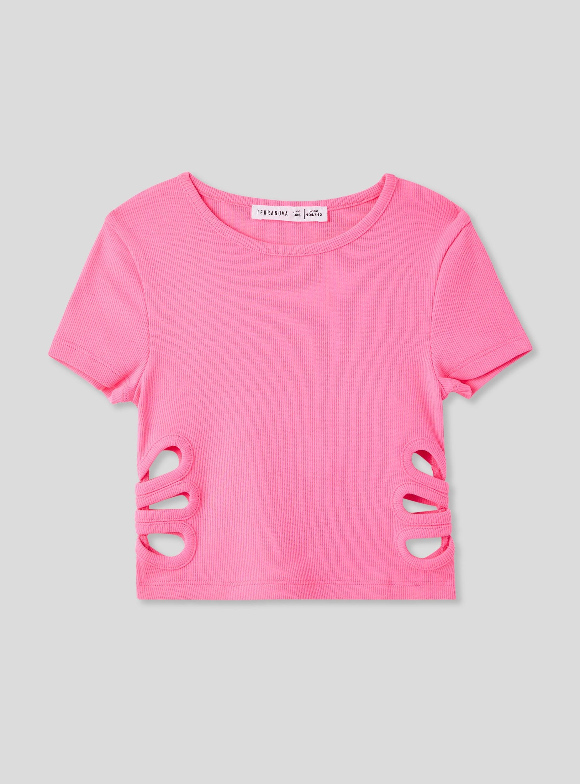 T-shirt për vajza e përsosur për një pamje trendy dhe të çlirët. Dizajni i shkurtër e bën ideale për ditët më të ngrohta, ndërsa detaji i prerjes anash shton një prekje origjinale dhe moderne. Mëngët e shkurtra dhe qafa e rrumbullakët garantojnë komoditet dhe liri lëvizjeje. E shumëanshme dhe e lehtë për t'u kombinuar me shkurtër, xhinse ose funde, është e përsosur për kohën e lirë, daljet me miqtë ose një ditë me familjen.Detajet
