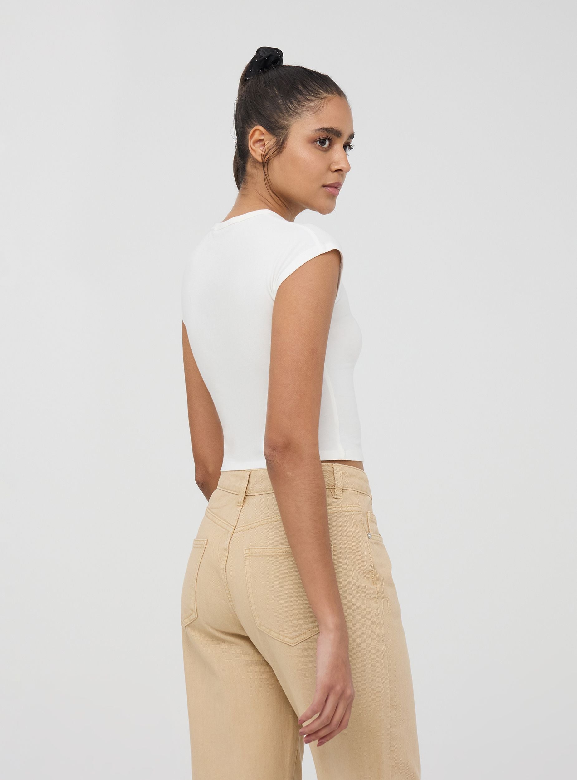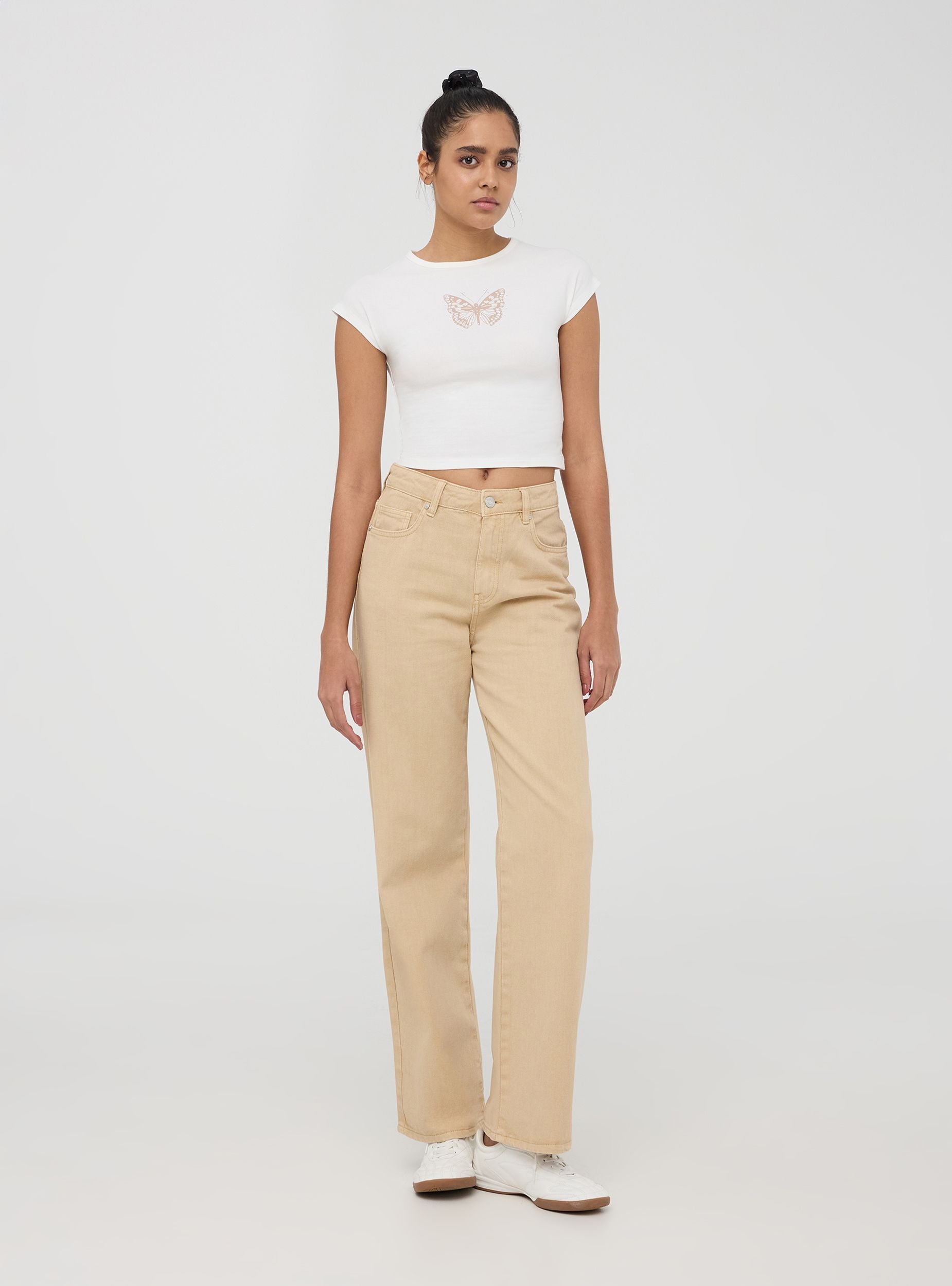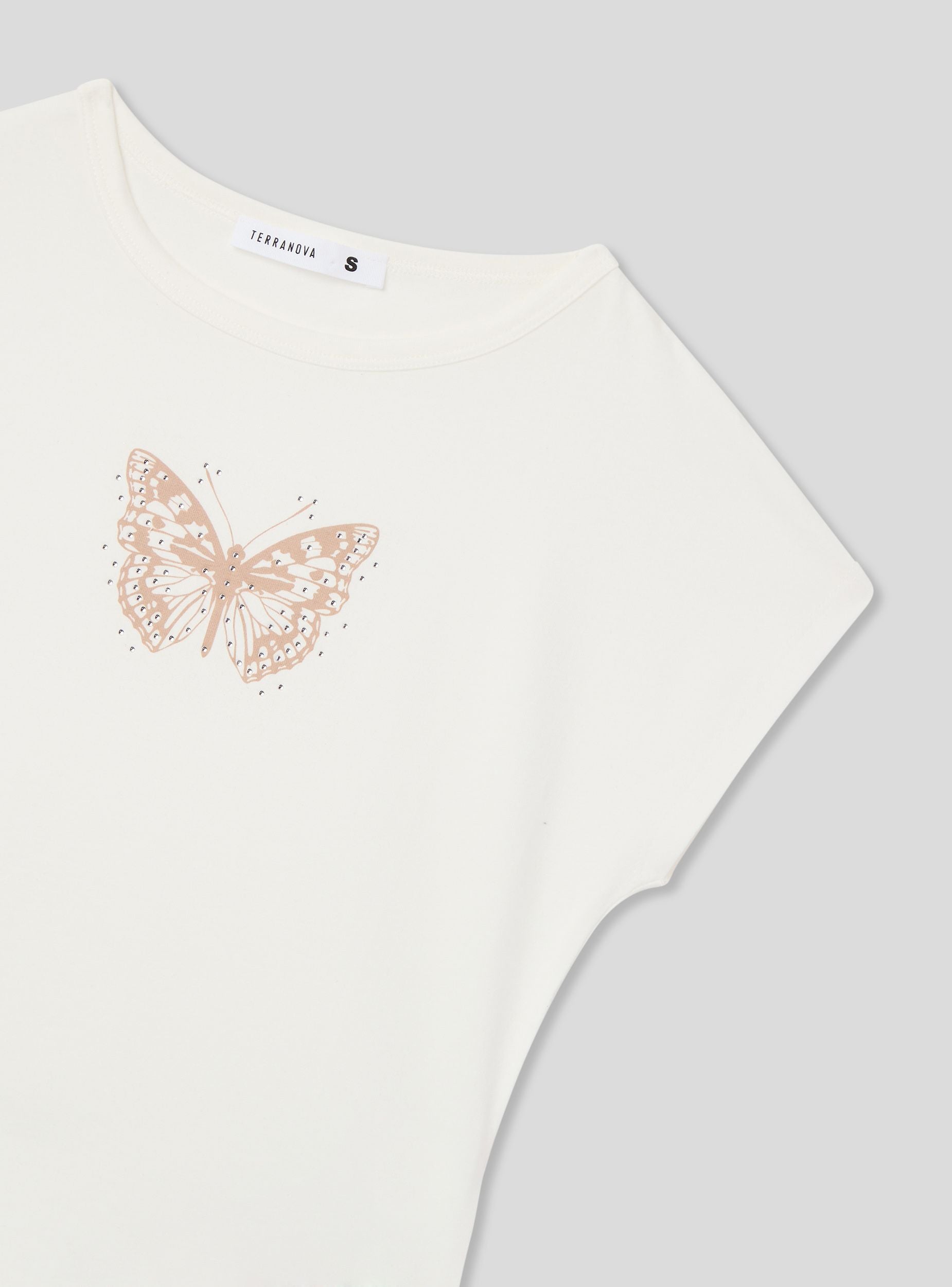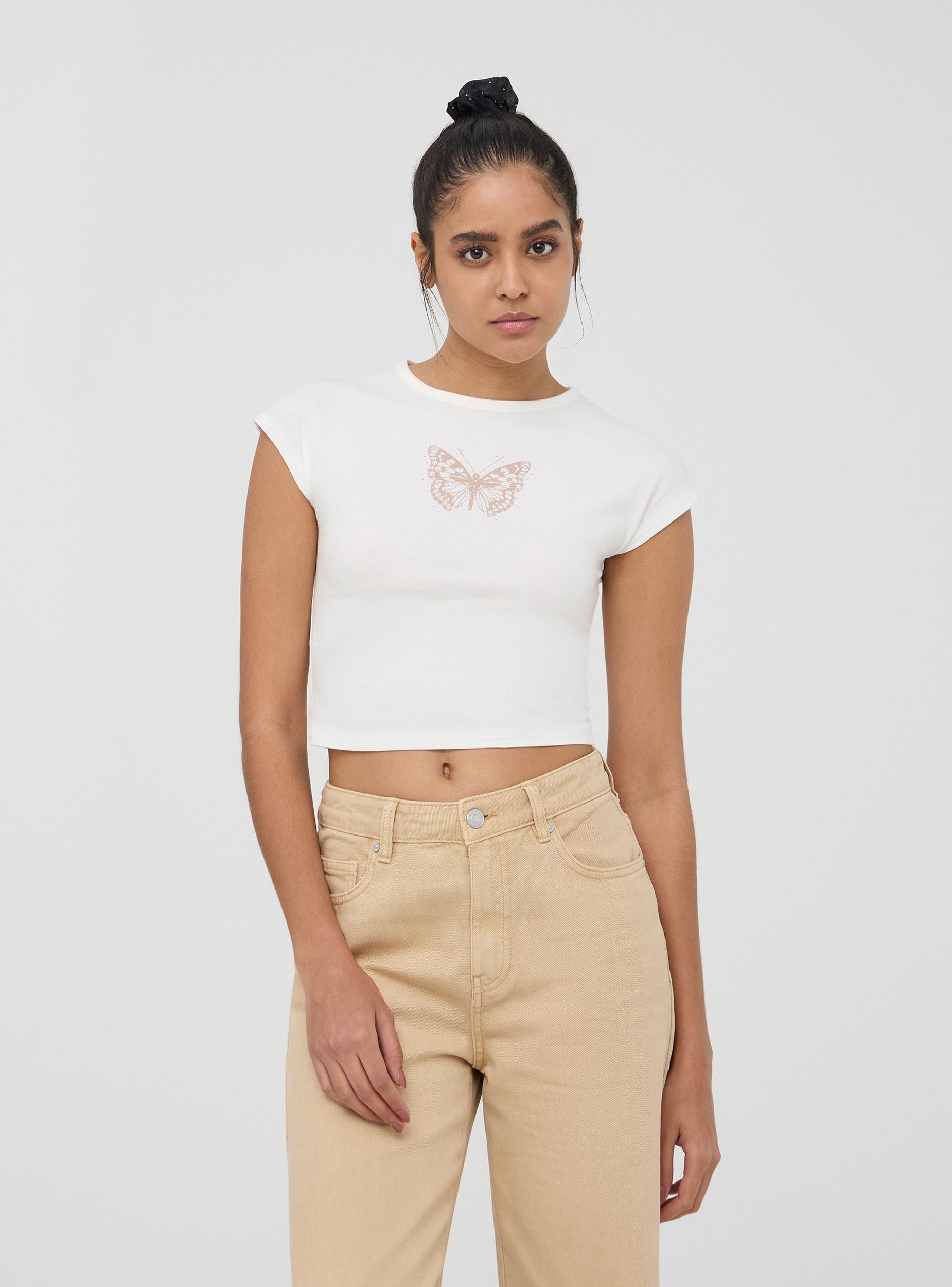 Bluzë për gra e shkurtër me një dizajn tërheqës e karakterizuar nga një printim fluture në pjesën e përparme. Flutura është e zbukuruar me aplikacione strass që i japin një prekje shkëlqyese veshjes, duke e bërë atë unike. Mëngët e shkurtra ofrojnë komoditet dhe freski, ndërsa prerja e shkurtër e bën të përshtatshme për kombinime moderne dhe të rastësishme, duke theksuar siluetën në një mënyrë stilike. Ky model bashkon detaje delikate me një përshtatje bashkëkohore.Detajet
