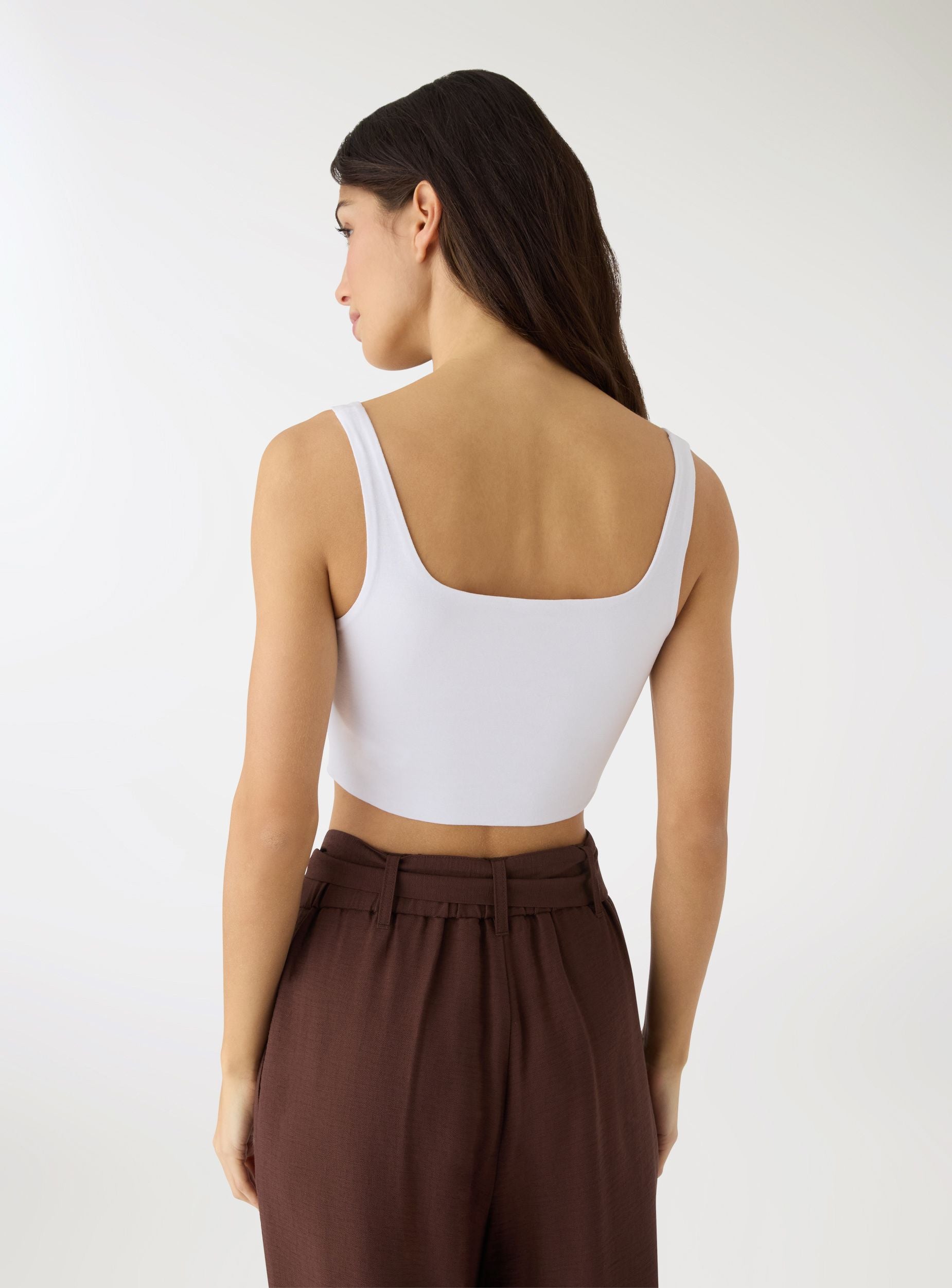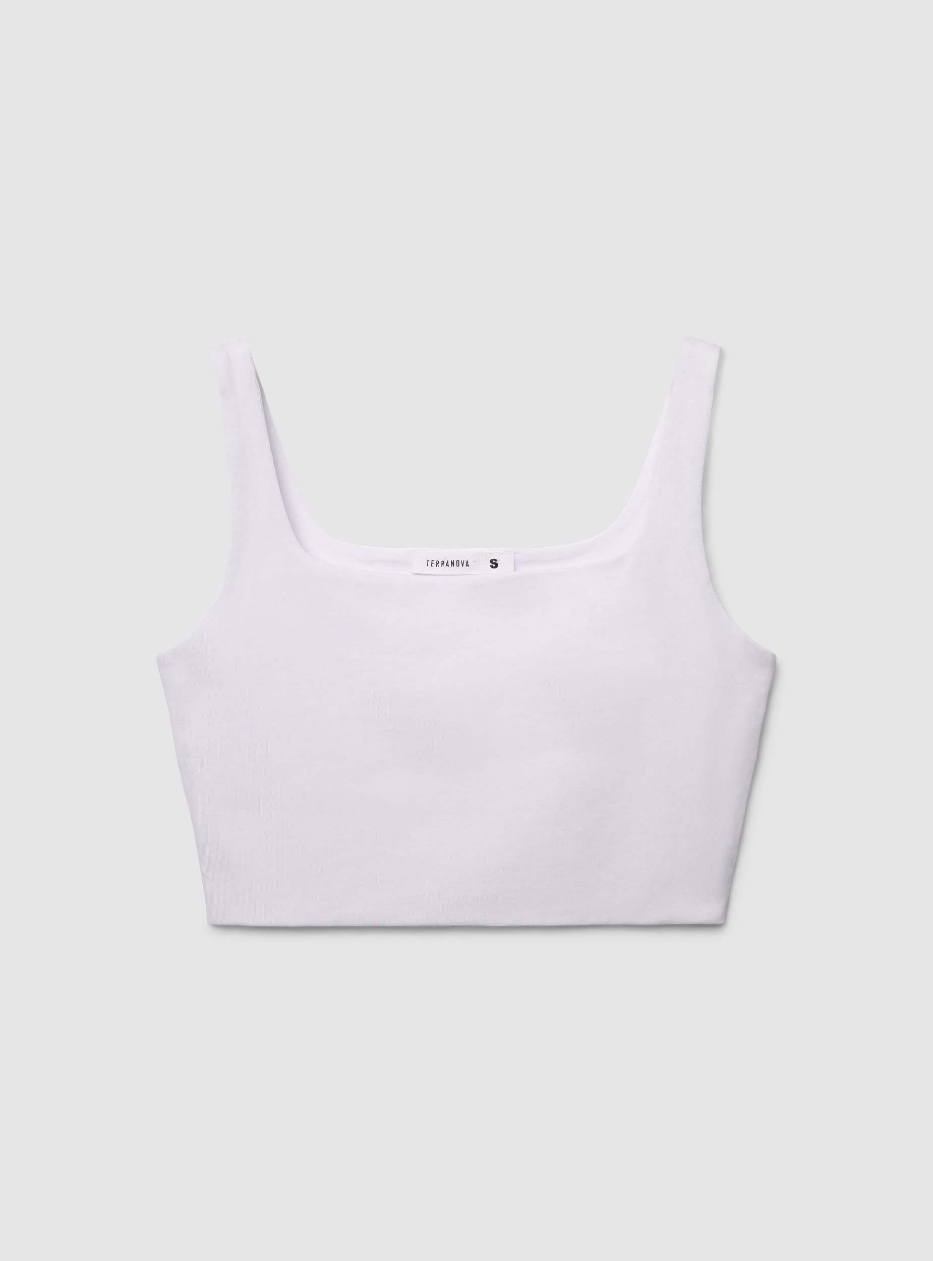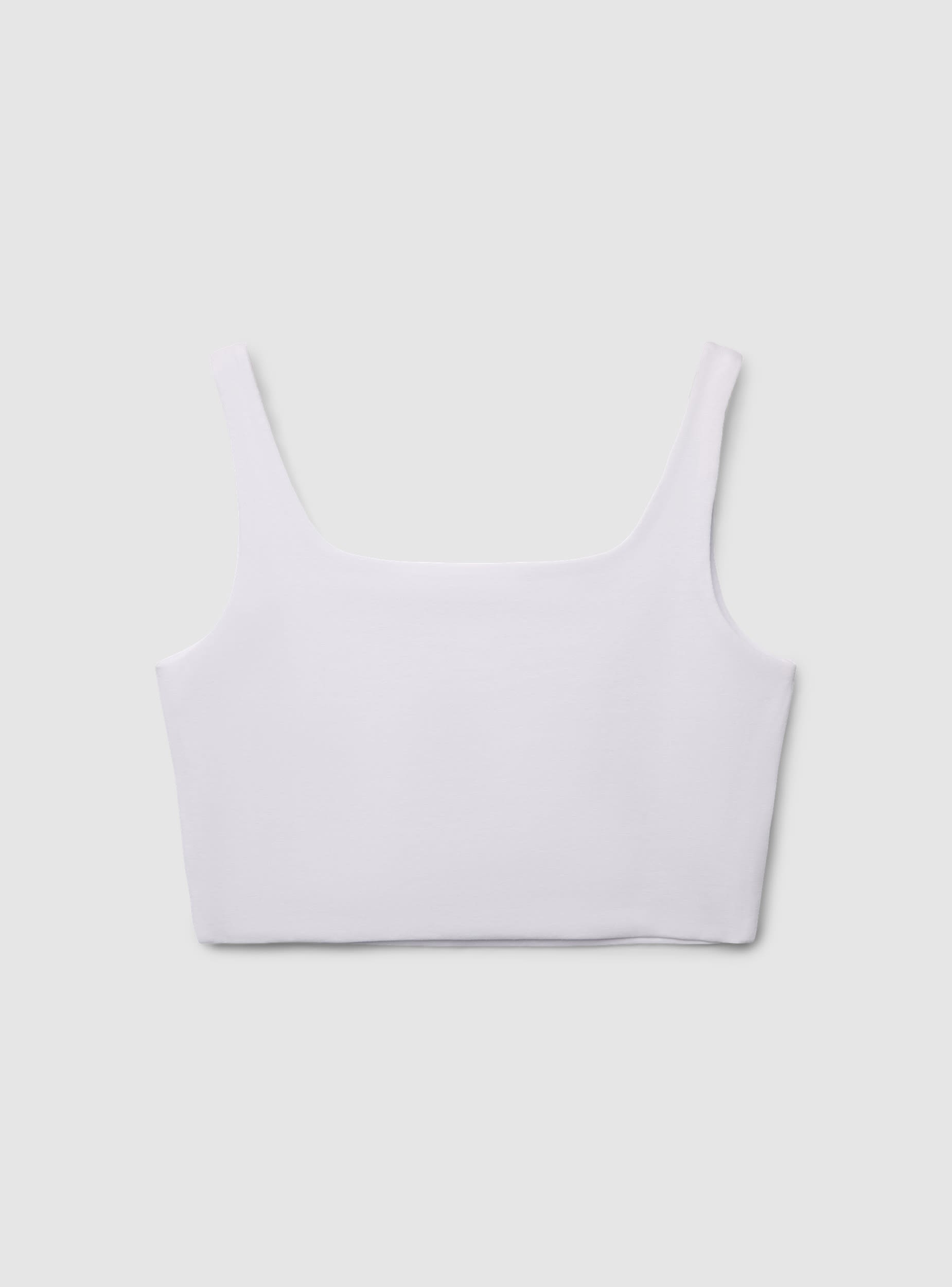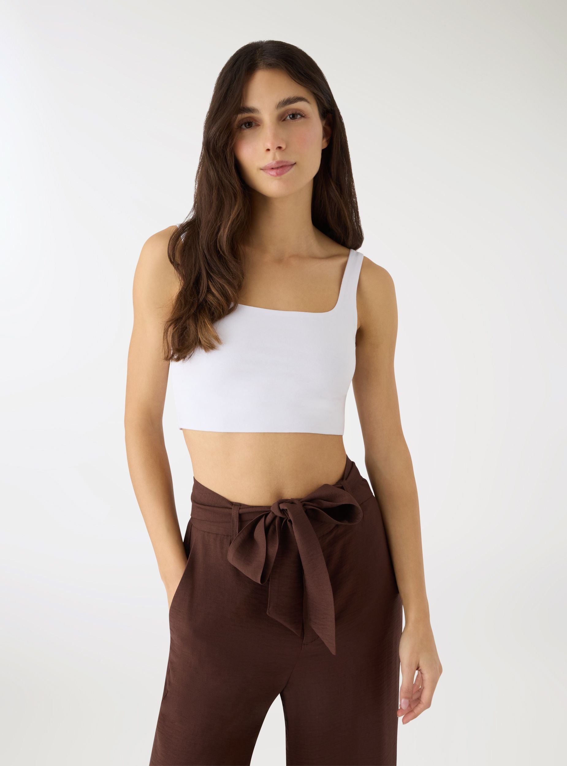 Top për femra me ngjyrë të njëtrajtshme, me prerje të shkurtër dhe qafë katrore. I përshtatshëm për një stil casual dhe trendy, kombinohet me xhinse me bel të lartë, funde ose pantallona të shkurtra për kohën e lirë. Brezë të gjera për më shumë rehati, përshtatje ngushtë që thekson figurën. Ideal për t’u veshur nën këmisha të hapura ose pulovra të lehta, ofron shumëllojshmëri në shtresat gjatë stinës së ngrohtë.Detajet