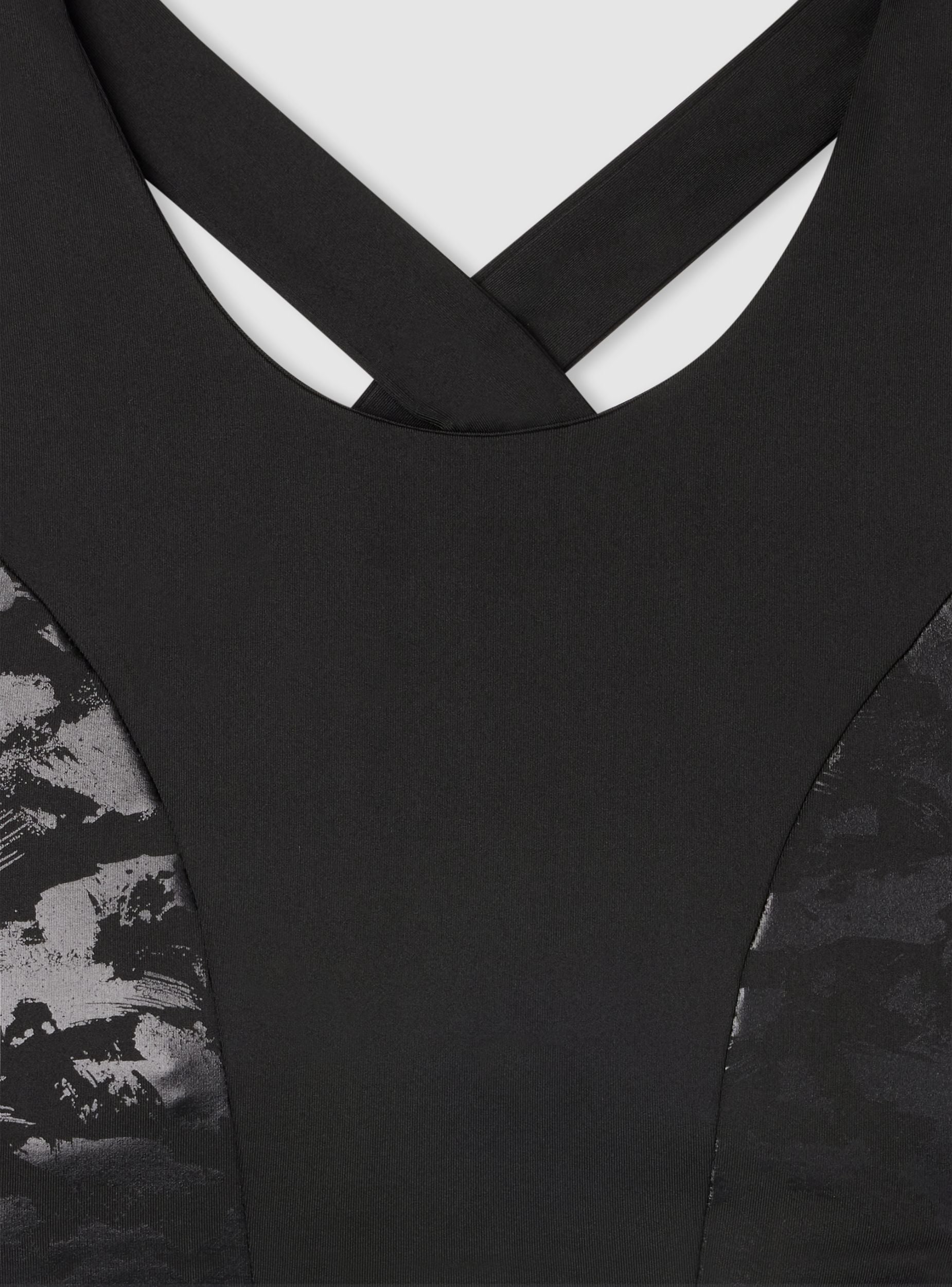 Top sportiv për gra, ideal për stërvitje në palestër ose aktivitete fitness. Dizajni ka një dekolte të rrumbullakosur dhe breza të gjerë që kryqëzohen në shpinë, duke ofruar mbështetje dhe komoditet gjatë lëvizjes. Insertet me një model me efekt shkëlqim shtojnë një prekje moderne. Përshtatje ngjitur, perfekte për t'u kombinuar me legging ose pantallona sportive. Linja Active.Detajet