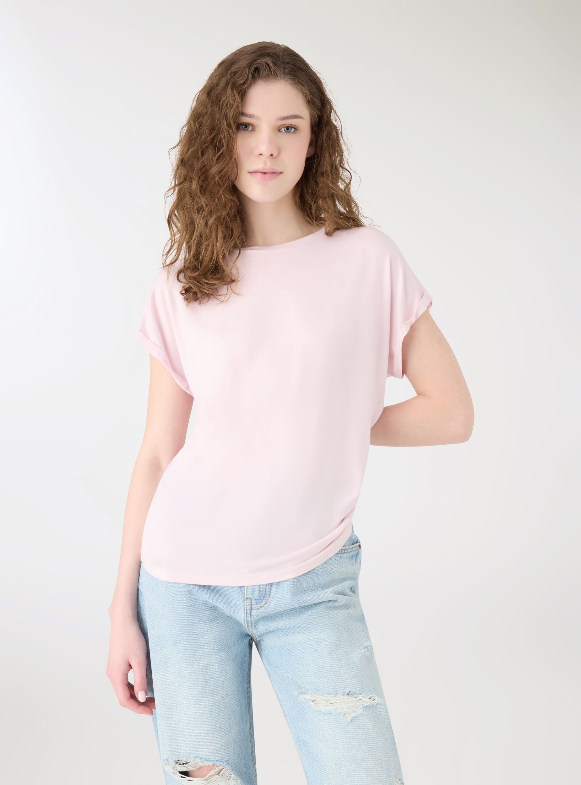 Triko femrash me ngjyrë të vetëm dhe përshtatje të lirshme. Me qafë rrethore dhe mëngë të shkurtra për një stil casual. Shumëfunksionale, perfekte për t’u kombinuar me xhinse, pantallona cargo ose fund midi. Ideale nën një xhaketë të lehtë ose një kardigan për veshje të përditshme të rehatshme dhe të kujdesshme.Detajet
