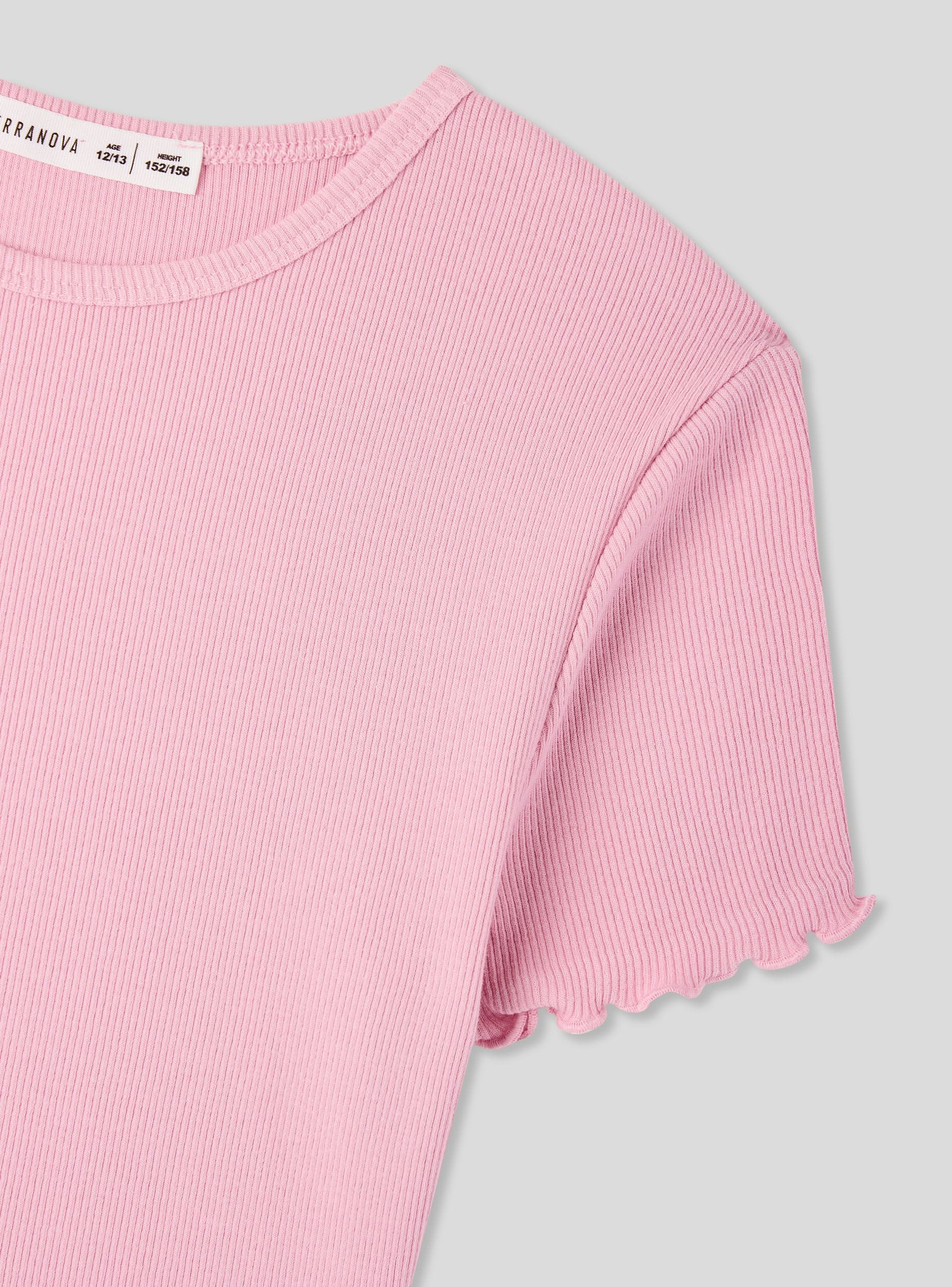 Të fëmijëve bluzë me prerje të shkurtër, ideale për një pamje të rastësishme dhe moderne. E përsosur për t'u kombinuar me xhinse ose shkurtore për një veshje freskuese dhe rinore. Bluzë ka një dizajn me vija të thjeshta dhe të njëtrajtshme, e përshtatshme për raste të ndryshme informale. Falë linjës së saj thelbësore, ajo mund të vishet si e vetme ashtu edhe nën një xhaketë të lehtë.Detajet