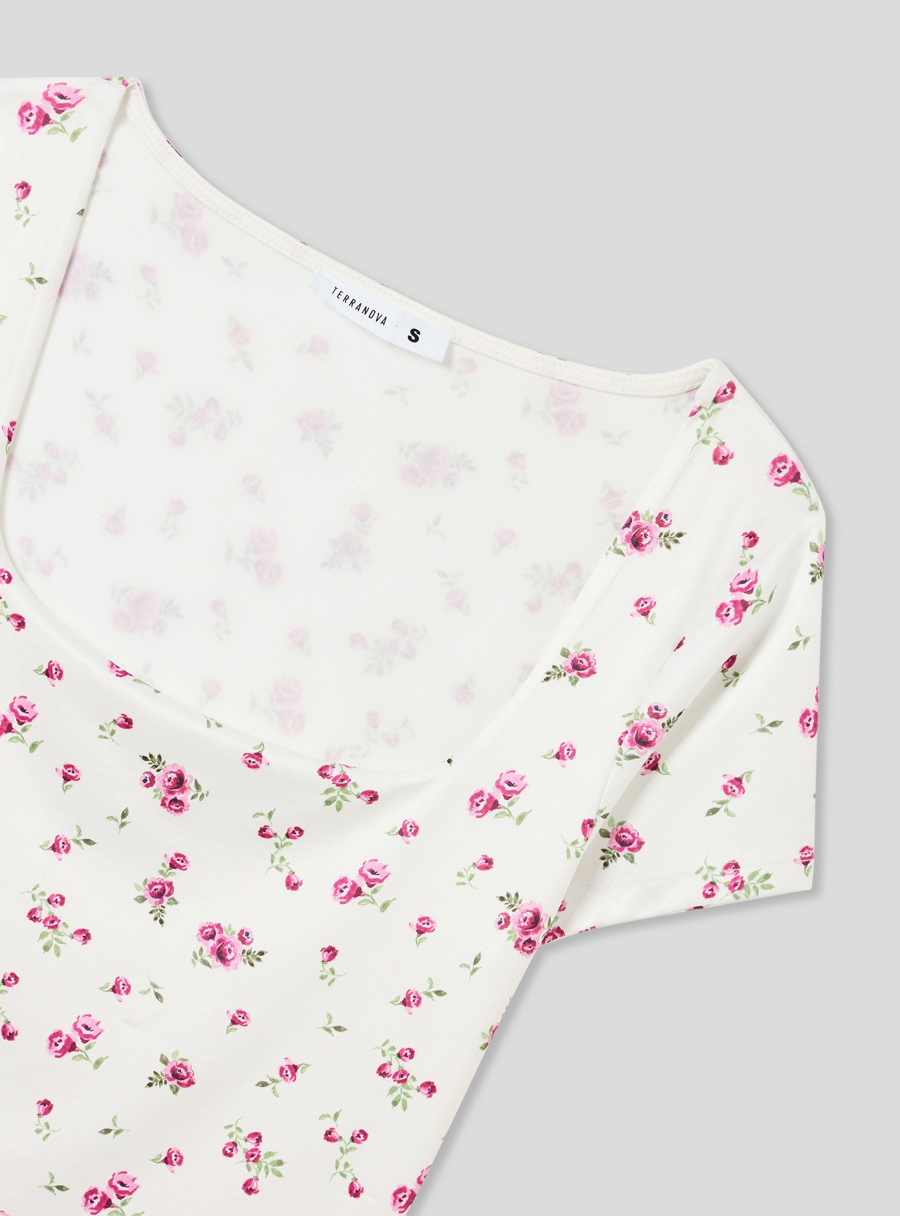 Të shkurtra për gra me një dekolte elegante katrore. Motivet luleve në të gjithë sipërfaqen i japin një prekje delikate dhe femërore këtij veshjeje. Të bëra nga takteli, ofron përshtatje dhe komoditet të shkëlqyer, duke ruajtur lehtësinë dhe freskinë ideale për sezonin veror. Një veshje shumë funksionale që mund të kombinohet si për pamje të rastësishme ashtu edhe për ato më të rafinuara, me një dizajn që thekson siluetën pa hequr dorë nga komoditeti.Detajet