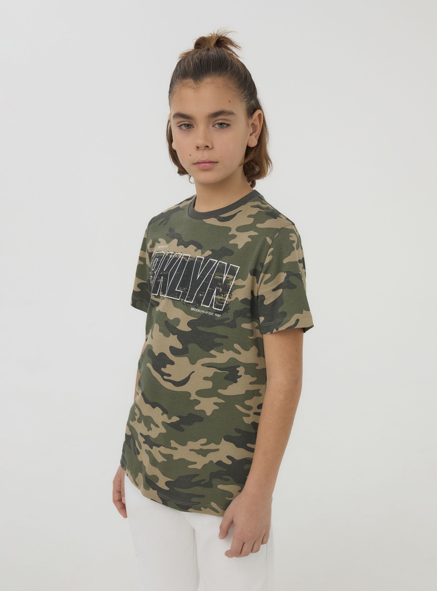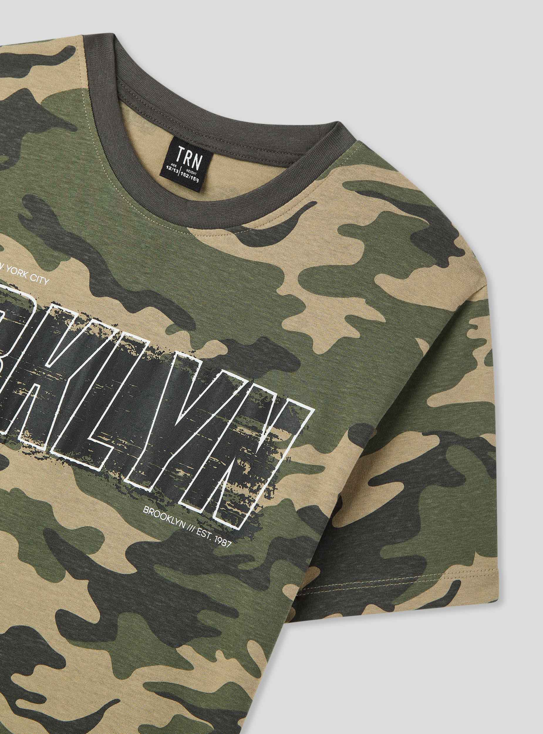 Të fëmijëve me stil të guximshëm dhe modern, e karakterizuar nga një print kamuflazhi dhe një shkrim me ndikim të madh. Mëngët e shkurtra dhe qafa rrethore sigurojnë komoditet dhe liri lëvizjeje. E përsosur për pamje të rastësishme dhe dinamike, kombinohet lehtësisht me xhinse, pantallona cargo ose bermuda. Ideale për shkollë, kohë të lirë ose aventura në natyrë me miqtë.Detajet