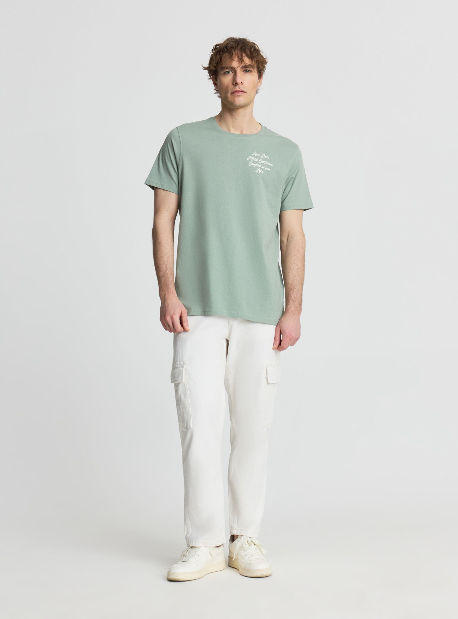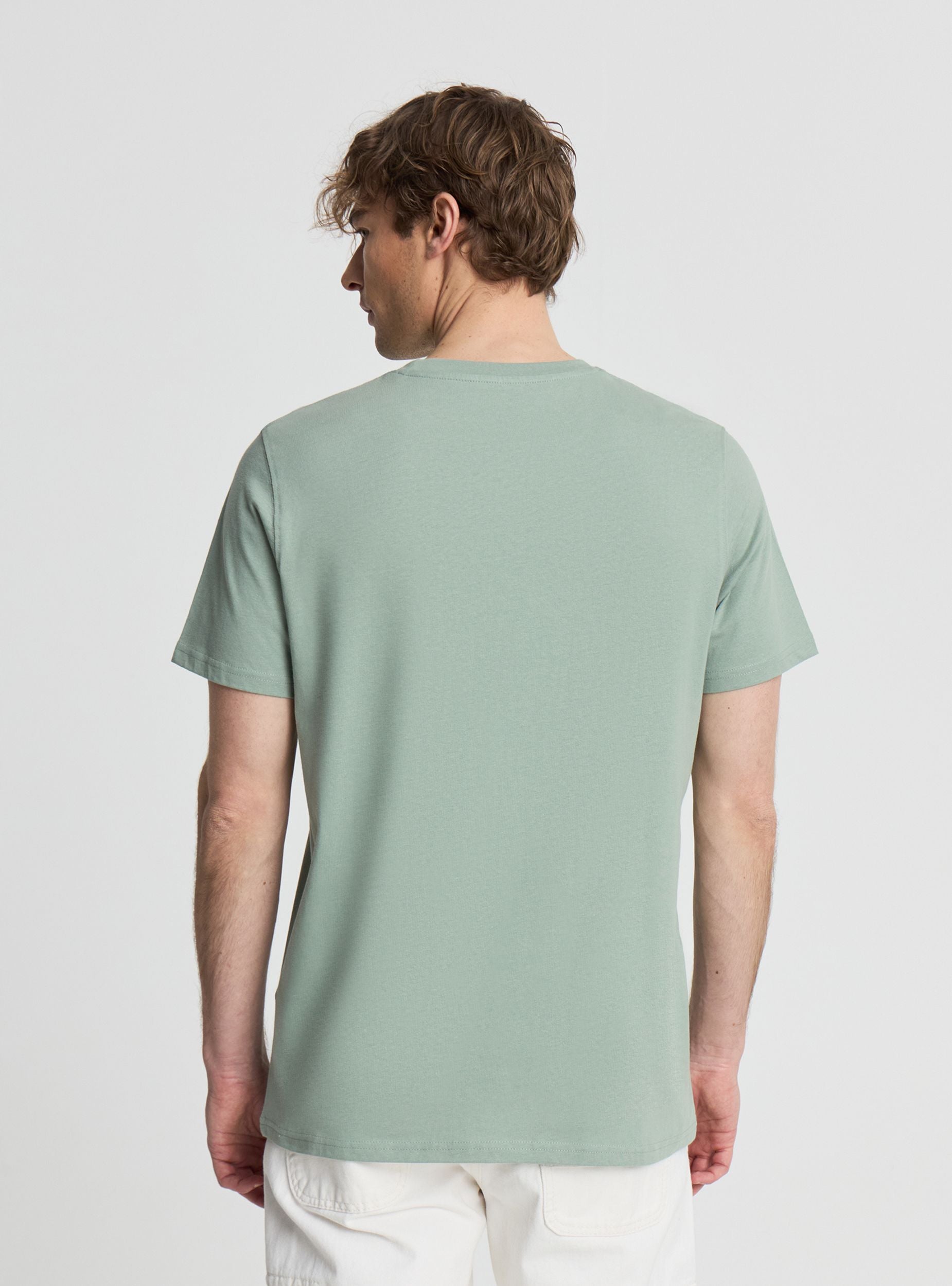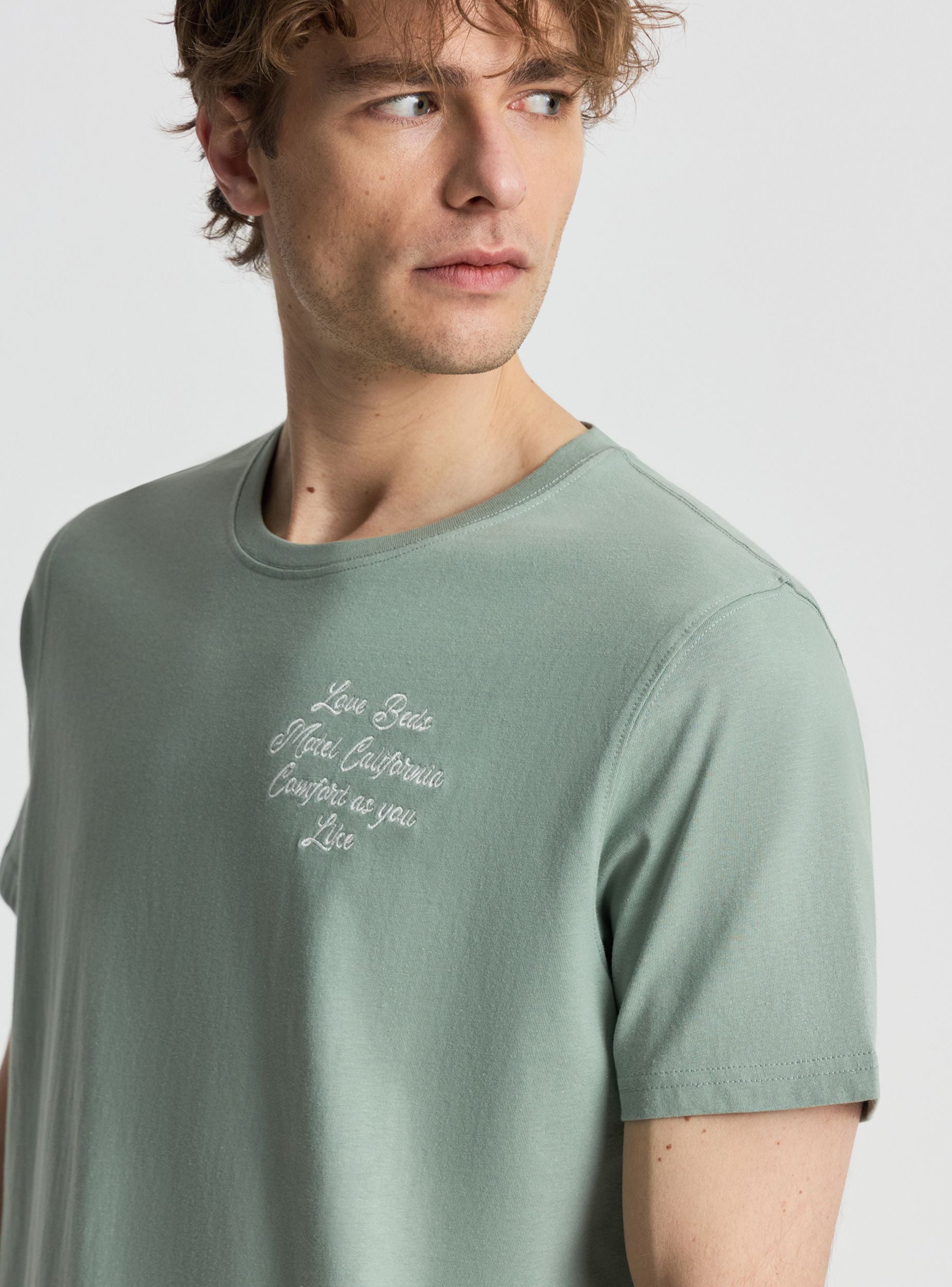 Triko me mëngë të shkurtra për meshkuj me qafë rrethore dhe qëndisje në pjesën e përparme. Përshtatje normale, perfekte për një stil të rastësishëm me xhinse ose pantallona chino dhe këpucë sportive. Strukturë prej jersei të rëndë e përcaktuar nga kodi industrial, ideale për përdorim të përditshëm nga mëngjesi deri në mbrëmje.Detajet