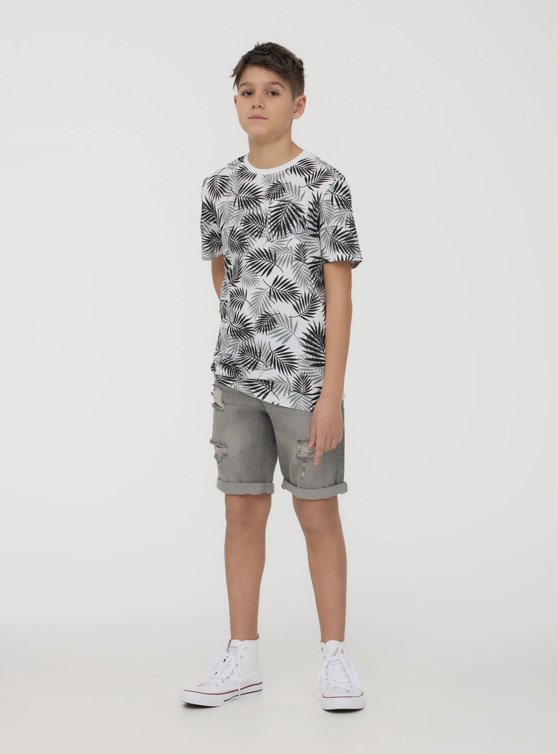 Të fëmijëve bluzë me stil të freskët dhe bashkëkohor, ideale për ditët e verës dhe aventurat në natyrë. Dizajni me mëngë të shkurtra dhe qafë rrethore siguron komfort dhe praktikë, ndërsa printimi me gjethe kudo i jep një prekje tropikale dhe dinamike. Xhepi i vogël në gjoks shton një detaj të rastësishëm dhe funksional. E përsosur me shkurtër ose xhinse për një pamje praktike dhe në modë.Detajet