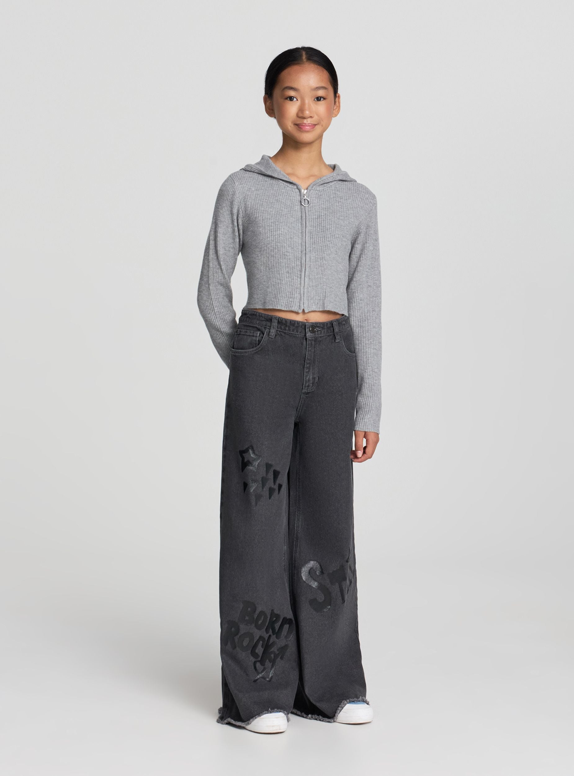 Xhinse për vajza me këmbë të gjera, perfekte për një stil casual dhe trendy. Model i gjatë me bel mesatar, mbyllje me buton dhe zinxhir dhe prerje klasike me pesë xhepa. Përshtatja e gjerë garanton rehati në lëvizje, ndërsa shkrimet dhe yjet shkëlqyese në pjesën e përparme dhe të pasme shtojnë një prekje rock. Idealë me triko ose bluzë dhe atlete për shkollë ose kohën e lirë.Detajet