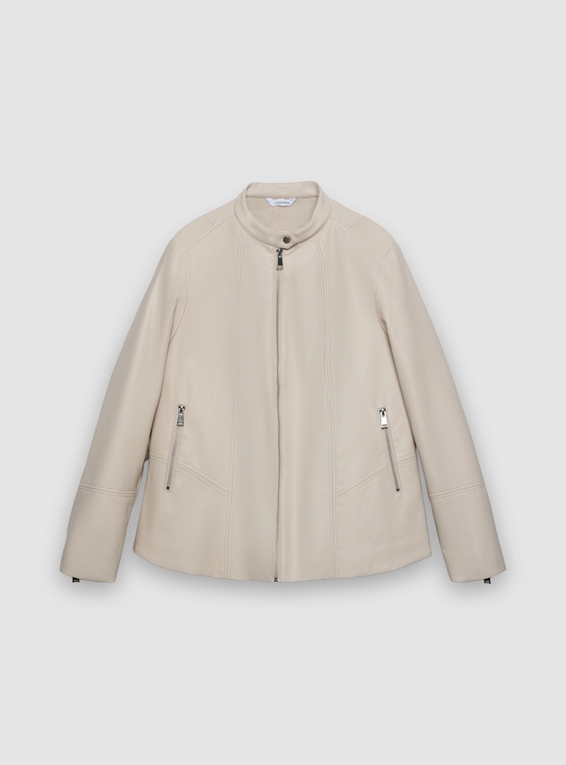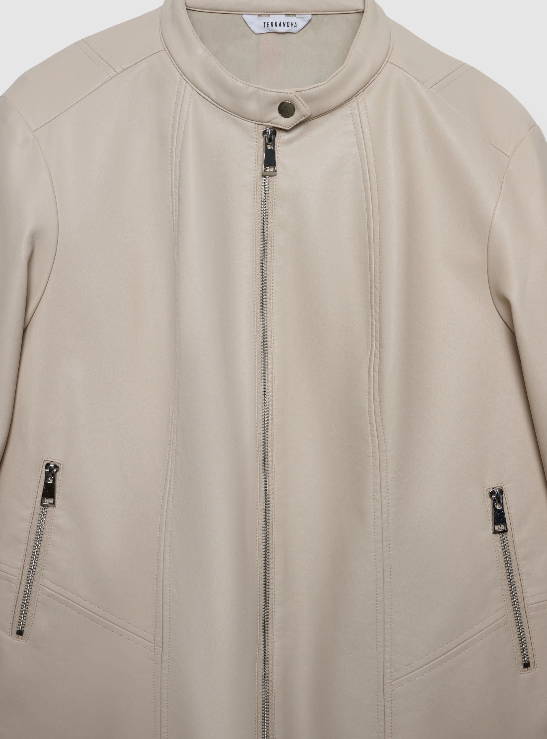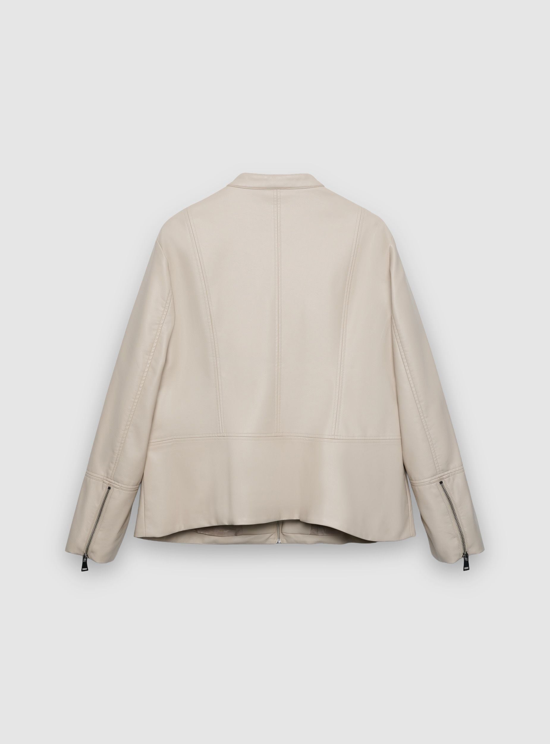 Ženska biciklistička jakna od eko kože, savršena za urbane i ležerne izglede. Dizajn sa kineskim kragnom zatvorenim kopčom na pritisak, prednji rajsferšlus i bočni džepovi sa rajsferšlusom. Blago prošireni kroj. Lako se kombinuje sa farmerkama i čizmama za slobodno vreme ili sa pantalonama za večernji outfit sa odlučnim karakterom.Detalji
