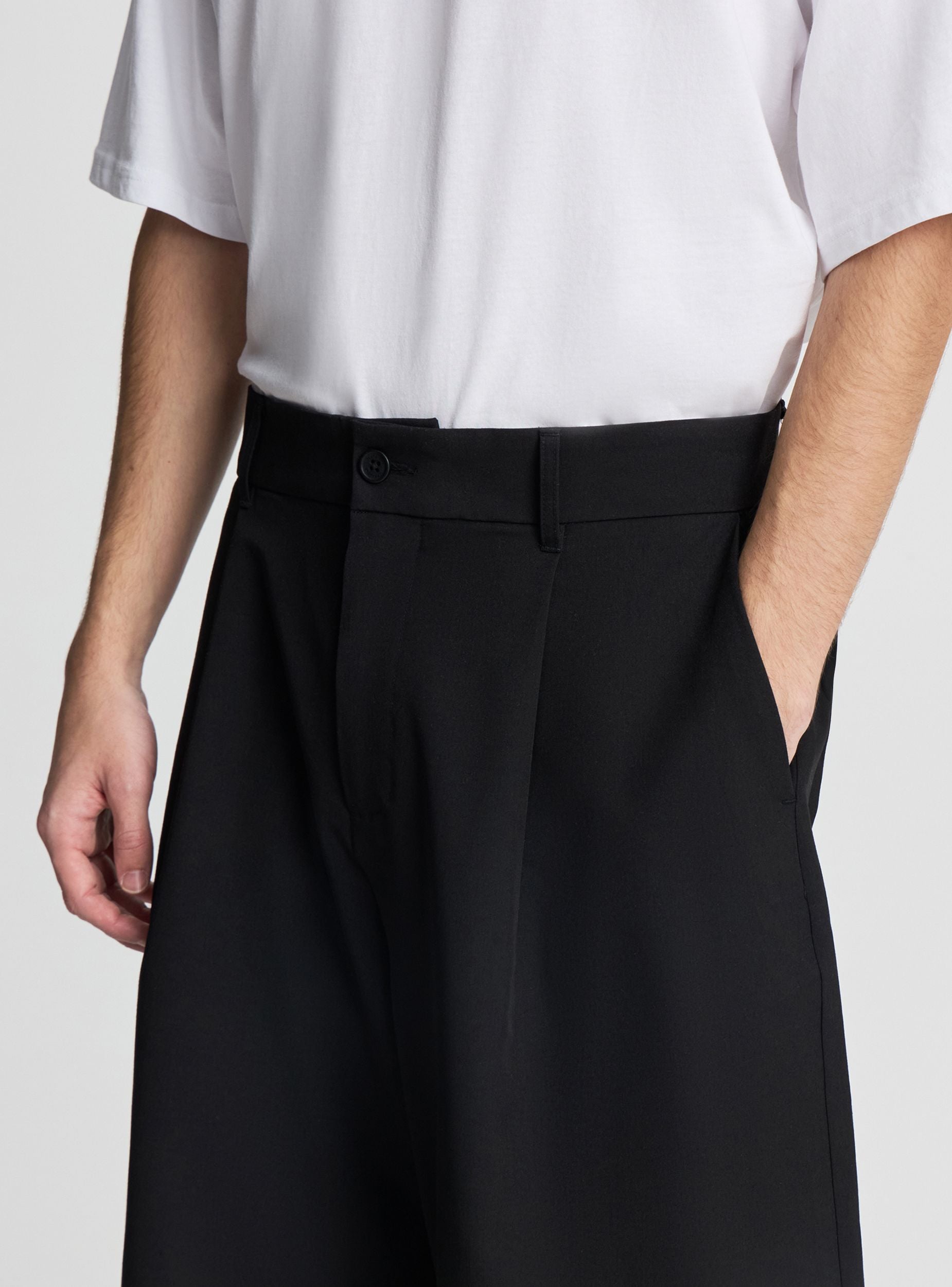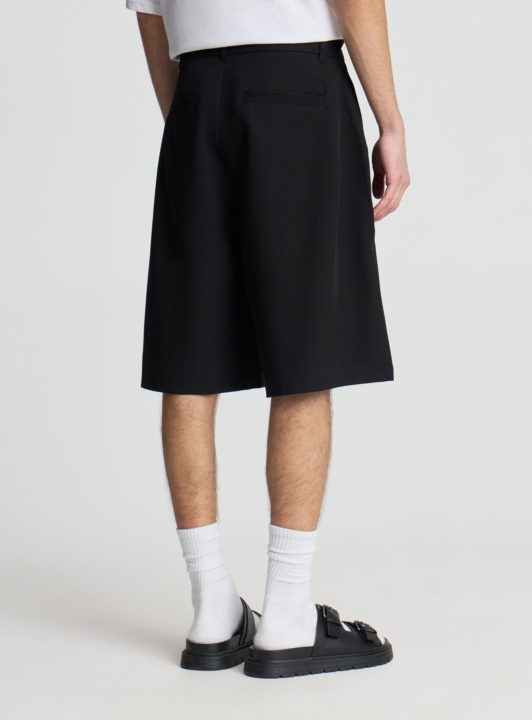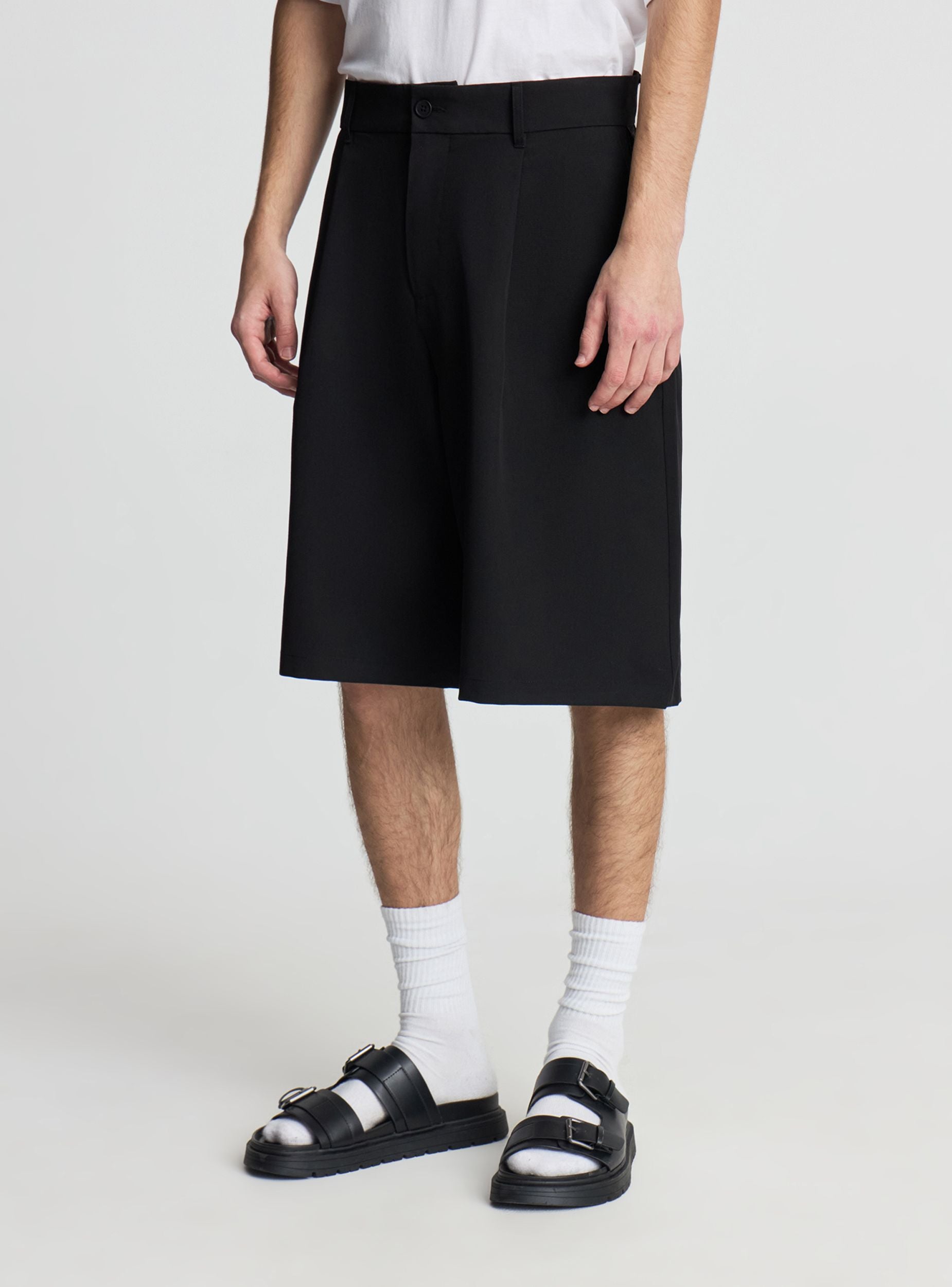 Muške bermuda pantalone u jednobojnoj varijanti, idealne za urbani stil i pametne prilike. Srednji struk sa petljama za kaiš, zatvaranje na dugme i rajsferšlus, kao i prednje nabore koji vizuelno izdužuju liniju. Bočni džepovi sa rezom i zadnji džepovi sa falcom za uredan izgled. Savršene u kombinaciji sa košuljom, polo majicom ili majicom, kao i patikama ili mokasinama.Detalji