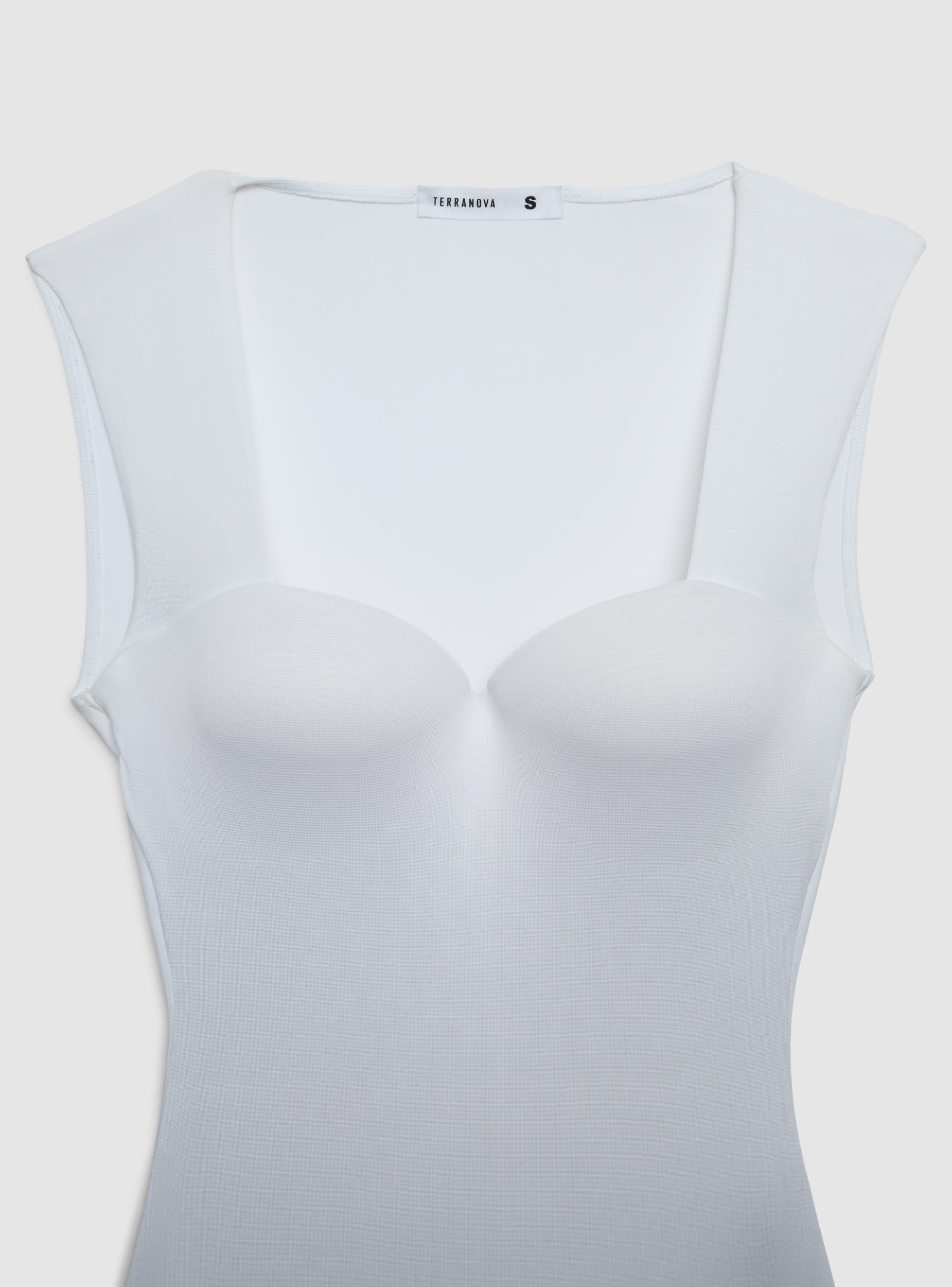 Ženski bodi u jednobojnoj varijanti sa izrezom u obliku srca i predoblikovanim korpicama. Prilagođeni kroj koji ističe siluetu, idealan ispod blejzera ili košulja za kancelarijski izgled i večernje prilike, ili uz farmerke i suknje za svakodnevne kombinacije.Detalji