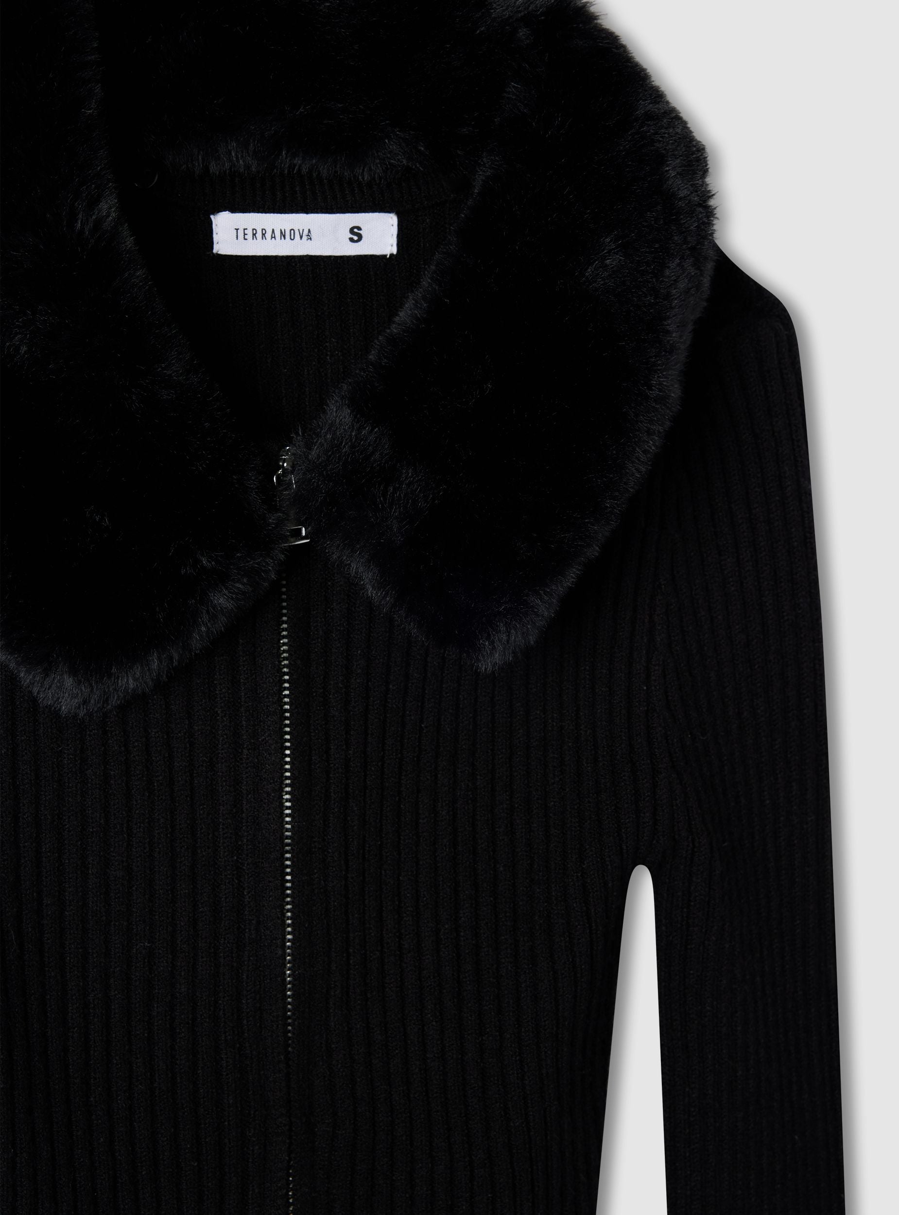 Ženski kardigan u jednobojnoj boji sa prednjim zipom i kragnom od veštačkog krzna, idealan za dodavanje sofisticiranog dodira svakodnevnim kombinacijama. Dizajn sa rebrastim detaljima ističe siluetu, dok duge rukave čine savršenim za hladne dane. Lako se kombinuje sa farmerkama ili suknjama za svestrane outfite, pogodne kako za posao, tako i za slobodno vreme.Detalji