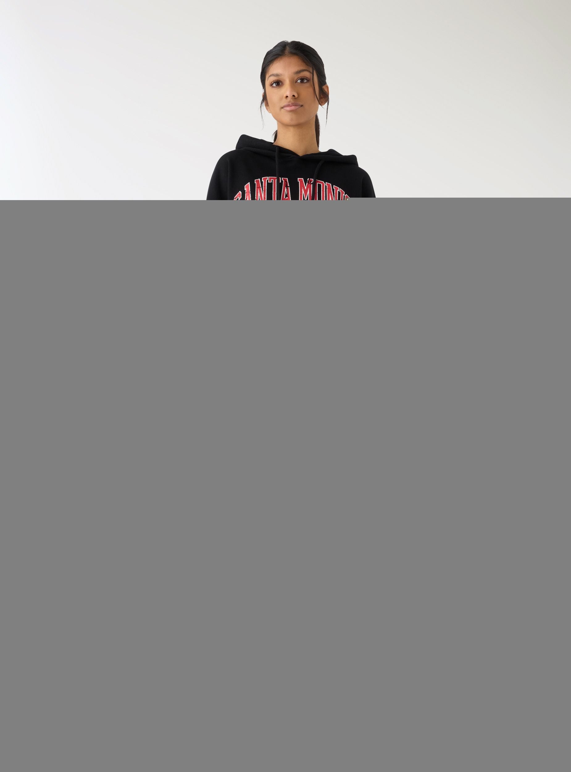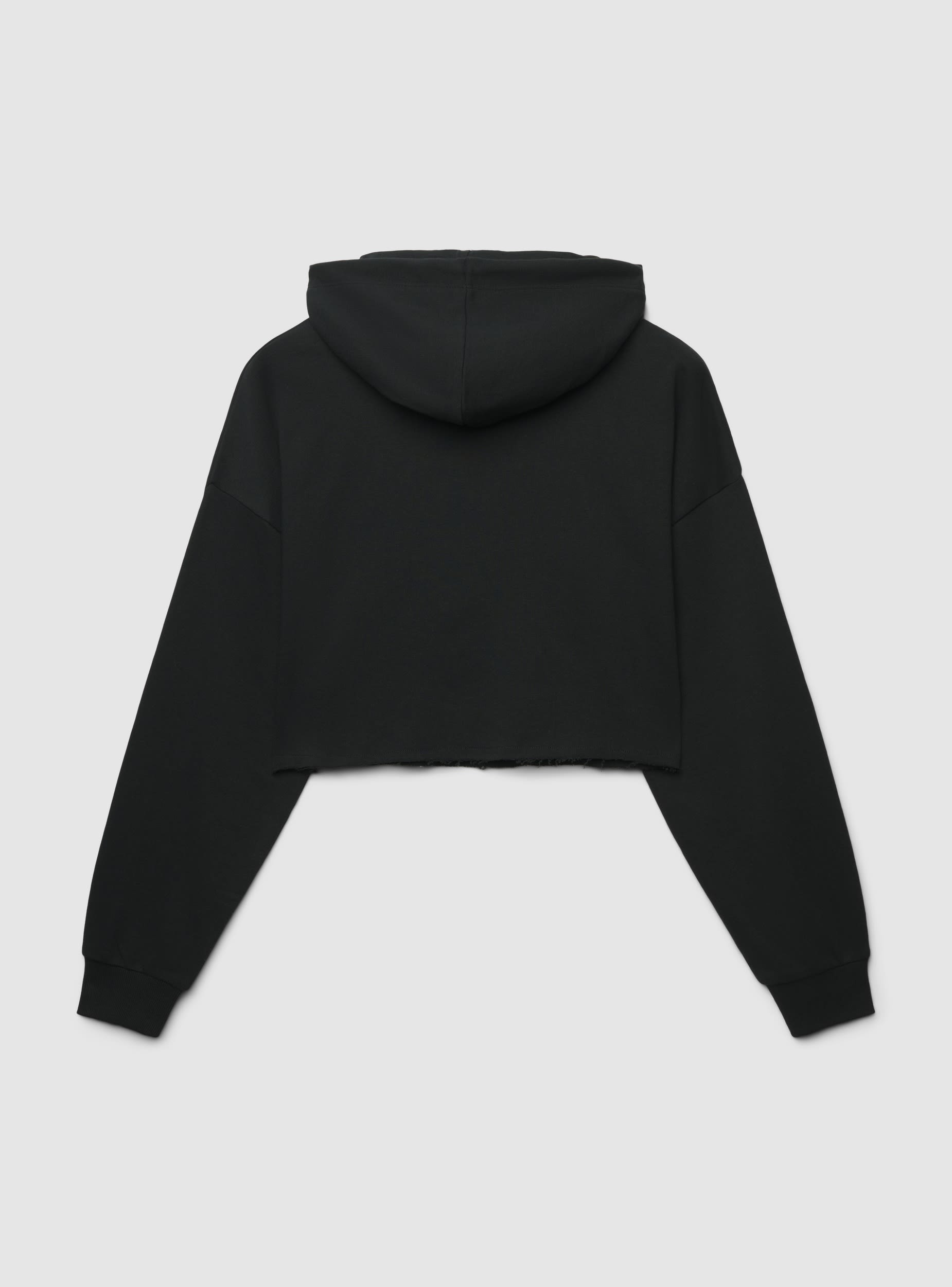 Ženska dukserica sa kapuljačom, kroj crop i sirovi rub. Ima prednju college štampu sa natpisom, duge rukave sa rebrastim manžetnama za udobno prianjanje. Idealna za slobodno vreme ili urbani izgled sa farmerkama visokog struka ili trenerkama.Detalji