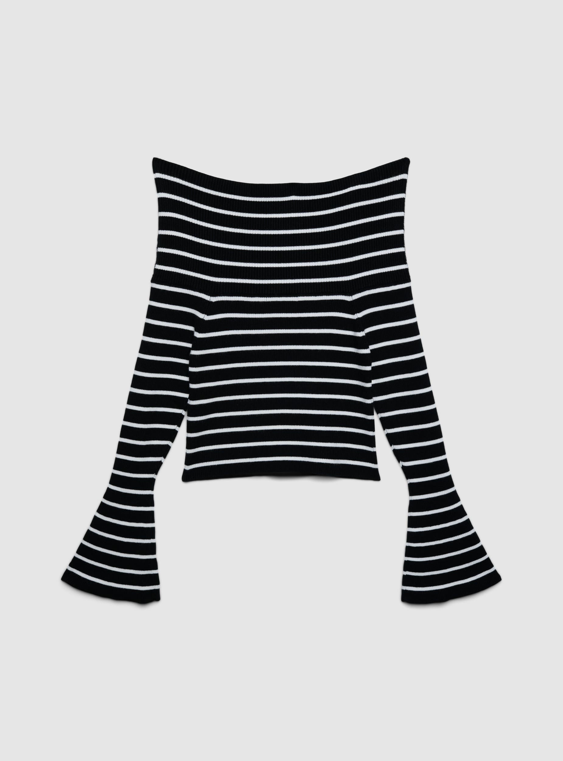 Ženska majica na pruge, krojena kao crop top, sa otkrivenim ramenima. Napravljena od rebrastog pletiva, ima duge rukave u obliku zvona za elegantan dodir. Uski kroj na grudima i ravni donji rub. Savršena uz farmerke visokog struka ili midi suknje za slobodno vreme ili večernje izlaske, lako se nosi preko minimalnih topova za uredan i ženstven izgled.Detalji
