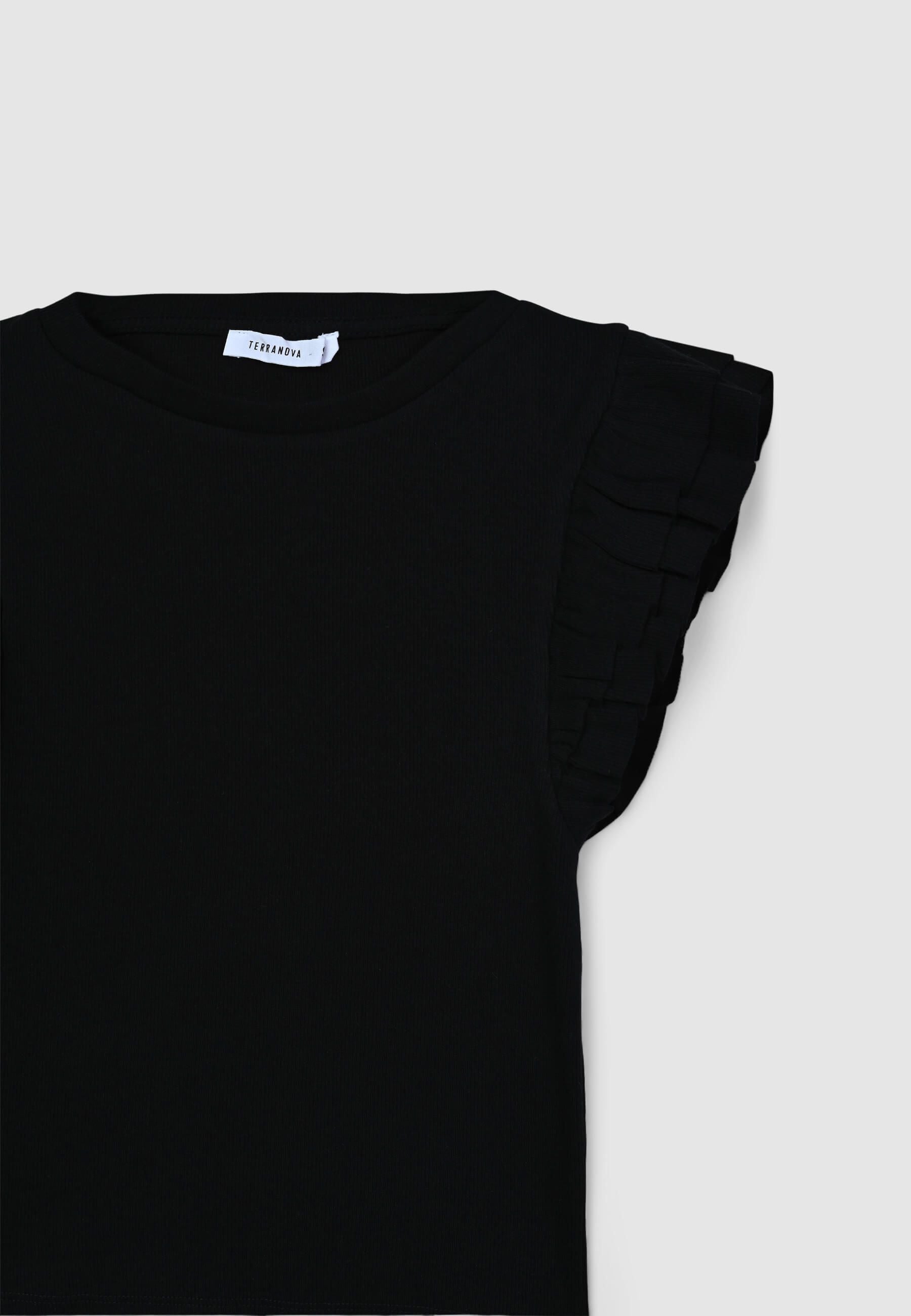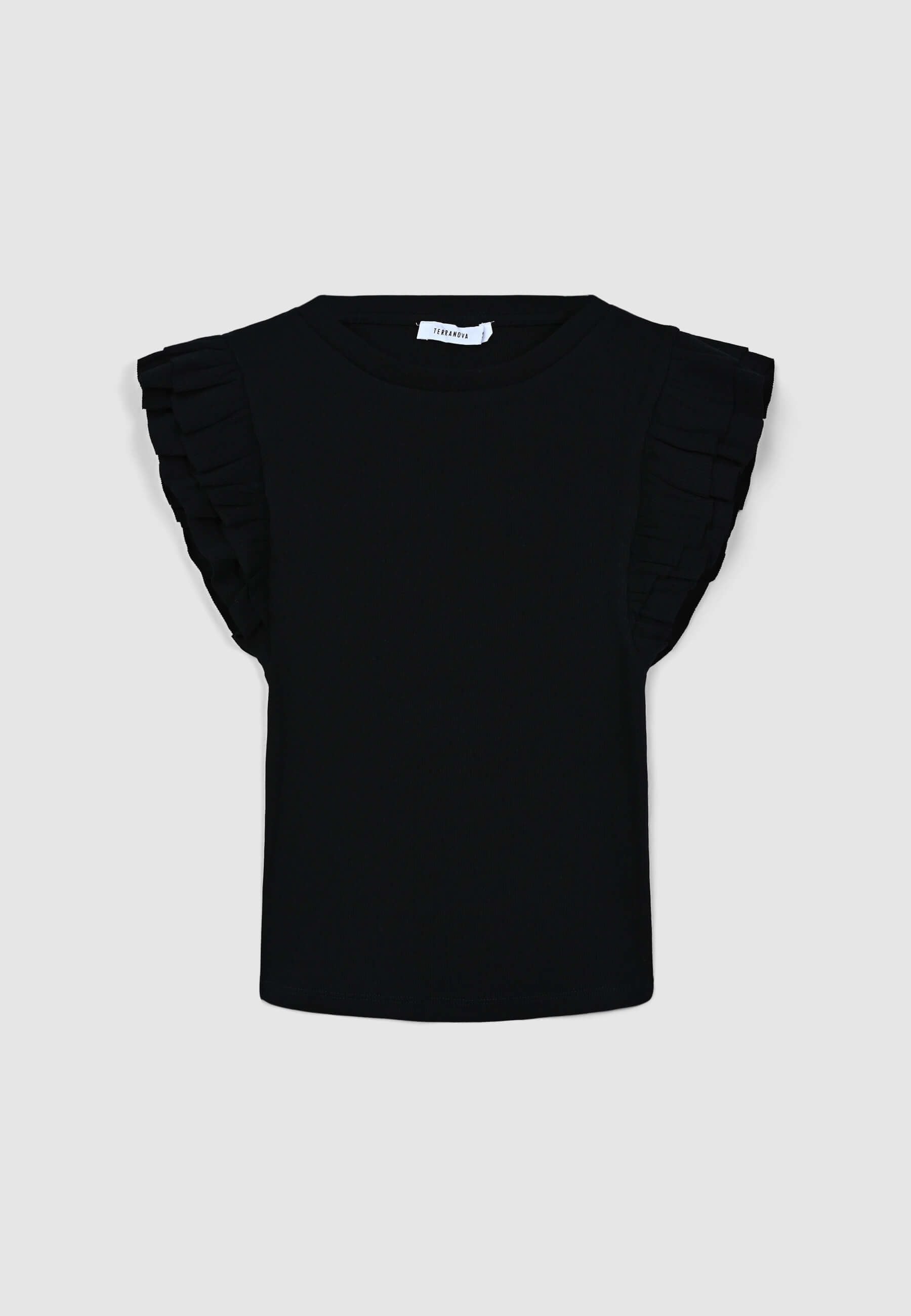 Maglietta da donna a tinta unita con taglio crop. Le maniche sono impreziosite da eleganti balze che donano un tocco femminile e delicato al capo. Perfetta per abbinamenti casual o più ricercati, ideale per la stagione estiva grazie al design fresco e leggero.Detalji