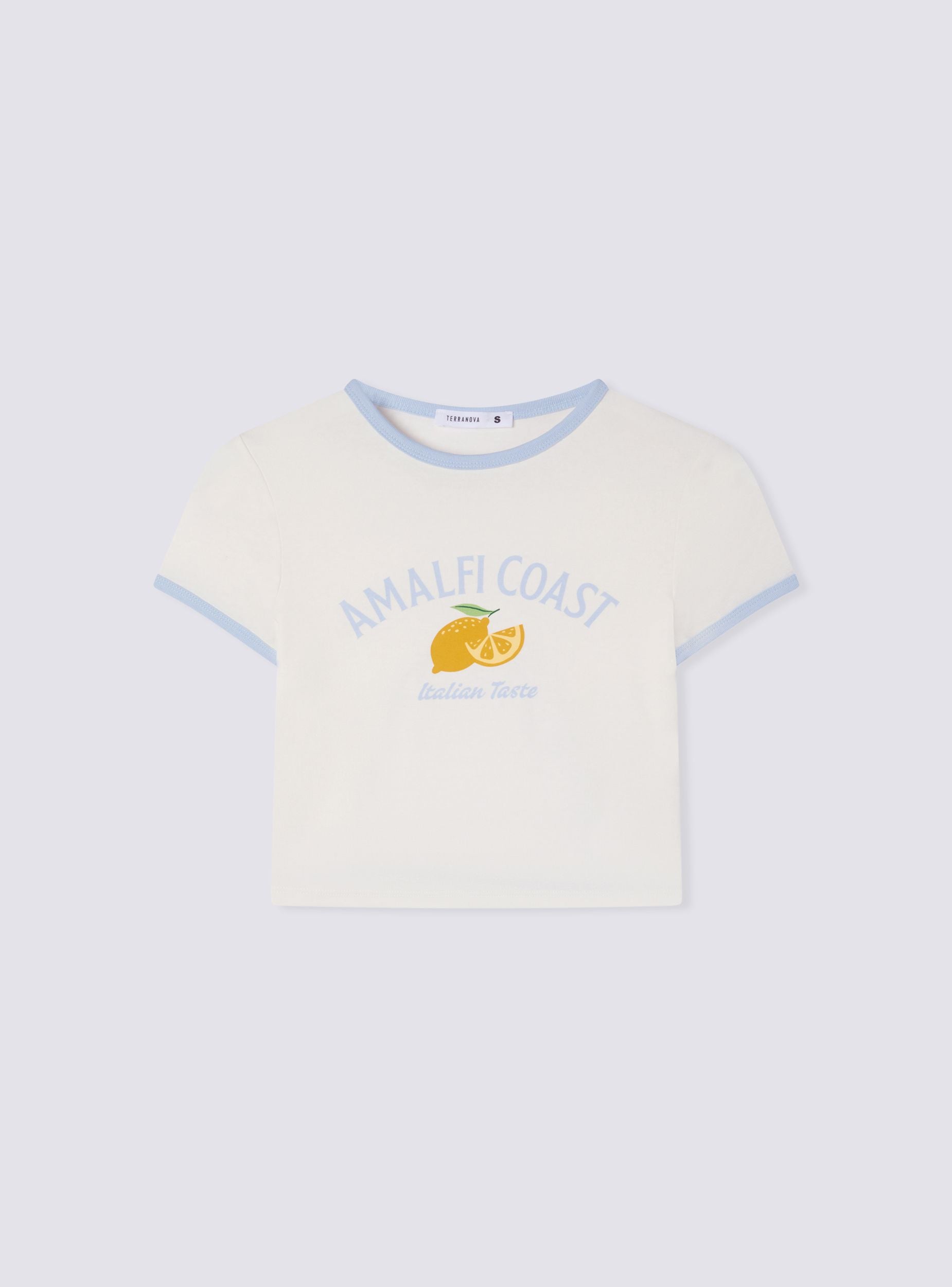 Ženska majica sa letnjim i modernim dizajnom, kratkim rukavima i okruglim izrezom obogaćenim kontrastnim ivicama. Štampa sa voćnom tematikom sa natpisom dodaje živahnu i svežu notu. Kroj je skraćen, detalj sa izrezom na leđima i vezice upotpunjuju stil. Savršena uz farmerke visokog struka ili suknje, idealna je za ležerne kombinacije i dane na otvorenom.Detalji