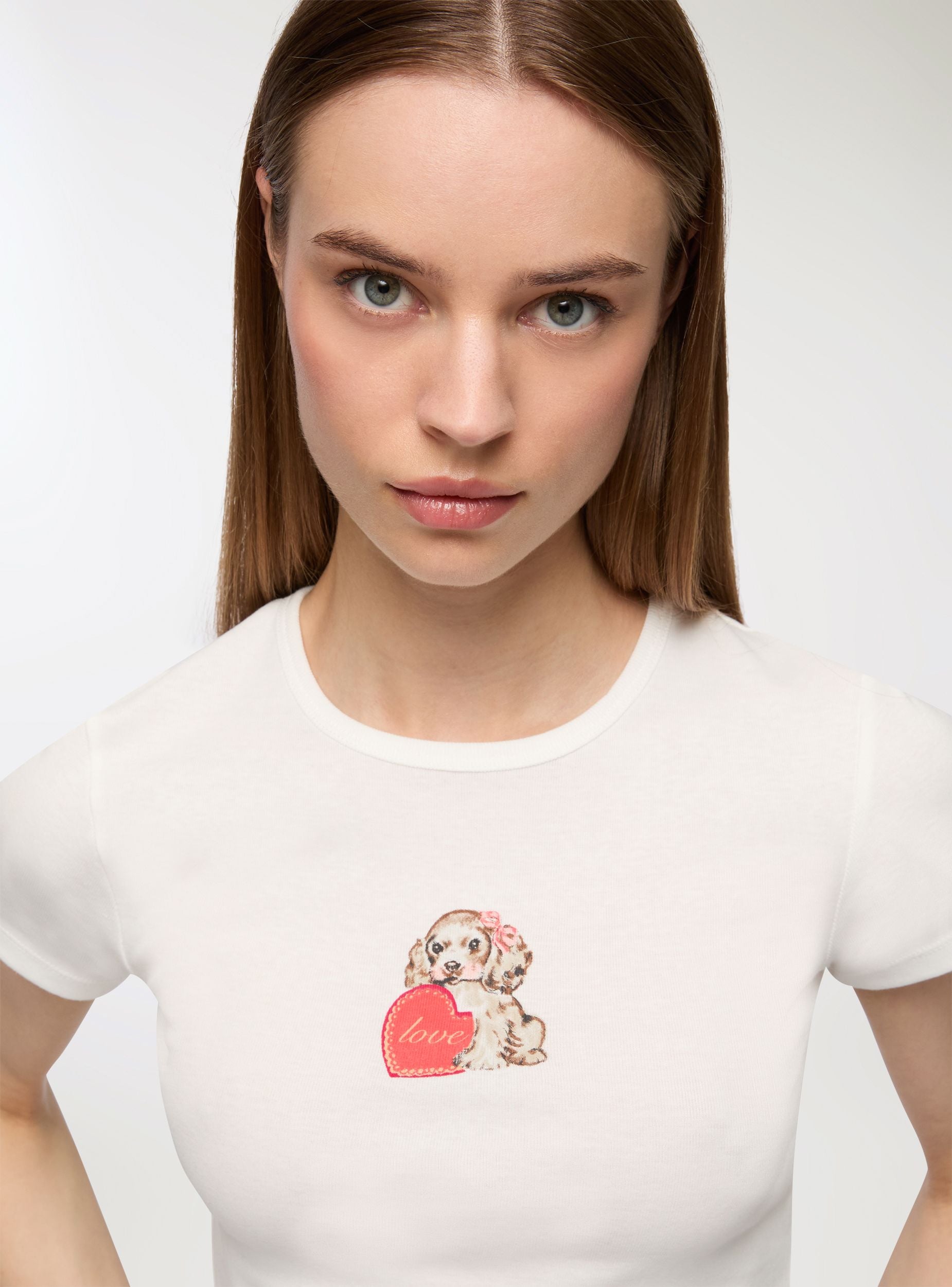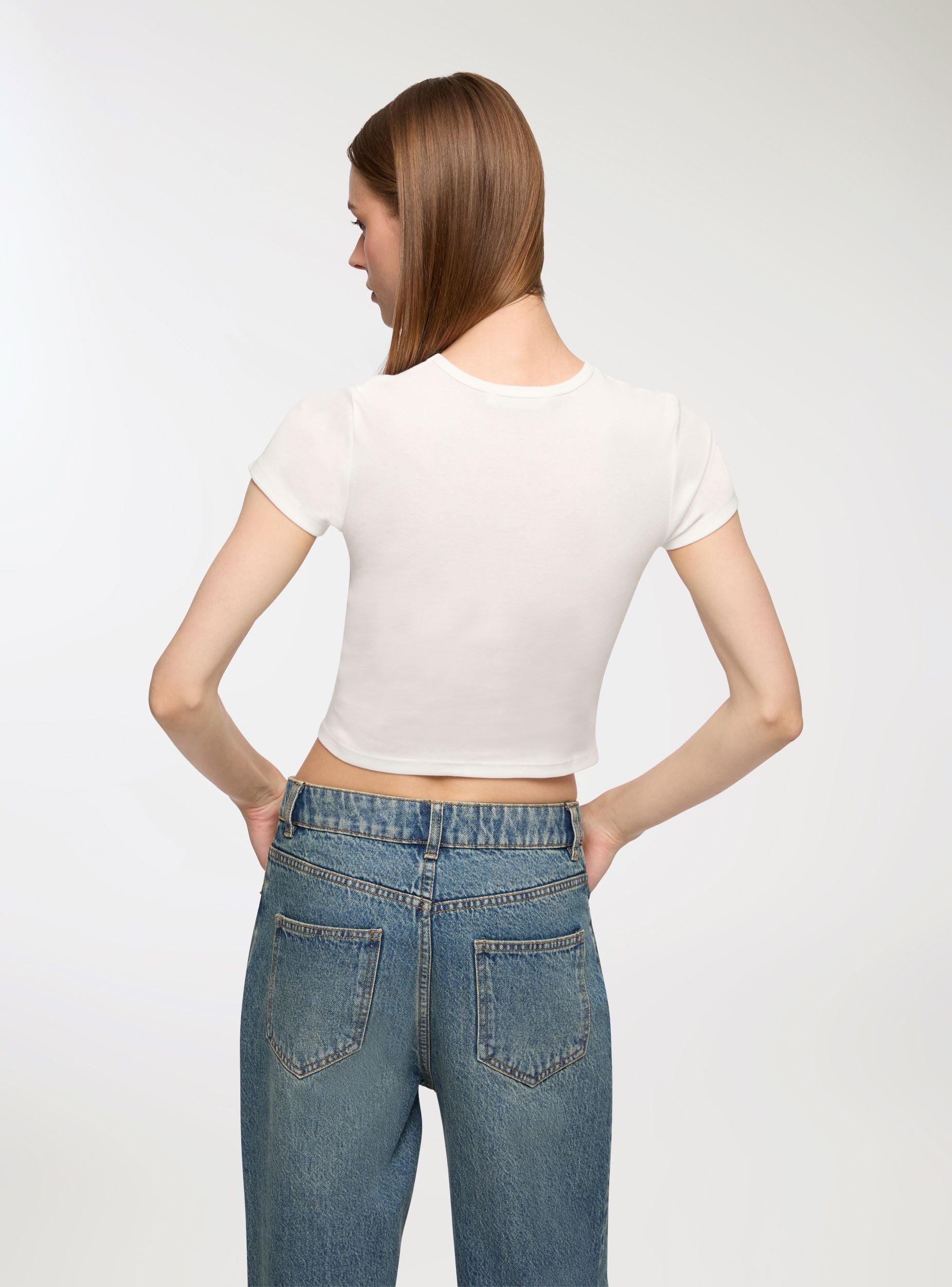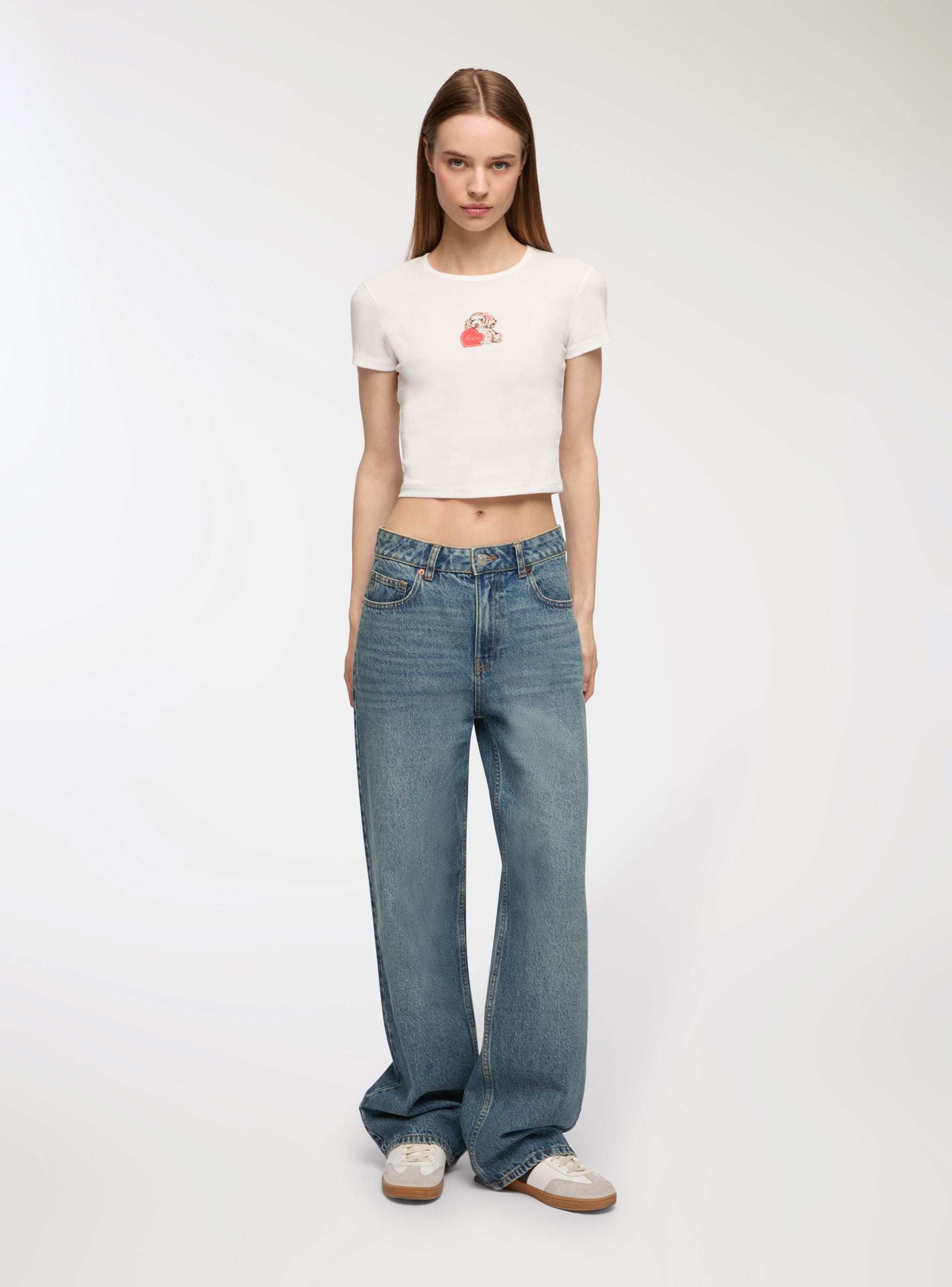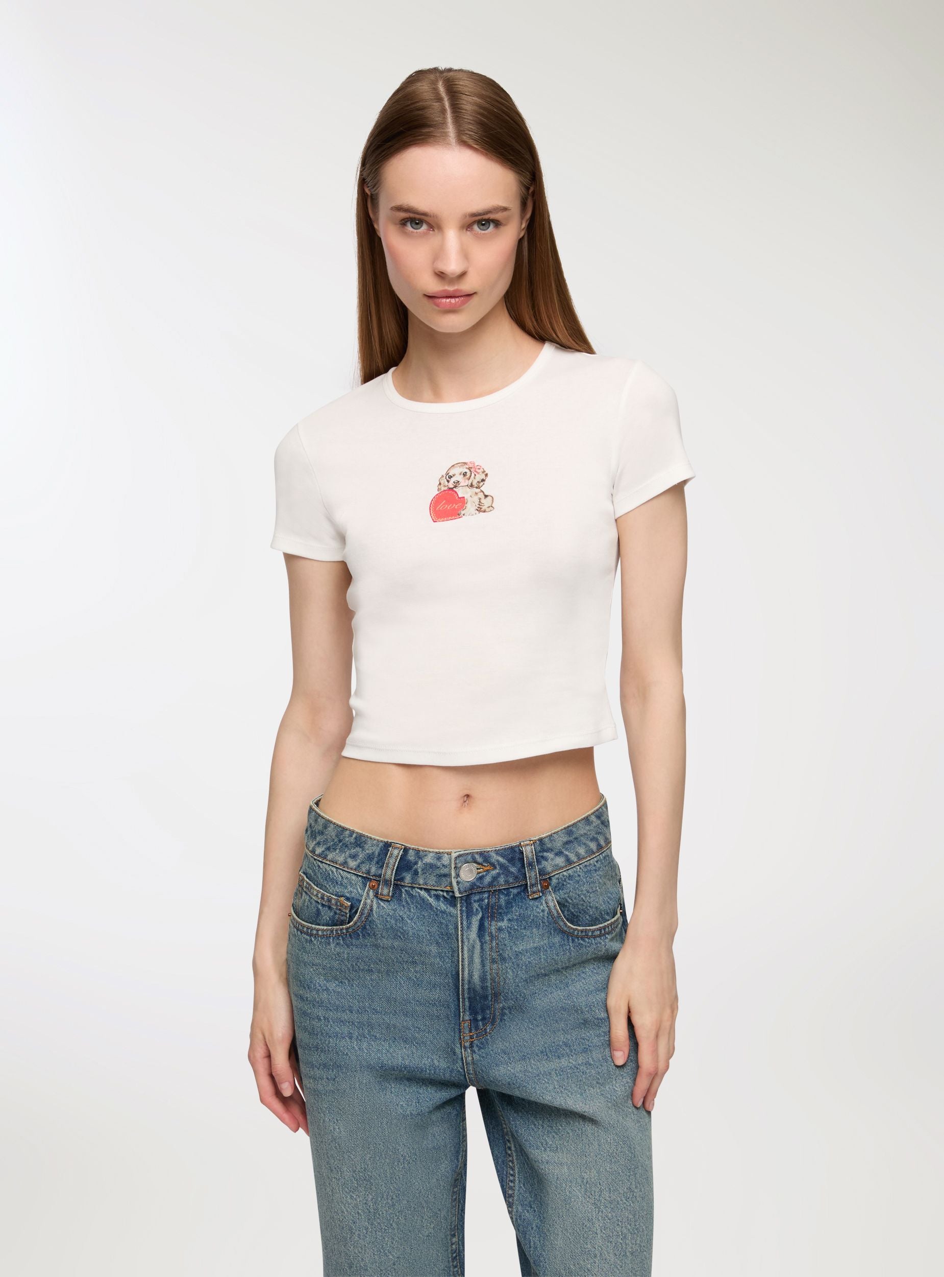 Ženska majica sa skraćenim krojem, idealna za ležeran i moderan izgled. Ima centralni print sa razigranim i originalnim motivima koji dodaju živost dizajnu. Savršena za kombinovanje sa farmerkama ili pantalonama sa visokim strukom za mladalački i dinamičan stajling. Dizajn sa kratkim rukavima i okruglim izrezom čini je svestranom i pogodnom za razne neformalne prilike.Detalji