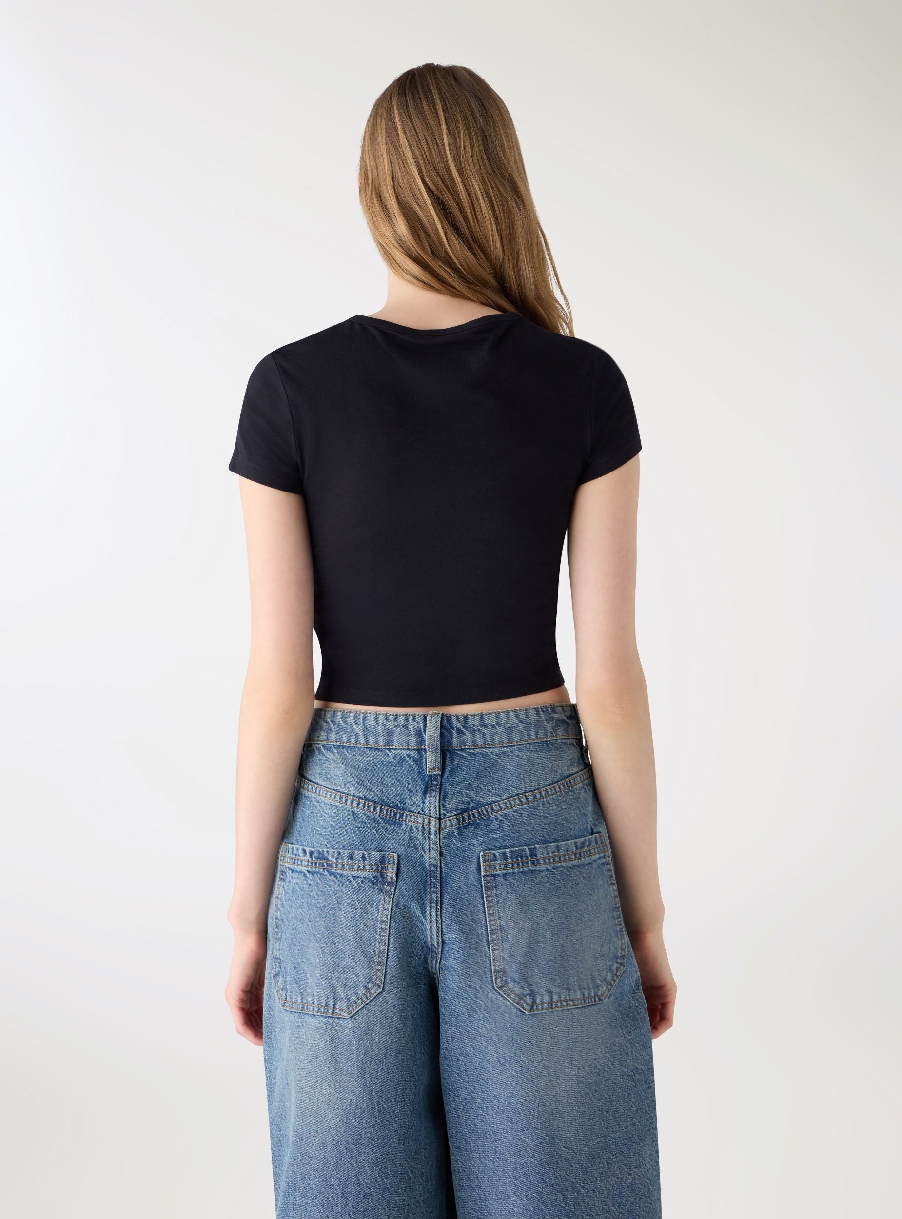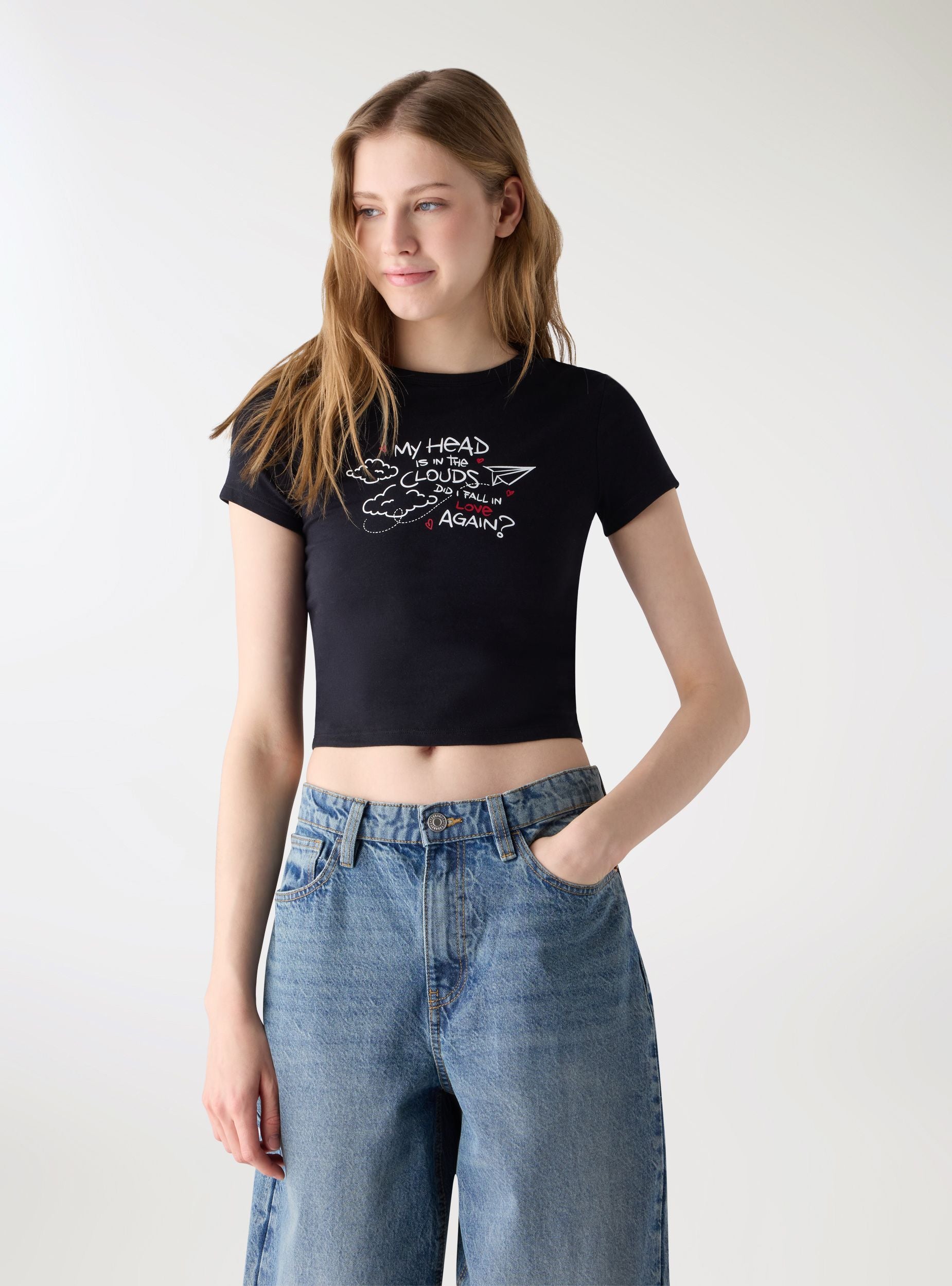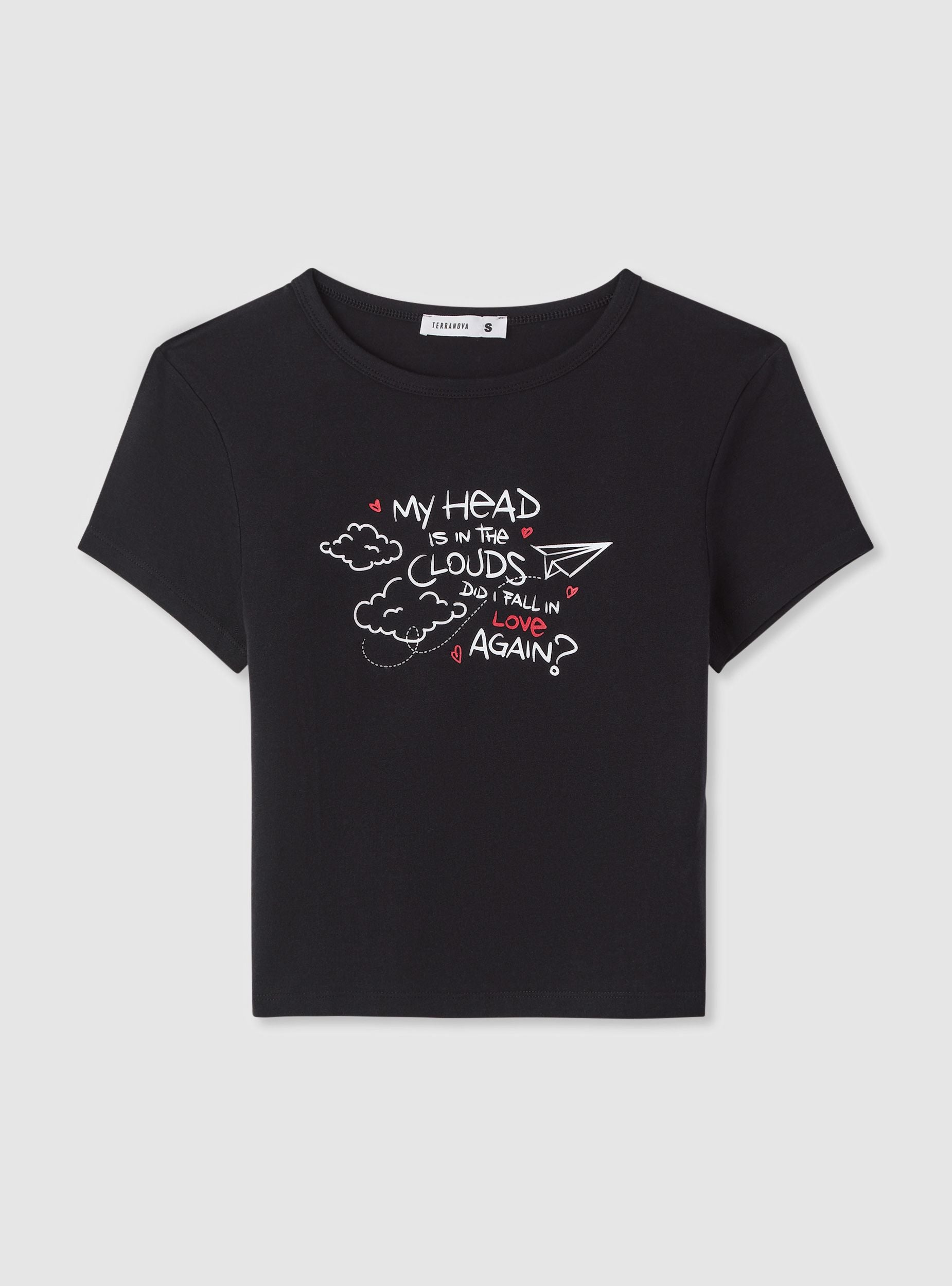 Ženska majica sa crop krojem i printom sprijeda. Okrugli izrez i kratki rukavi za svestran izgled, idealna uz farmerke visokog struka ili midi suknje za slobodno vreme i šetnje gradom. Grafika sa oblacima, srcima i aviončićem dodaje razigrani detalj. Regularan kroj, ravna ivica i uredni završeci, savršena ispod laganih jakni ili otvorenih dukseva.Detalji