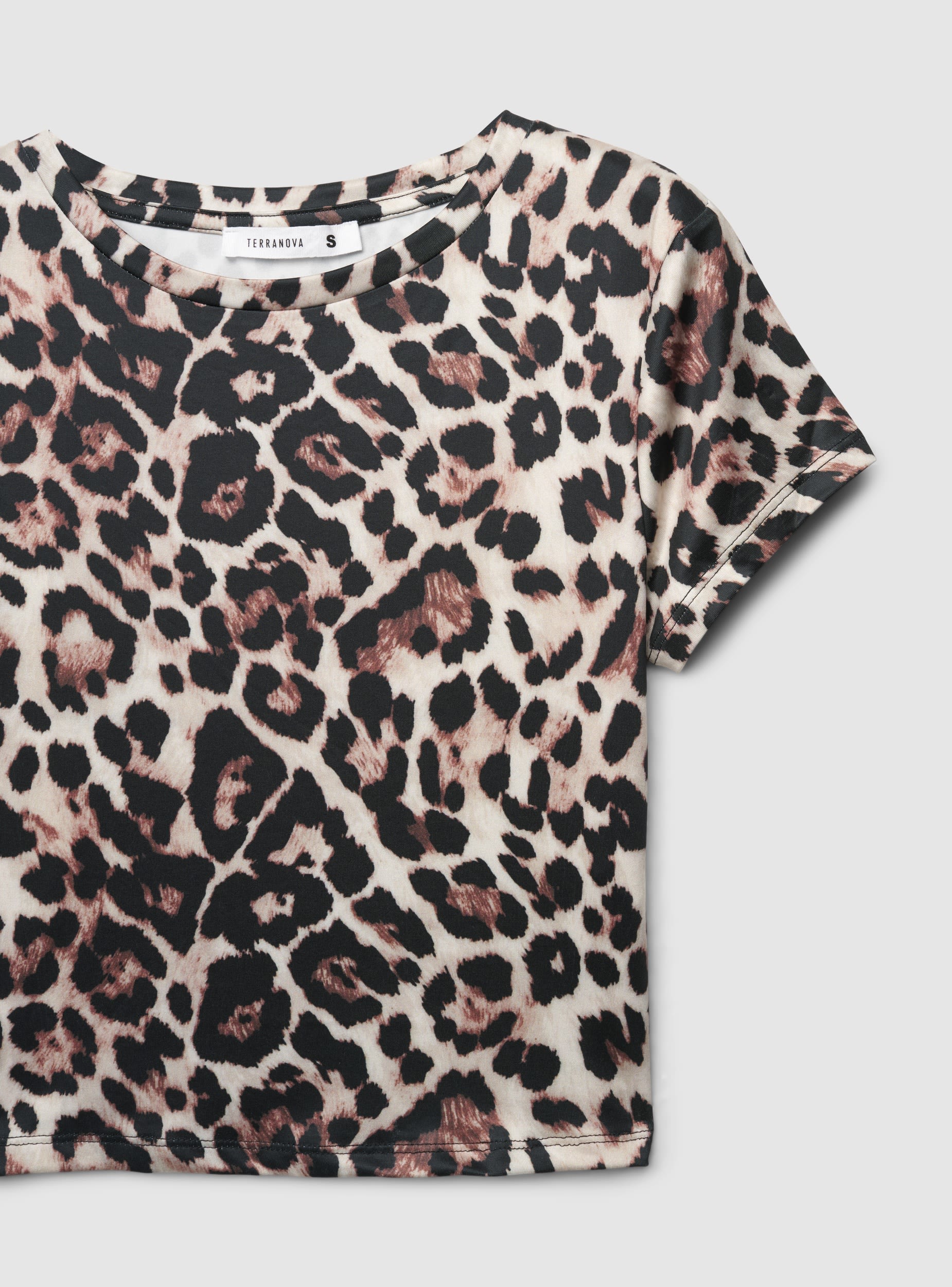 Ženska majica crop kroja sa animal printom. Okrugli izrez i kratki rukavi, savršena za energične kombinacije od jutra do večeri. Lako se kombinuje sa farmerkama visokog struka, mini suknjama ili krojenim pantalonama za moderan kontrast. Jednostavan dizajn ističe siluetu, dok elastičnost materijala pruža udobnost u pokretu. Idealna za casual i urbane outfite sa patikama ili sandalama.Detalji