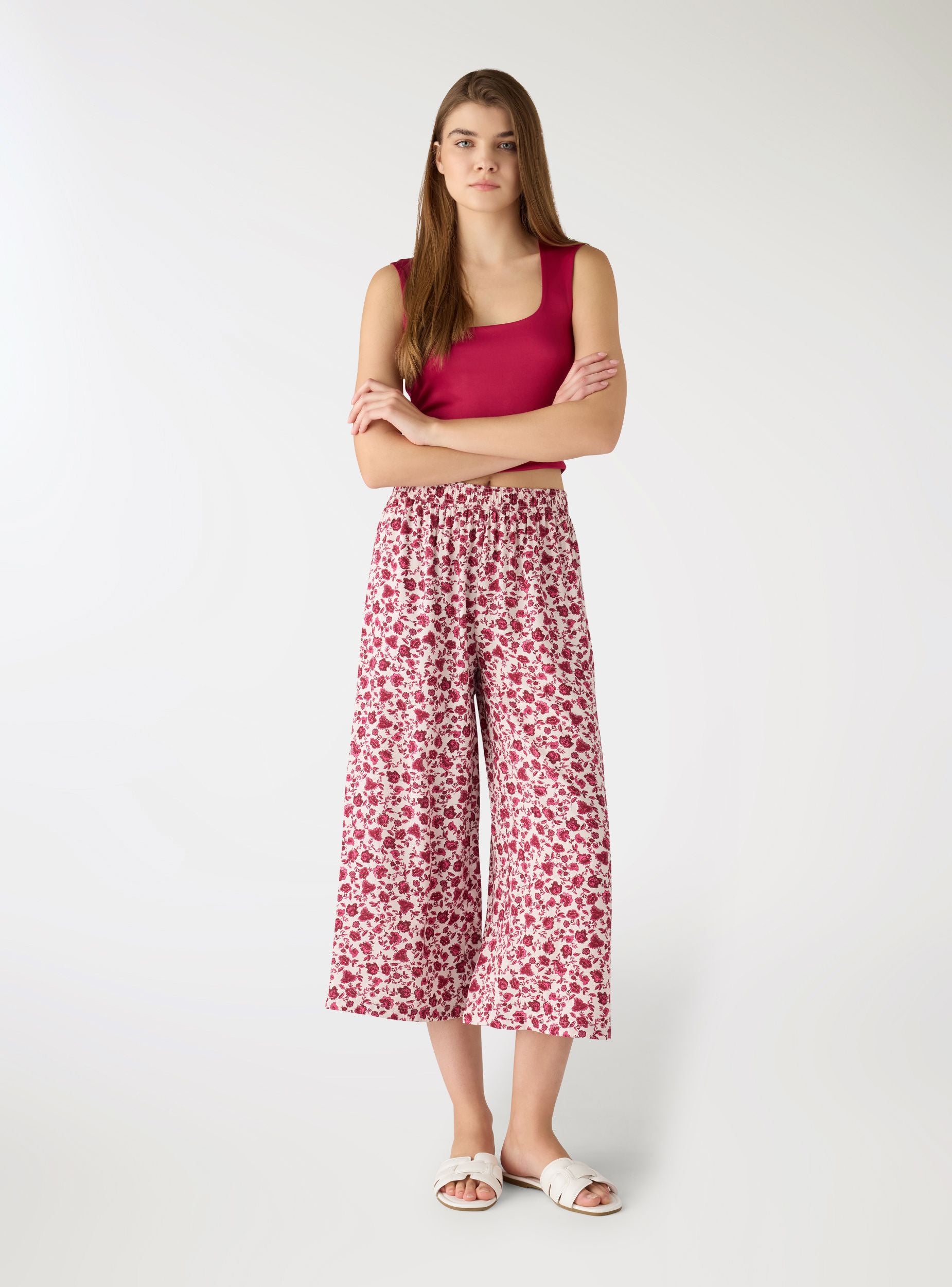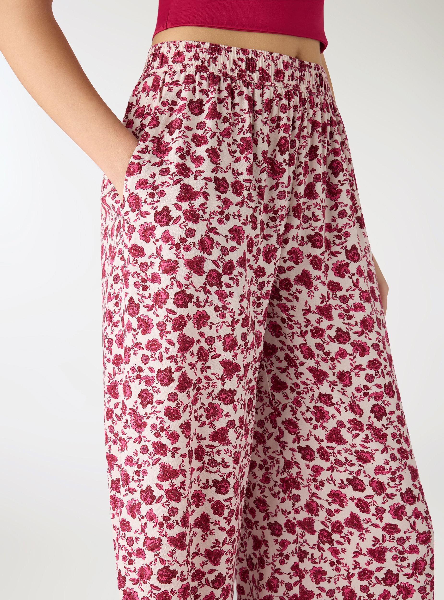 Ženske pantalone sa cvetnim printom i širokim krojem, idealne za sveže gradske ili ležerne kombinacije. Struk sa elastičnom trakom pruža udobnost i lako pristajanje, dok široke nogavice i skraćena dužina vizuelno izdužuju figuru. Savršene uz uske topove i sandale, ili uz laganu košulju i patike za opušteni stajling.Detalji