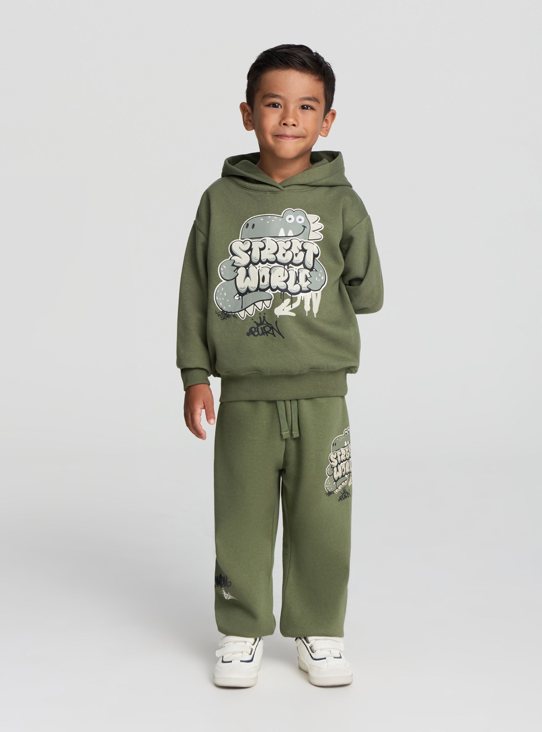 Teški dečiji trenerka pantaloni idealni za slobodno vreme i svakodnevne aktivnosti. Imaju grafiti štampu napred koja daje urbani i živahni dodir, sa elastičnim donjim delom za udobno i sigurno nošenje. Opremljeni su elastičnim pojasom sa podesivom šnrom, savršeni su za kombinovanje sa duksericama ili majicama za sportski i praktičan izgled.Detalji