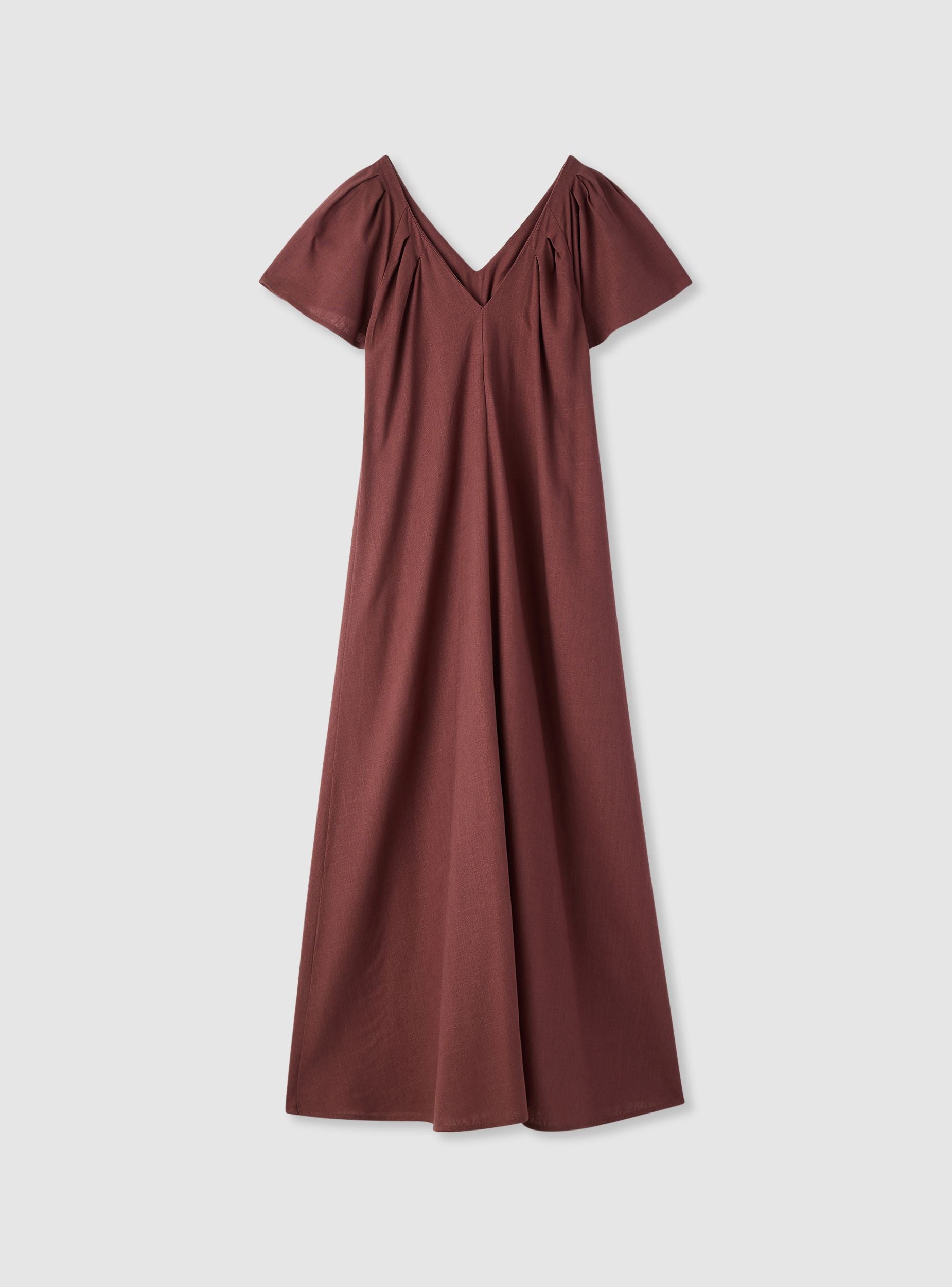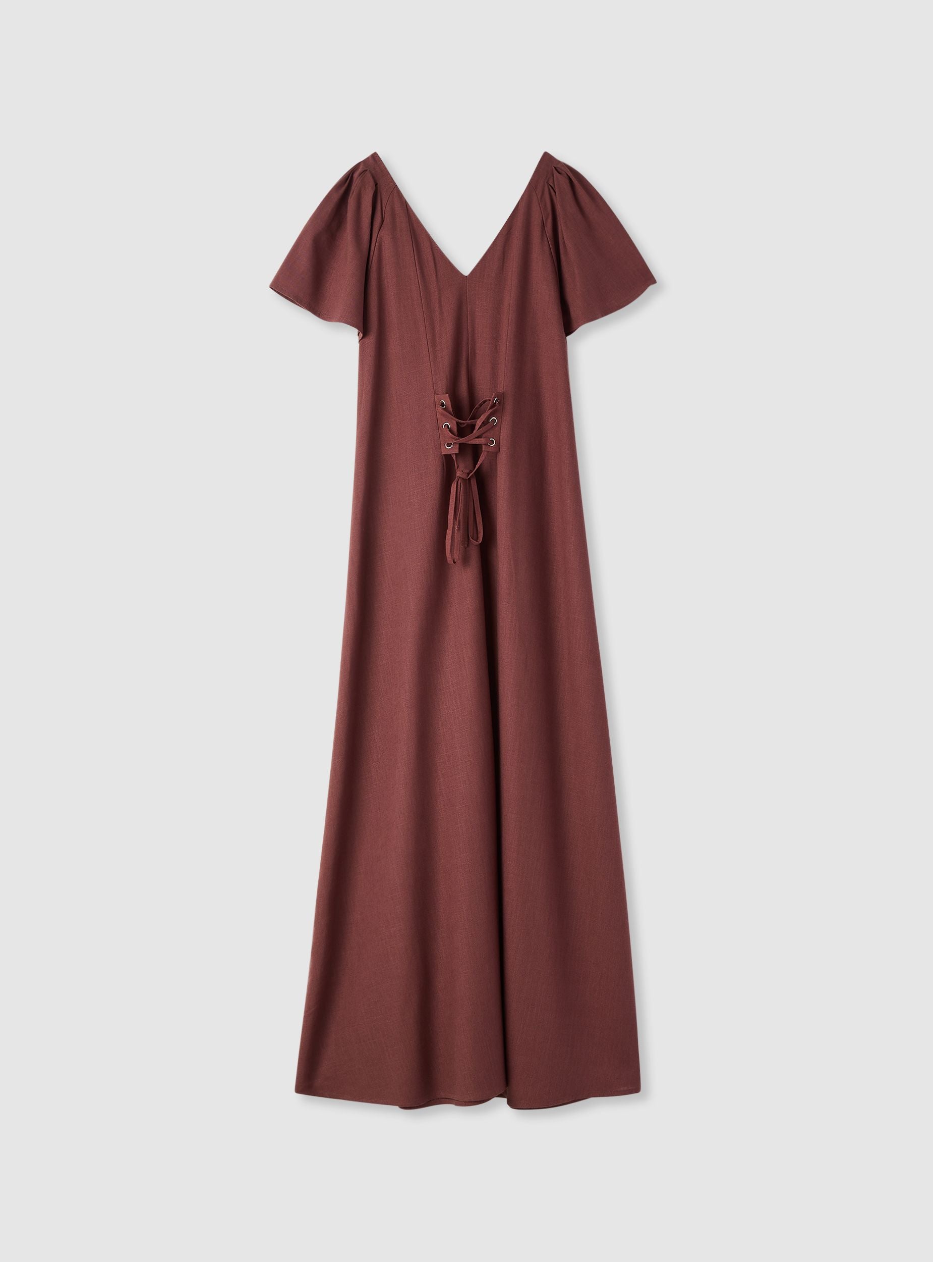 Duga ženska haljina u jednobojnoj varijanti sa V-izrezom. Kratki leptirasti rukavi sa naborima koji daju volumen i pokret. Fluidan i širok kroj, idealan za ležerne dane, šetnje ili letnje večeri sa sandalama i torbom na rame. Na leđima ima pertlanje za podešavanje pristajanja. Esencijalan i ženstven dizajn koji ističe siluetu.Detalji