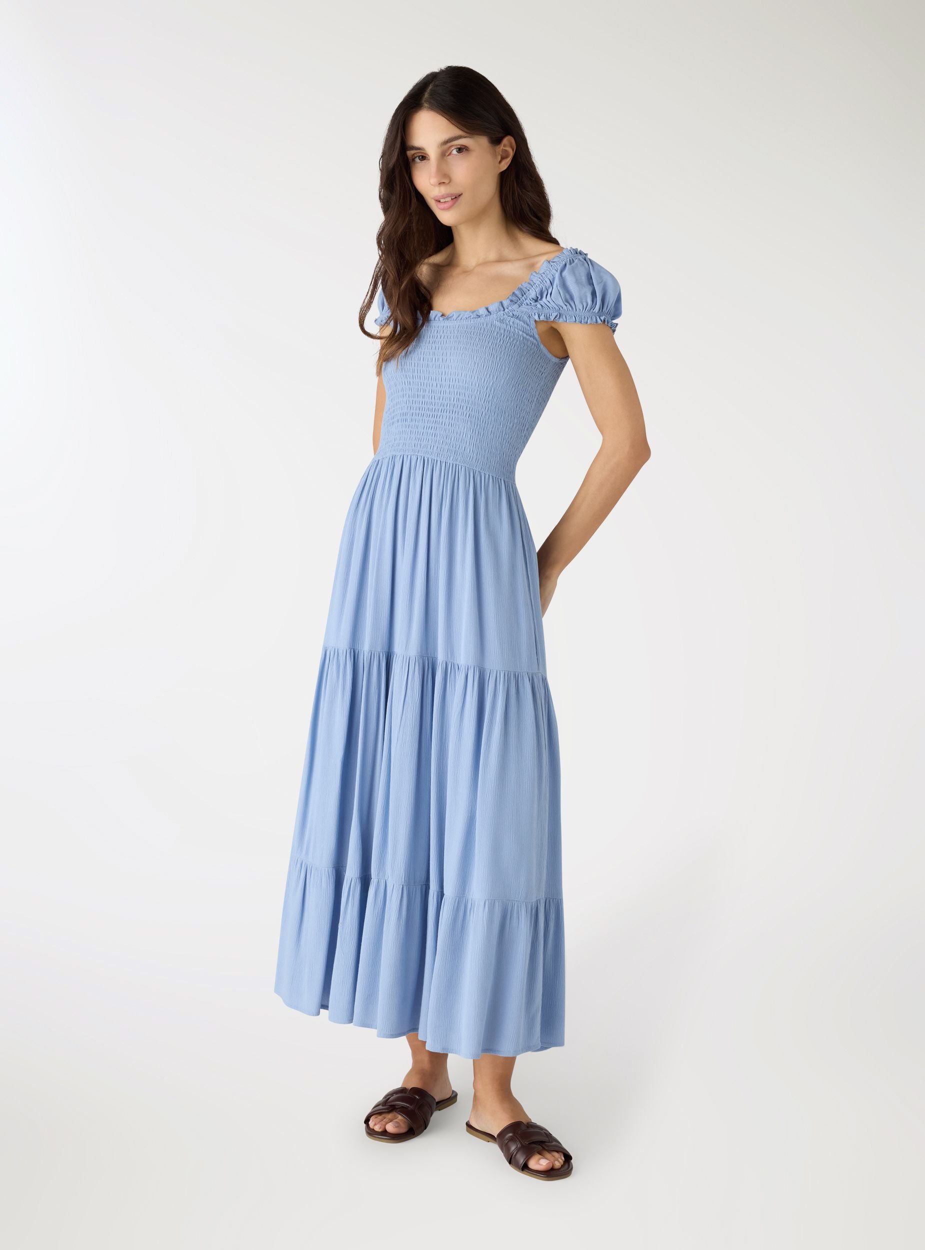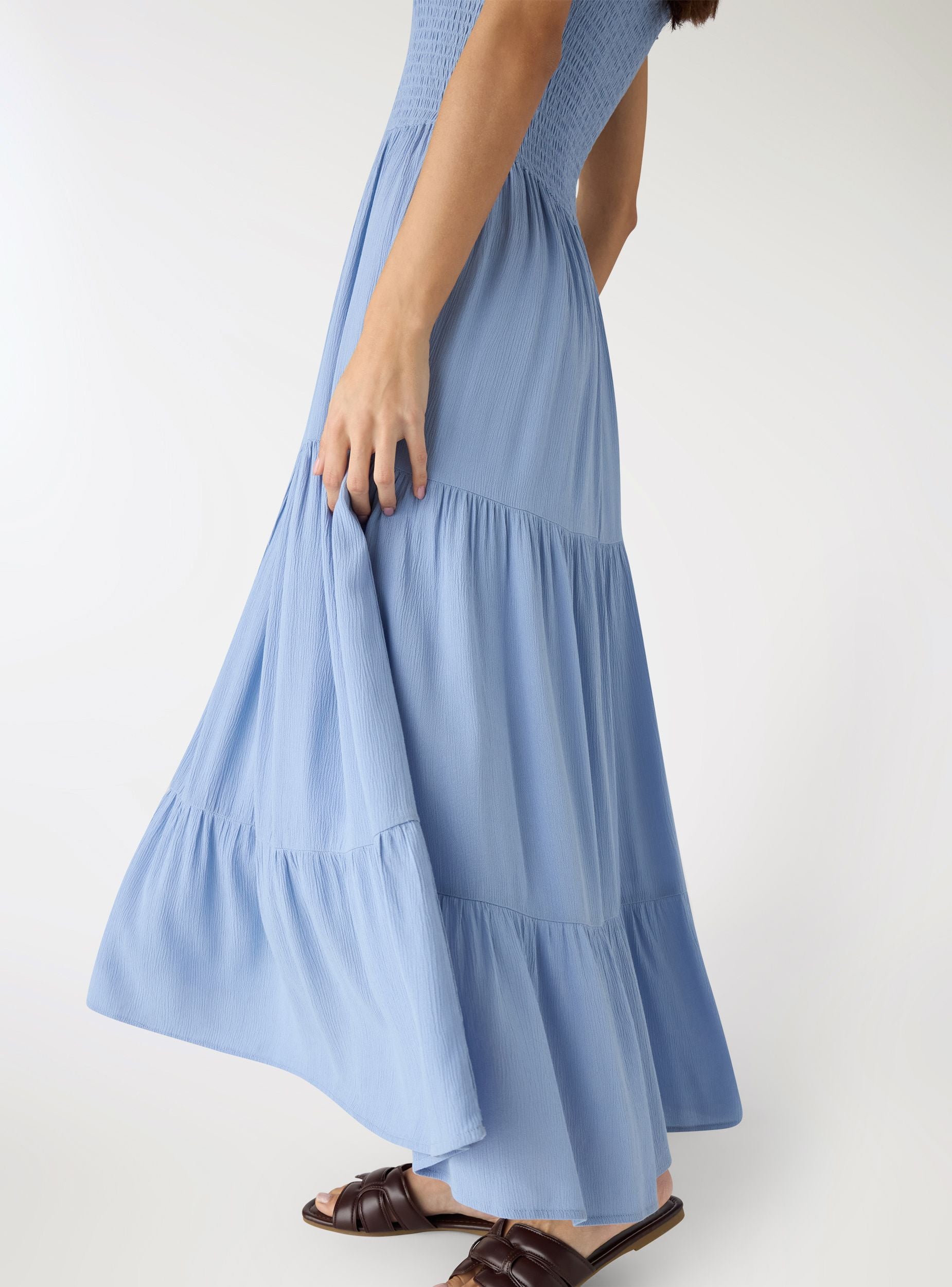 Duga ženska haljina u jednoj boji, idealna za letnje dane i vikende. Steznik sa elastinom ističe figuru i obezbeđuje udobnost, dok široka suknja sa naborima stvara pokret. Kvadratni izrez sa širokim naboranim bretelema, bez kopčanja. Savršena uz ravne sandale ili platforme i torbu preko ramena za ležeran izgled.Detalji