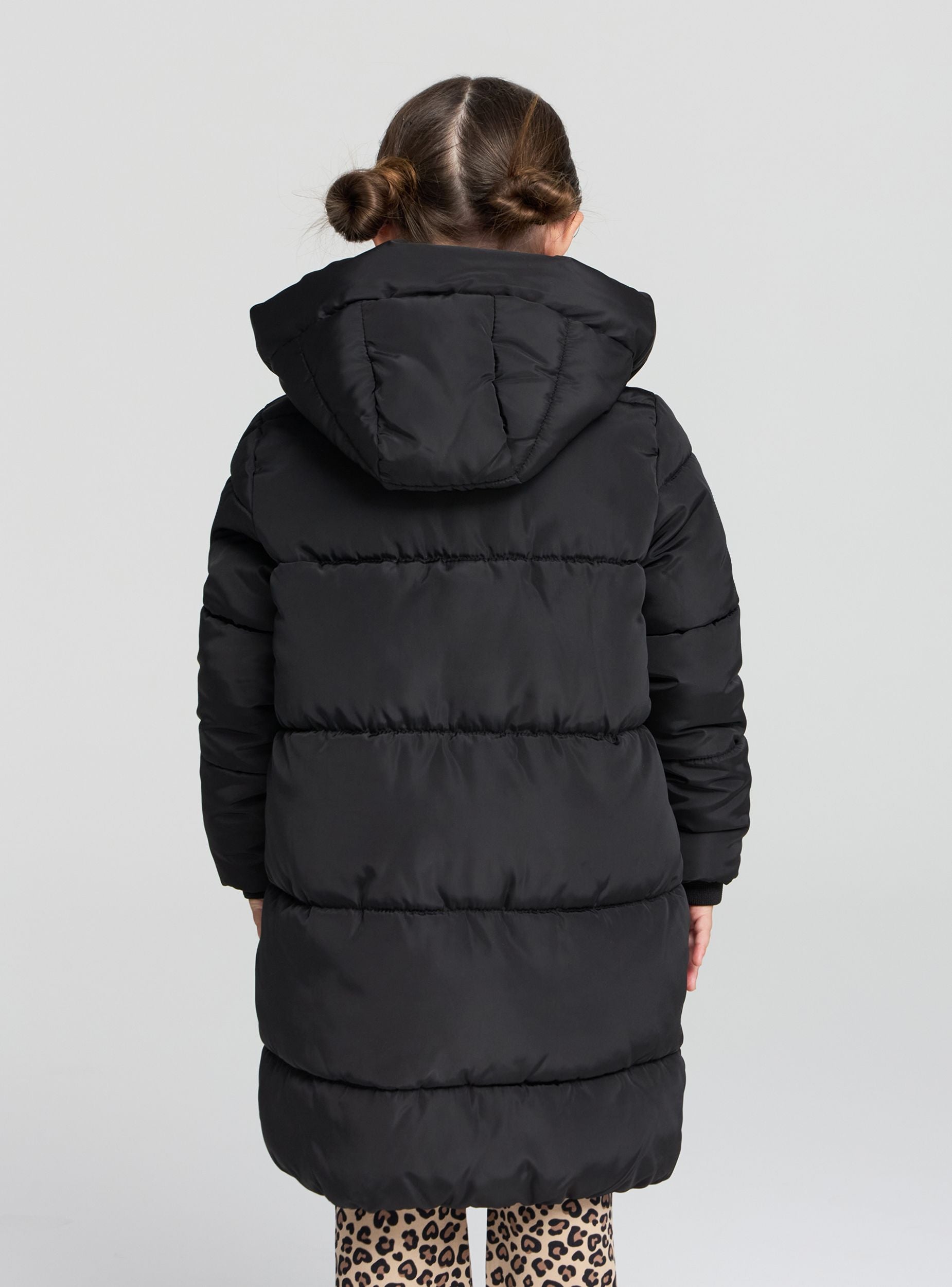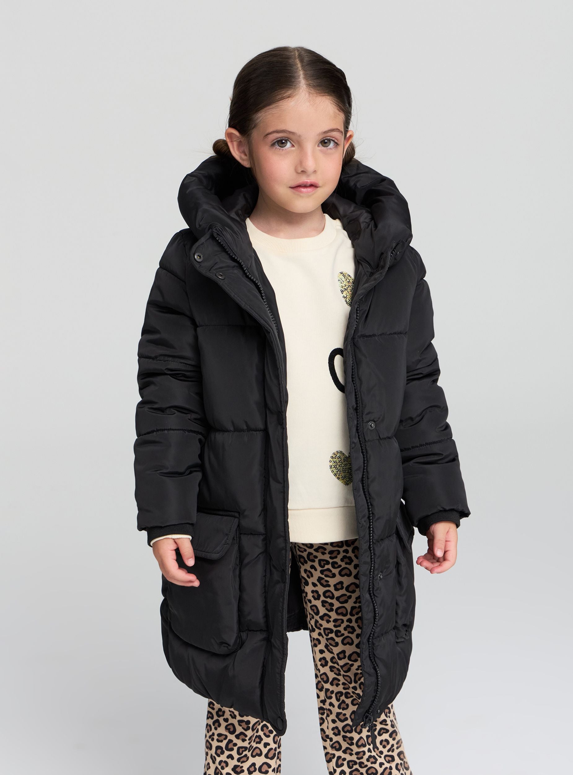 Dugi zimski kaput za devojčice, idealan za hladnije dane. Opremljen kapuljačom i prednjim zatvaranjem sa dugmadima, pruža optimalnu zaštitu od vetra. Prostrane aplikacione džepove dodaju praktičnost, dok redovna kroja omogućava lako nošenje preko drugih komada odeće. Savršen za školu, slobodno vreme i šetnje po gradu.Detalji