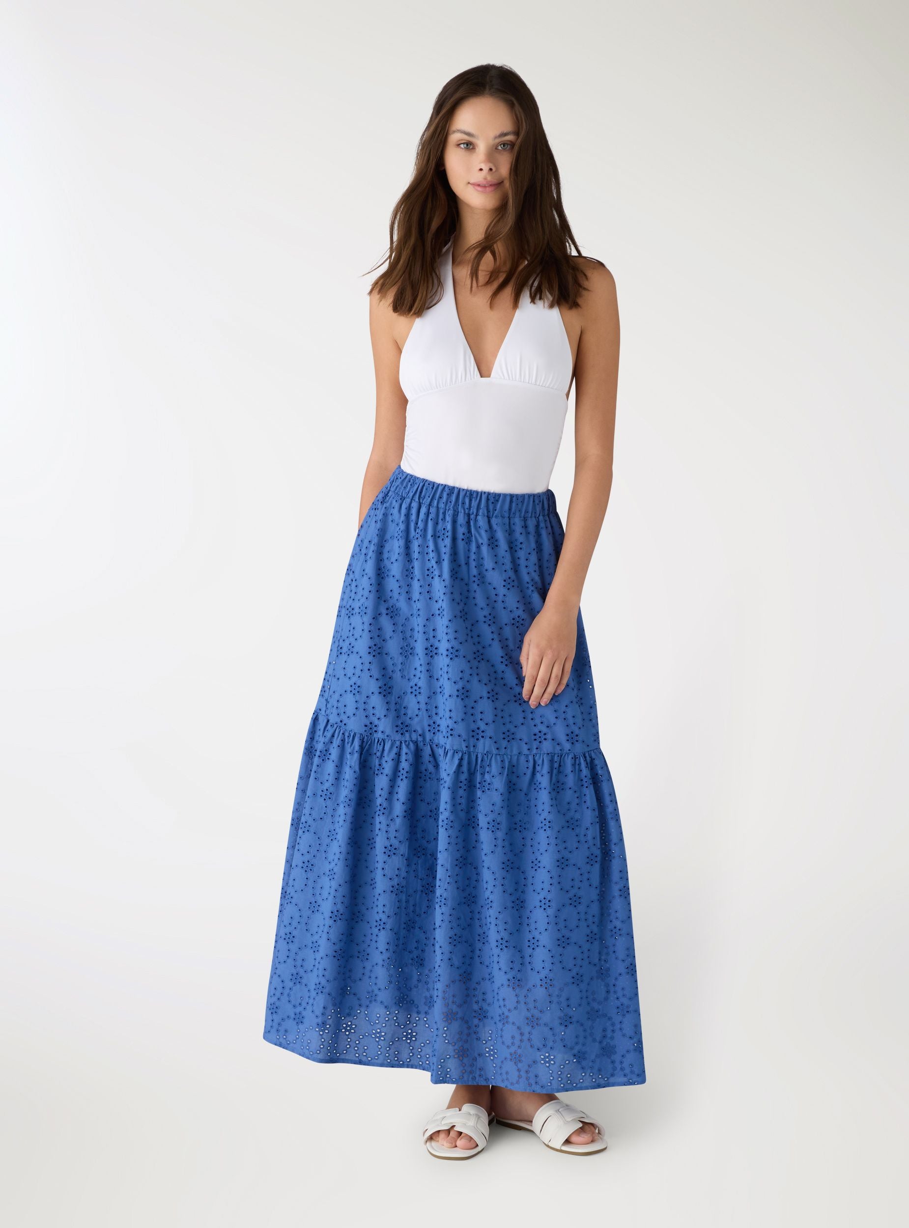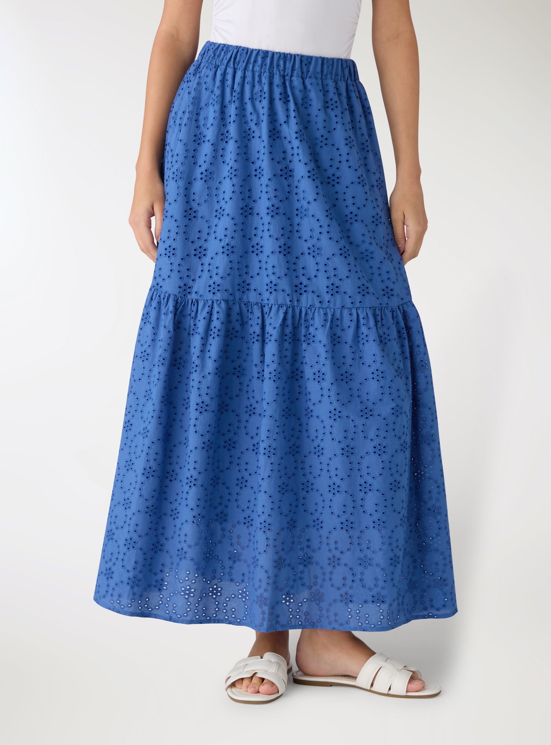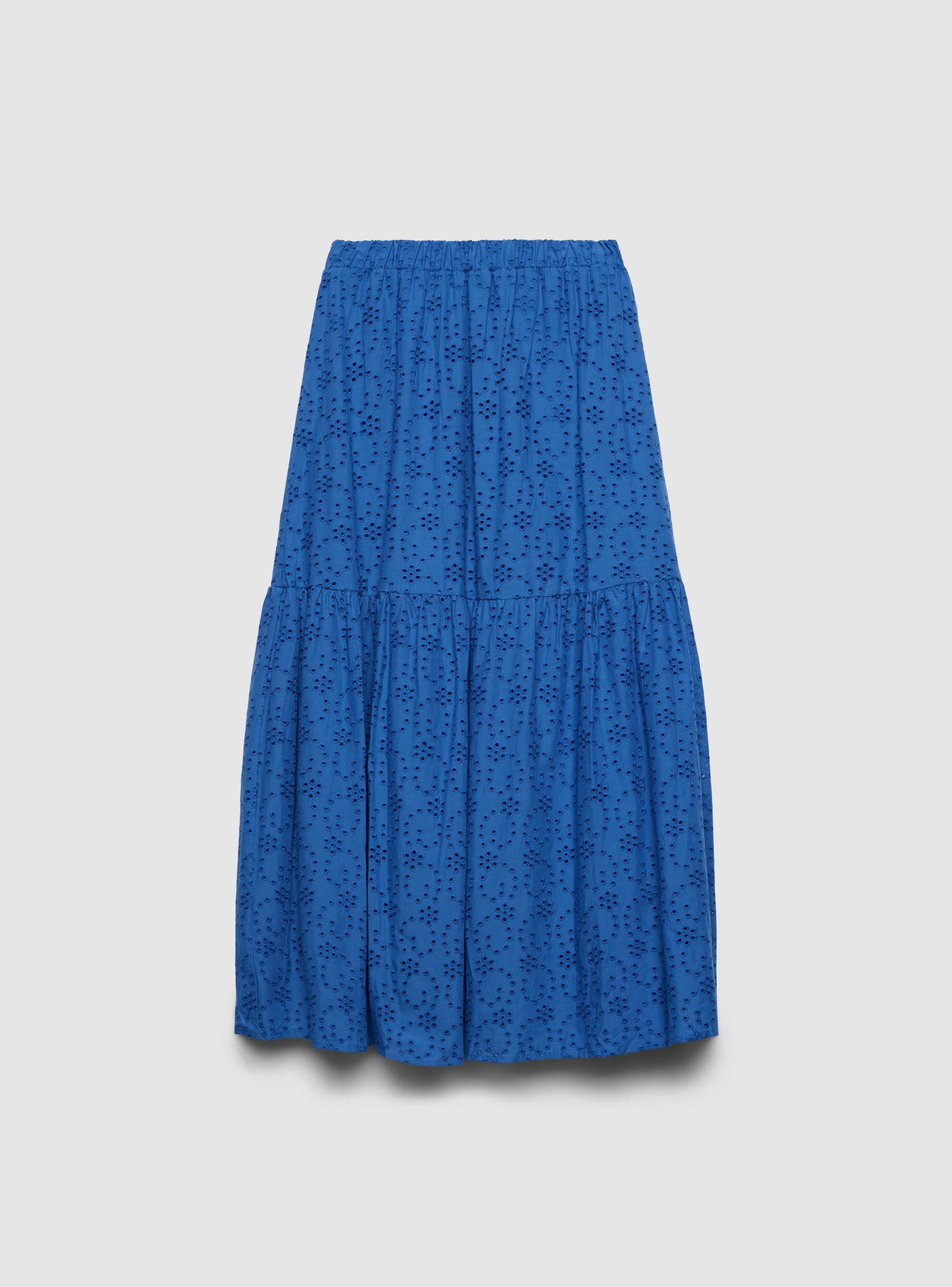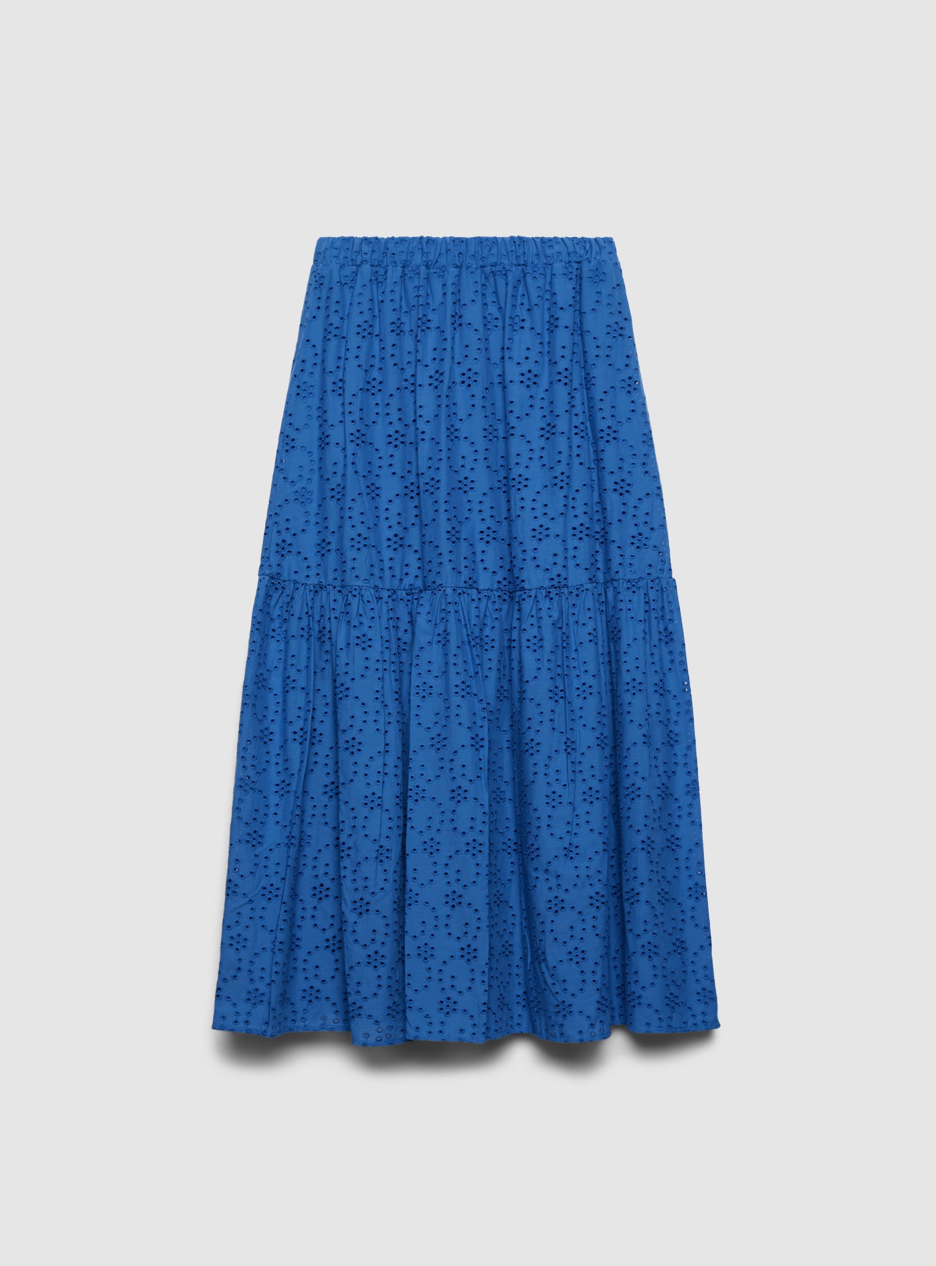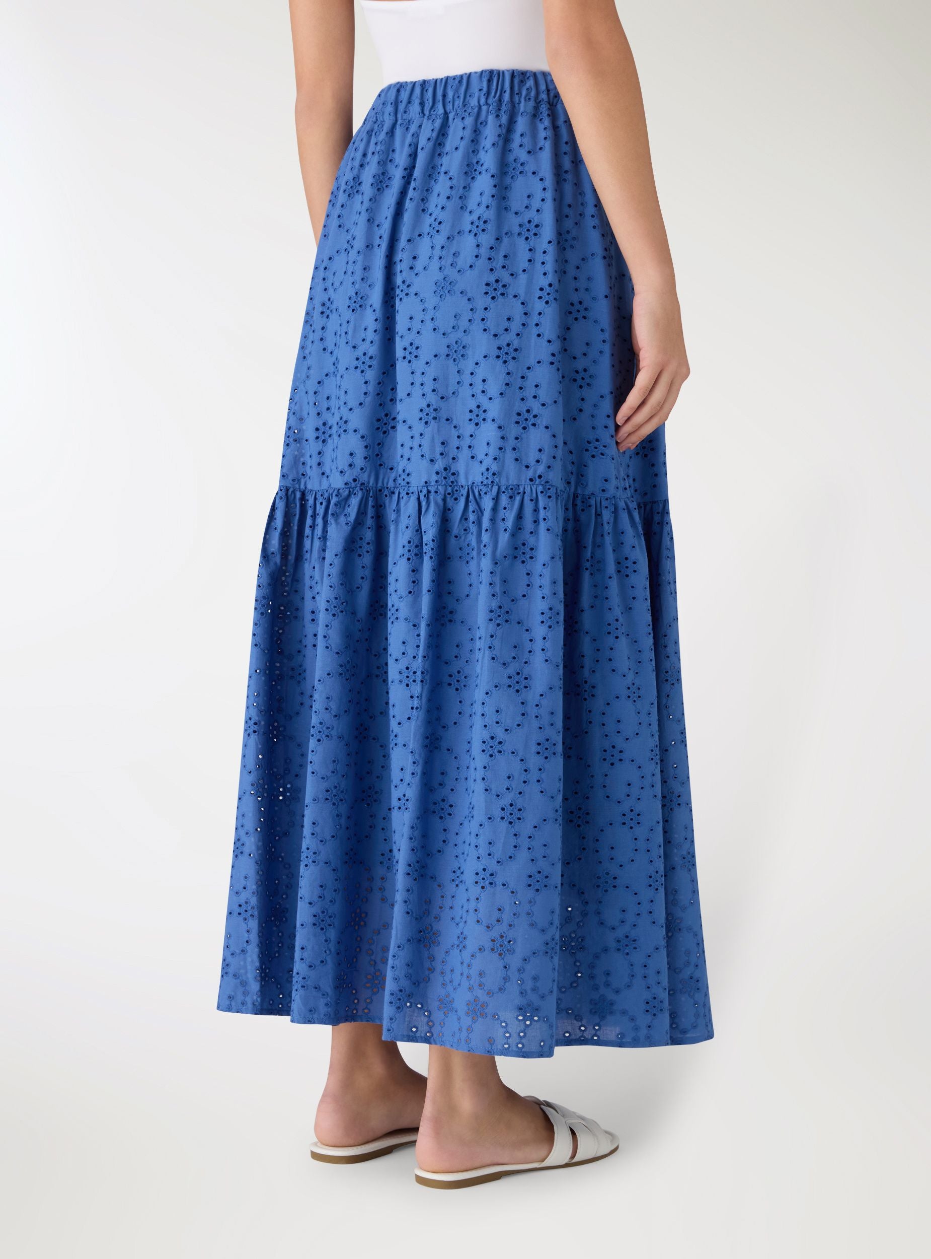 Duga ženska suknja u jednobojnoj varijanti, istaknuta izrezbarenim sangalo motivom i slojevitim krojem koji daje pokret. Elastični pojas obezbeđuje udobnost i lakoću nošenja. Savršena uz uske topove i sandale za letnje izglede, ili uz košulju i platforme za uredan dnevni outfit.Detalji