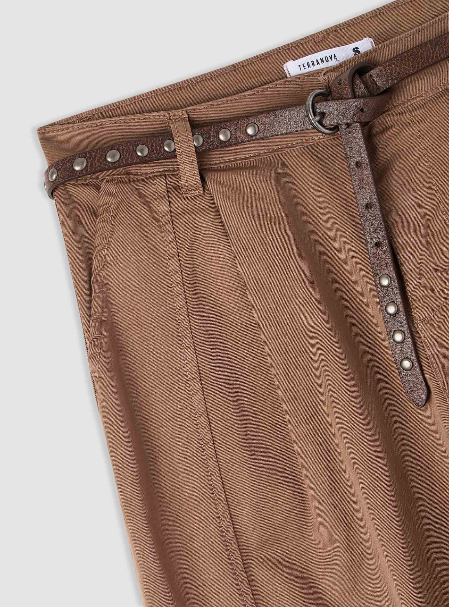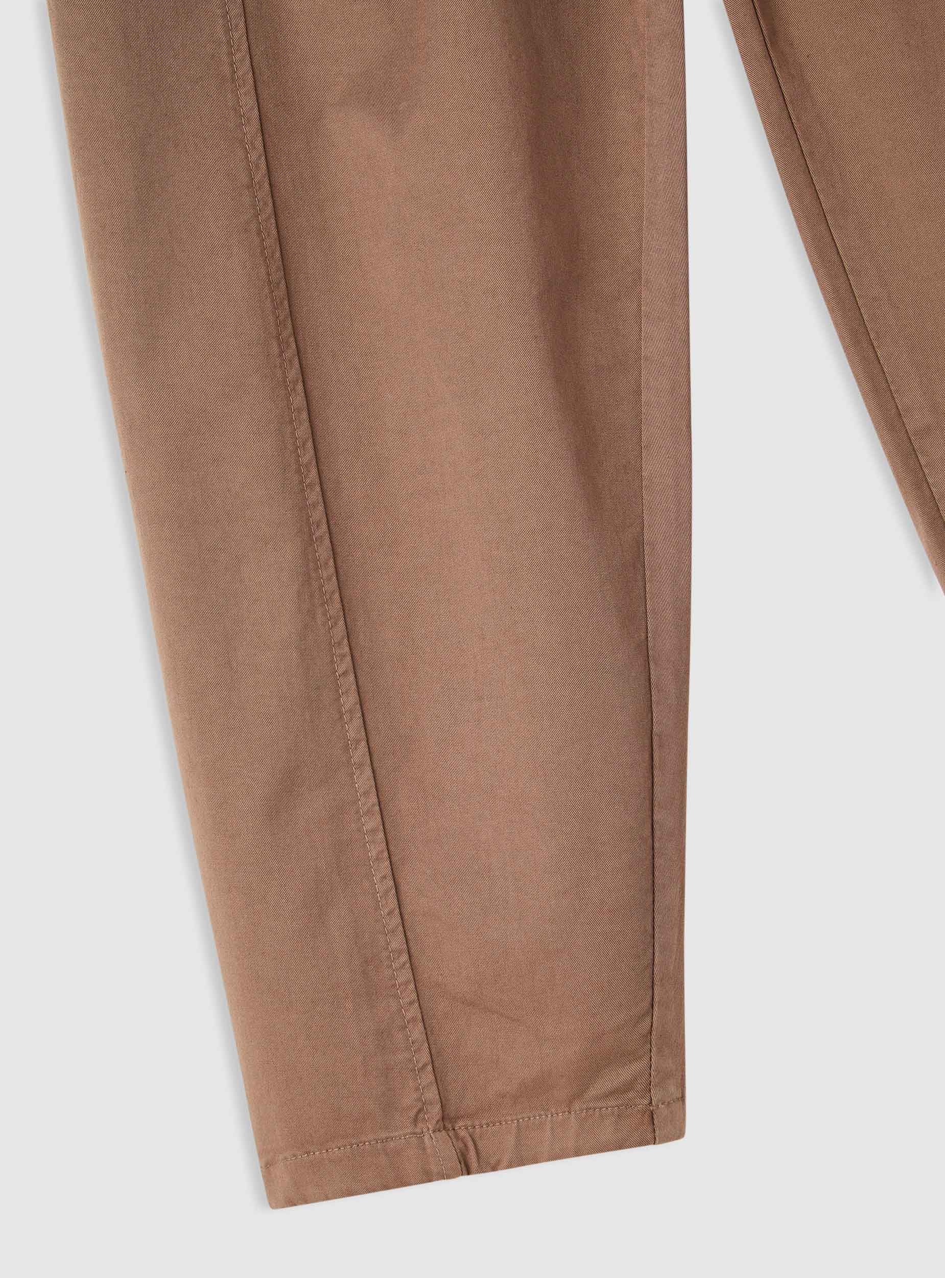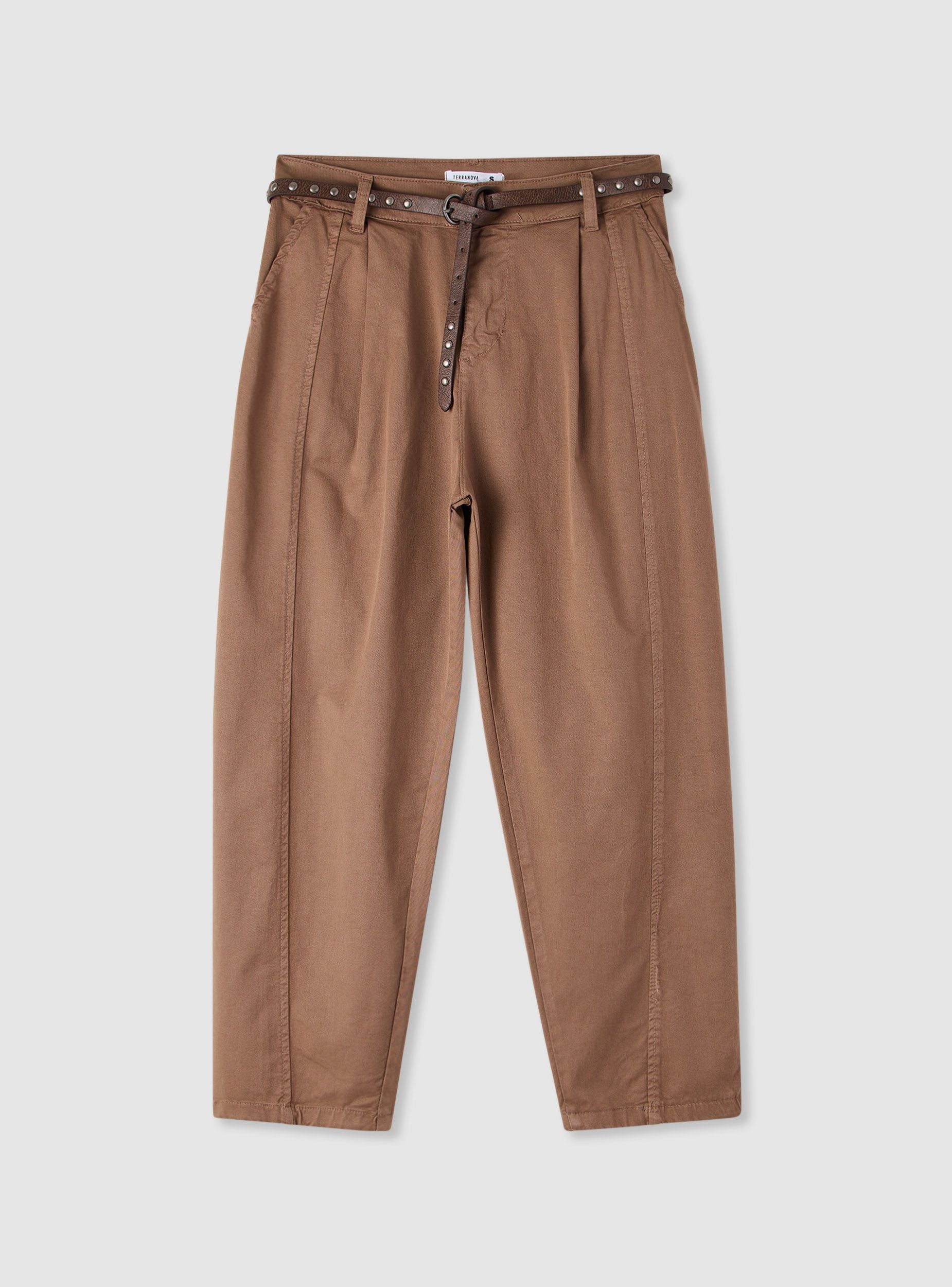 Ženske pantalone dugih nogavica u jednobojnoj varijanti sa balloon krojem, idealne za urbani i dnevni izgled. Struk sa petljama je upotpunjen kaišem sa nitnama i kopčom, dok nabori sprijeda i sužene nogavice ističu siluetu. Praktični bočni džepovi i ravni donji deo omogućavaju kombinovanje sa džemperima, košuljama ili blejzerima.Detalji
