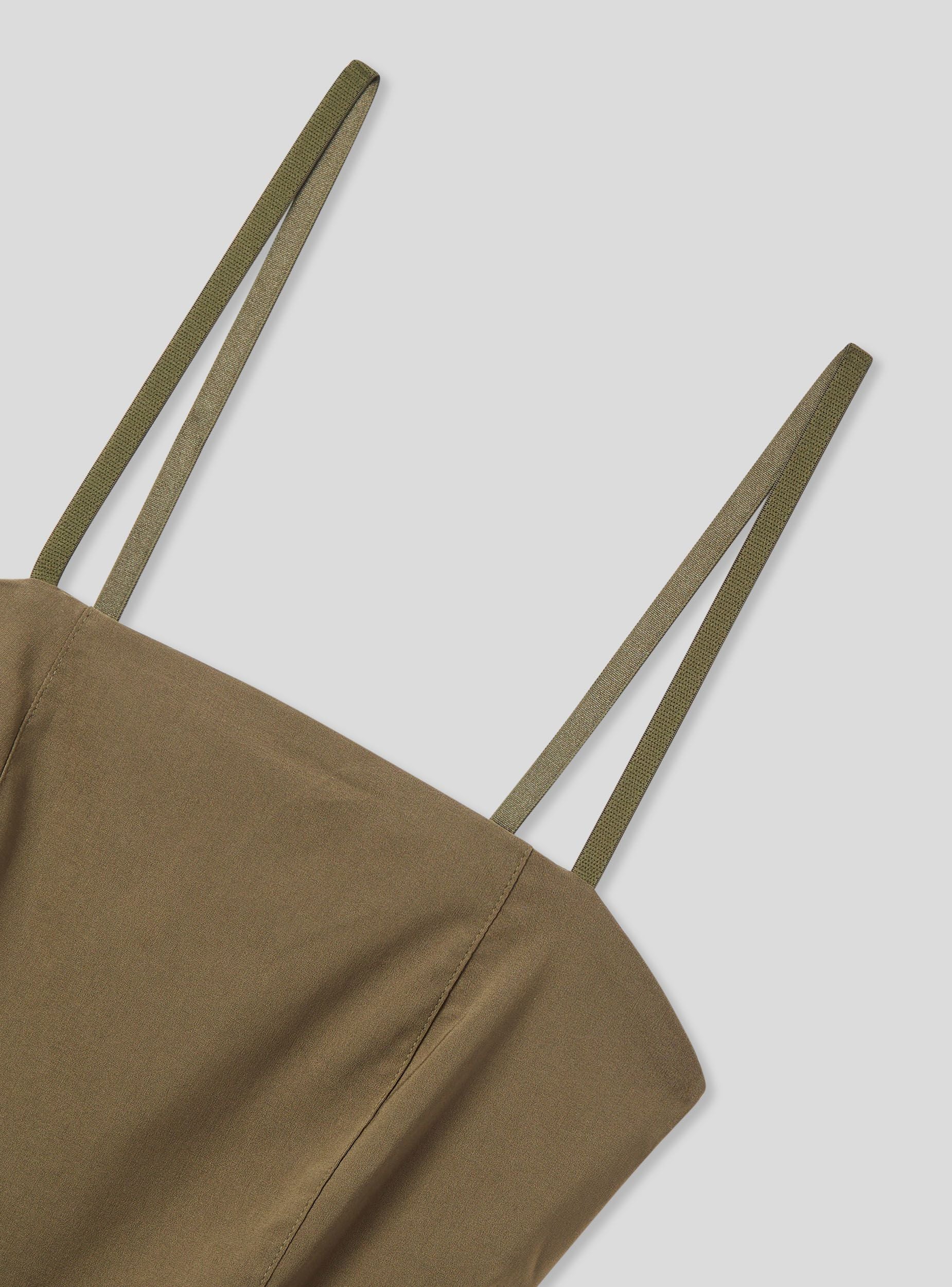 Tuta da donna lunga dal design elegante e pratico, caratterizzata da una tinta unita che esalta la sua linea essenziale. Presenta sottili spalline regolabili, che permettono una vestibilità personalizzata e confortevole. Lo stile cargo si manifesta nelle tasche laterali, aggiungendo funzionalità e un tocco casual. Completa di una cintura che evidenzia il punto vita, questa tuta è perfetta per chi cerca un capo versatile, adatto sia per il giorno che per la sera.Detalji