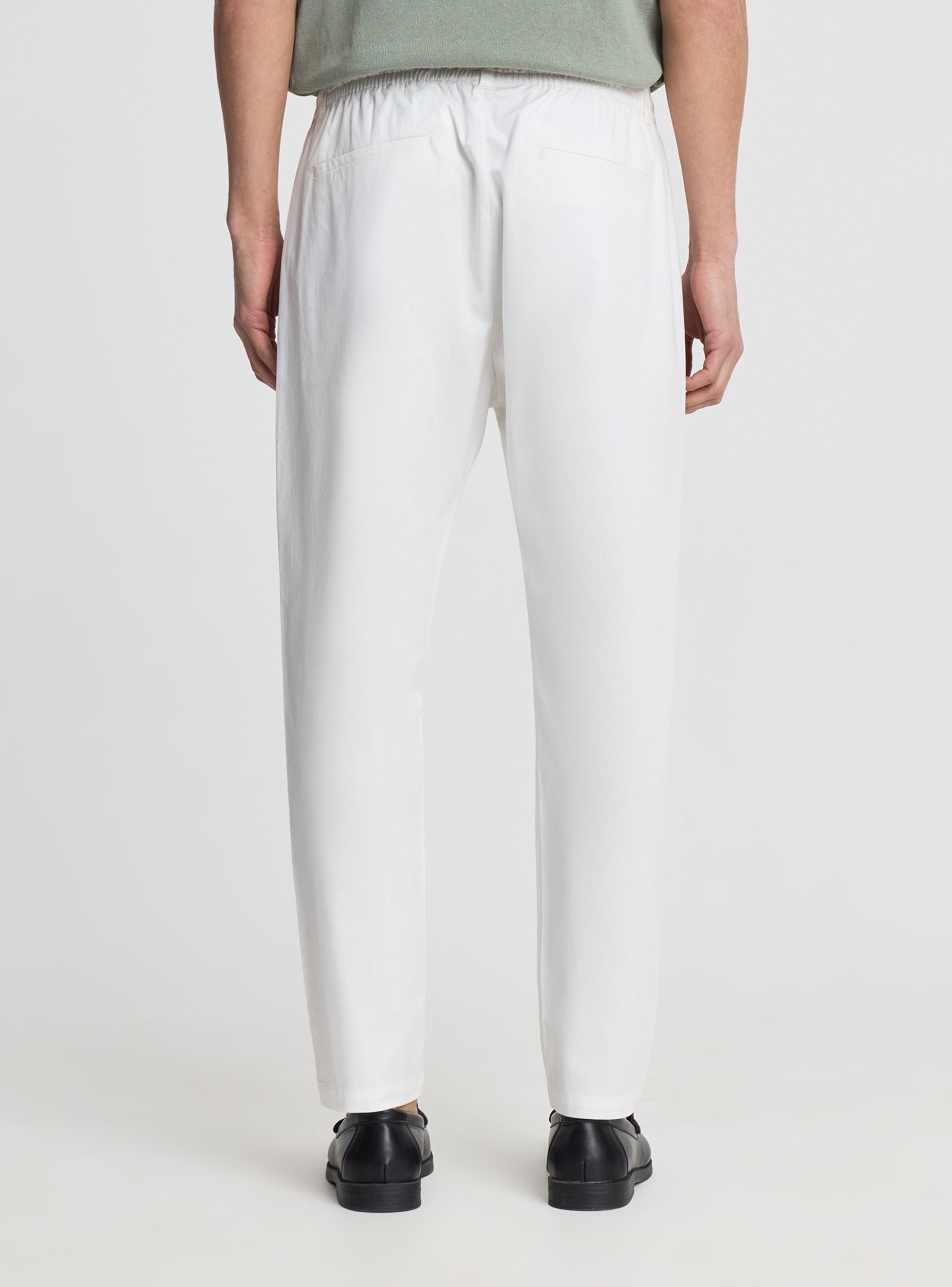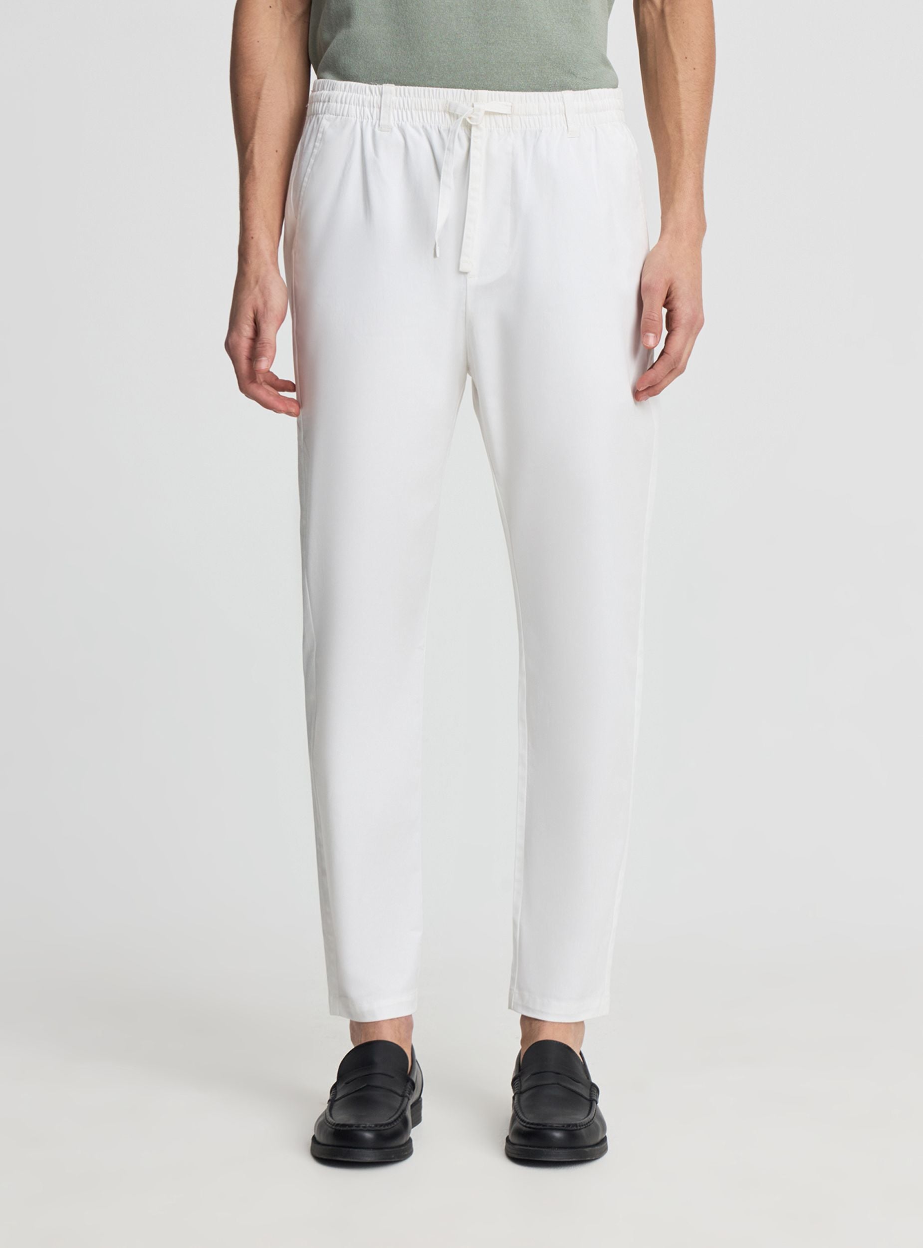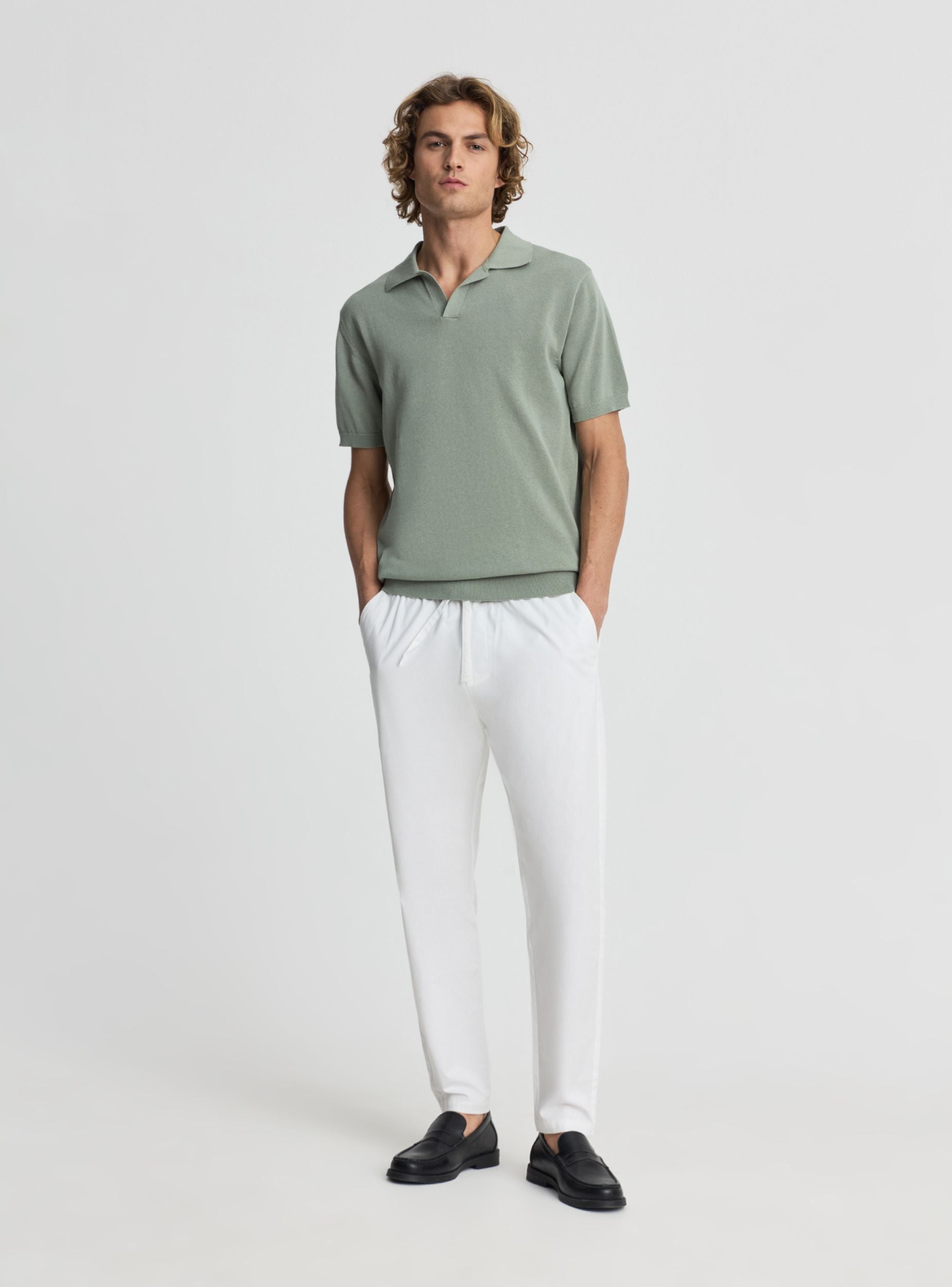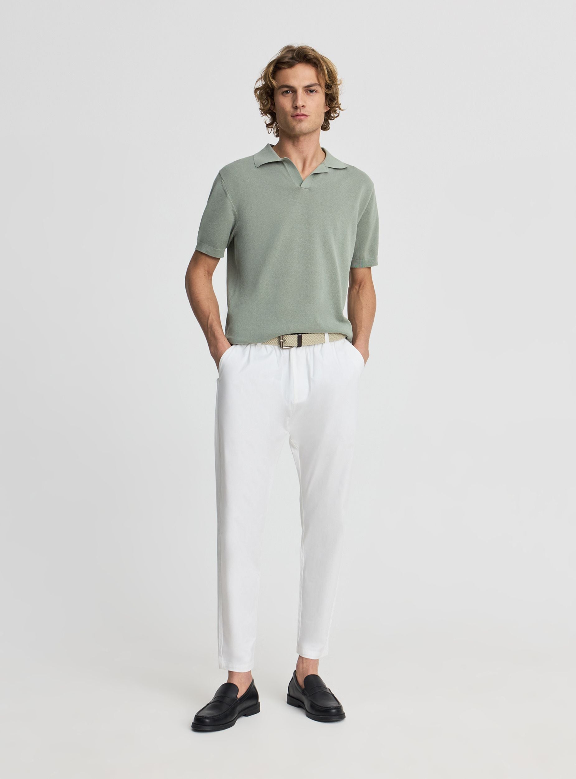 Muške pantalone dugih nogavica u jednobojnoj varijanti, savršene za ležerne i gradske kombinacije. Pojas sa elastičnom trakom i vezicom obezbeđuje udobnost i brzo podešavanje, dok blago suženi ravni kroj ističe siluetu. Lako se kombinuju sa polo majicama ili džemperima, kao i sa patikama ili mokasinama, idealne za neformalni kancelarijski izgled i slobodno vreme.Detalji