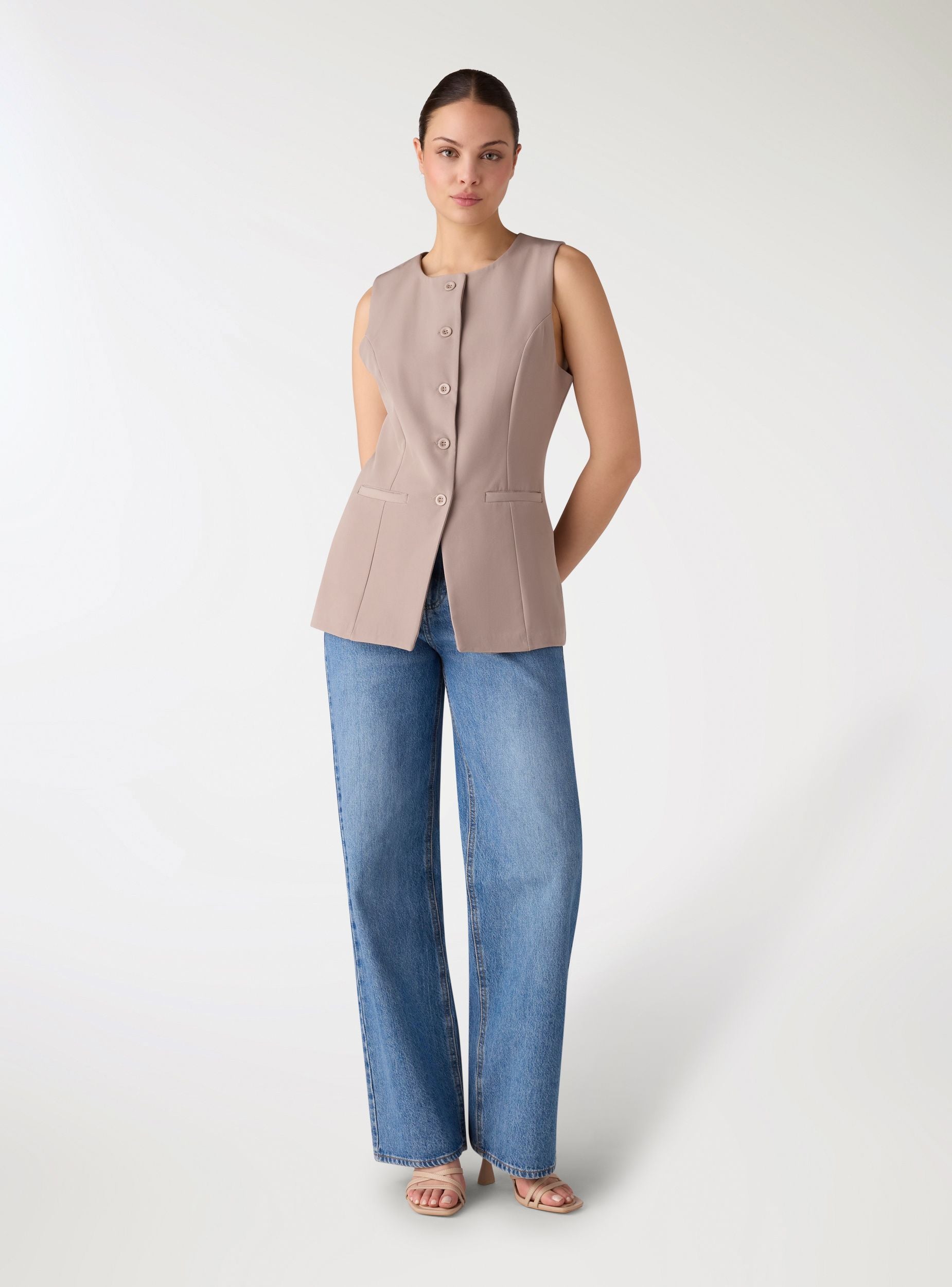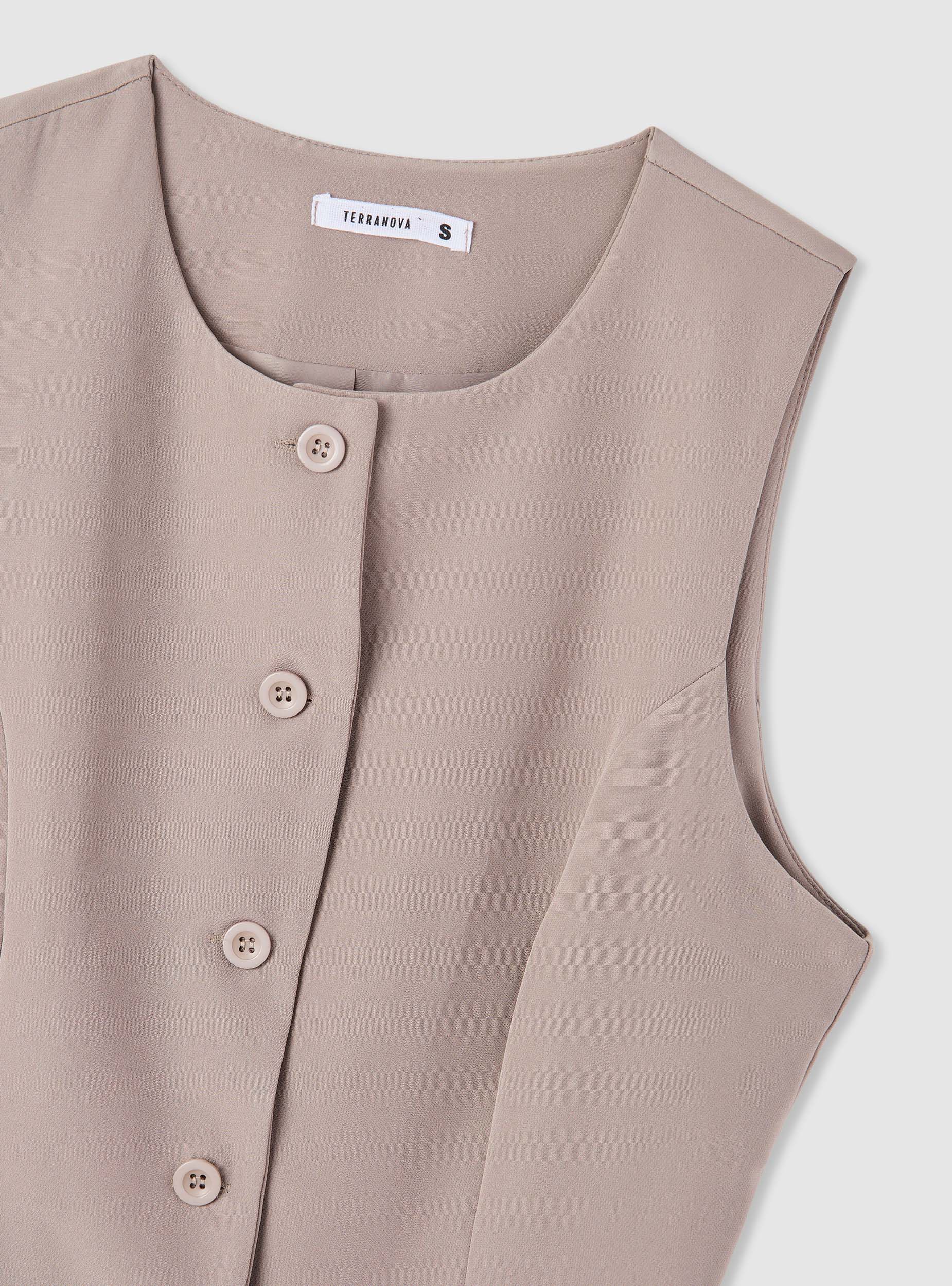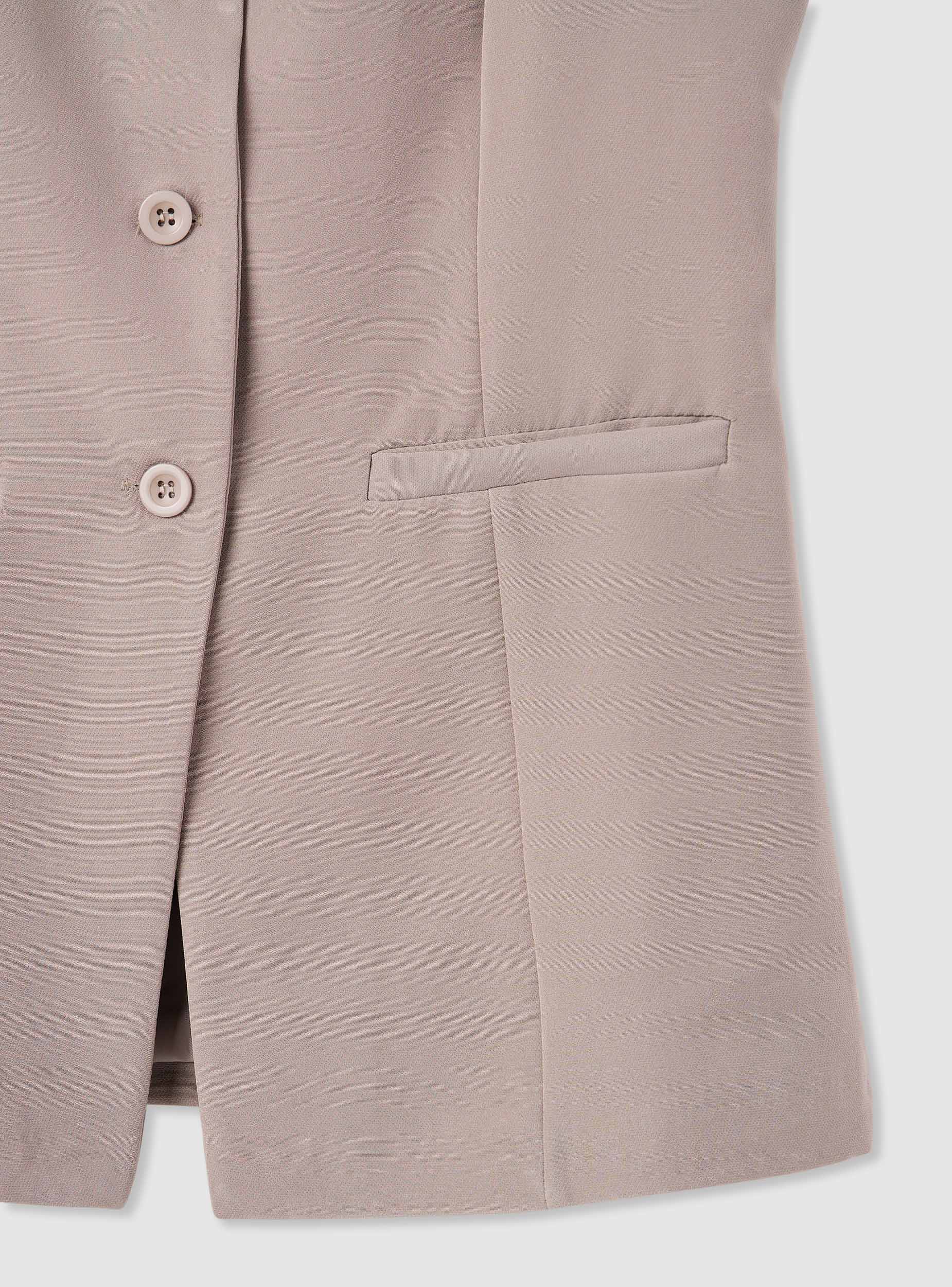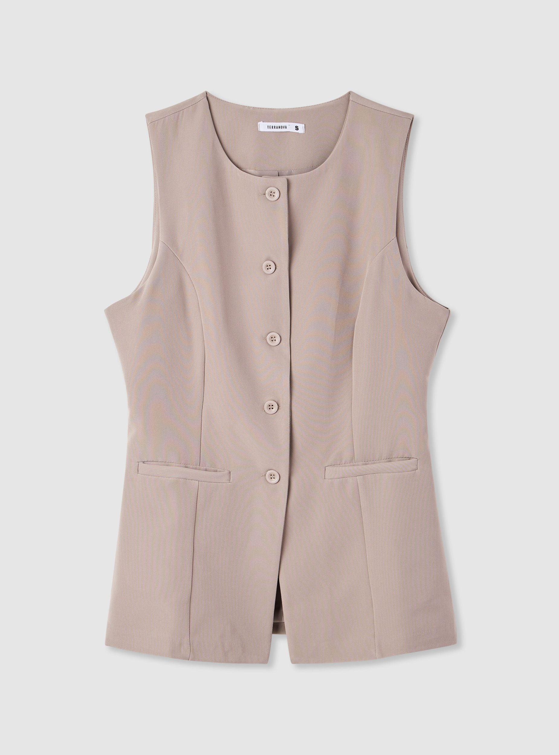 Ženski prsluk u jednobojnoj varijanti sa dugom i krojačkom siluetom. Bez kragne i rukava, izdvaja se zatvaranjem na dugmad duž cele prednje strane i praktičnim bočnim džepovima sa uskim otvorima. Struktuirani kroj naglašava figuru, dajući uredan i moderan izgled. Svestran i profinjen, savršeno se kombinuje sa krojačkim pantalonama ili džinsom, prilagođavajući se urbanim, poluformalnim i posebnim prilikama sa prirodnom elegancijom.Detalji