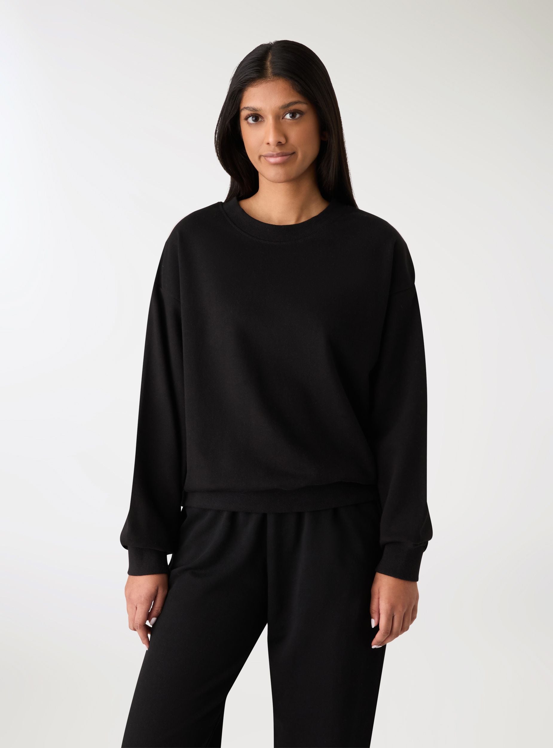 Ženska dukserica bez kapuljače i rajsferšlusa, jednobojna. Rebrasti okrugli izrez, dugi rukavi sa elastičnim manžetnama i donji deo sa pletenom trakom za udobno pristajanje. Minimalistički dizajn idealan za slobodno vreme i ležerne kombinacije sa farmerkama ili trenerkama, savršena i ispod kaputa ili jakne. Lagani materijal.Detalji