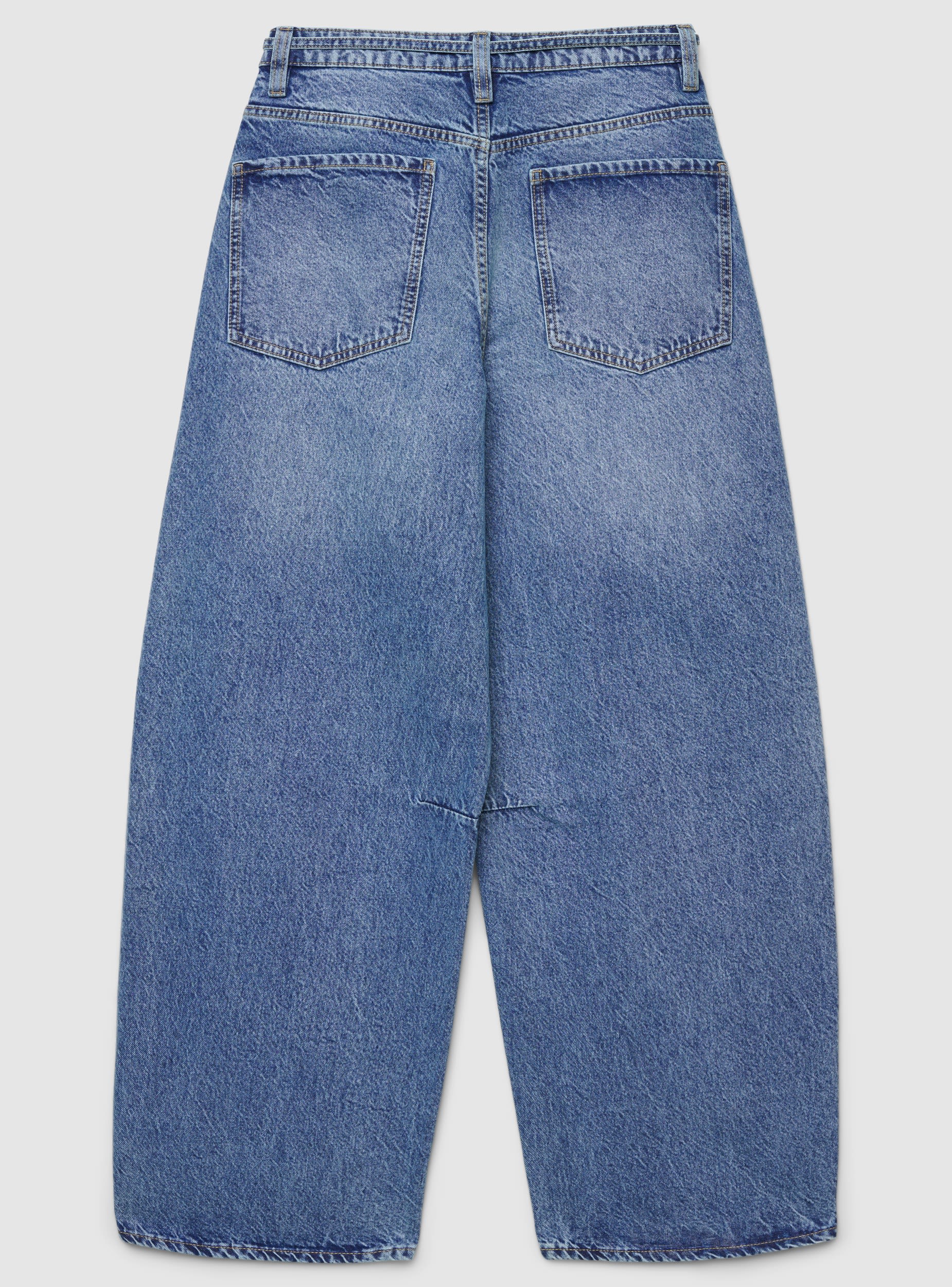 Ženske farmerke u jednobojnoj varijanti, kroja barrel sa širokim i blago suženim nogavicama, idealne za casual i street stilove. Visoki struk sa pertlama je ukrašen vezicom, dok zatvaranje na rajsferšlus upotpunjuje dizajn. Model sa pet džepova, lako se kombinuje sa uskim topovima ili mekim košuljama, kao i sa patikama ili sandalama.Detalji
