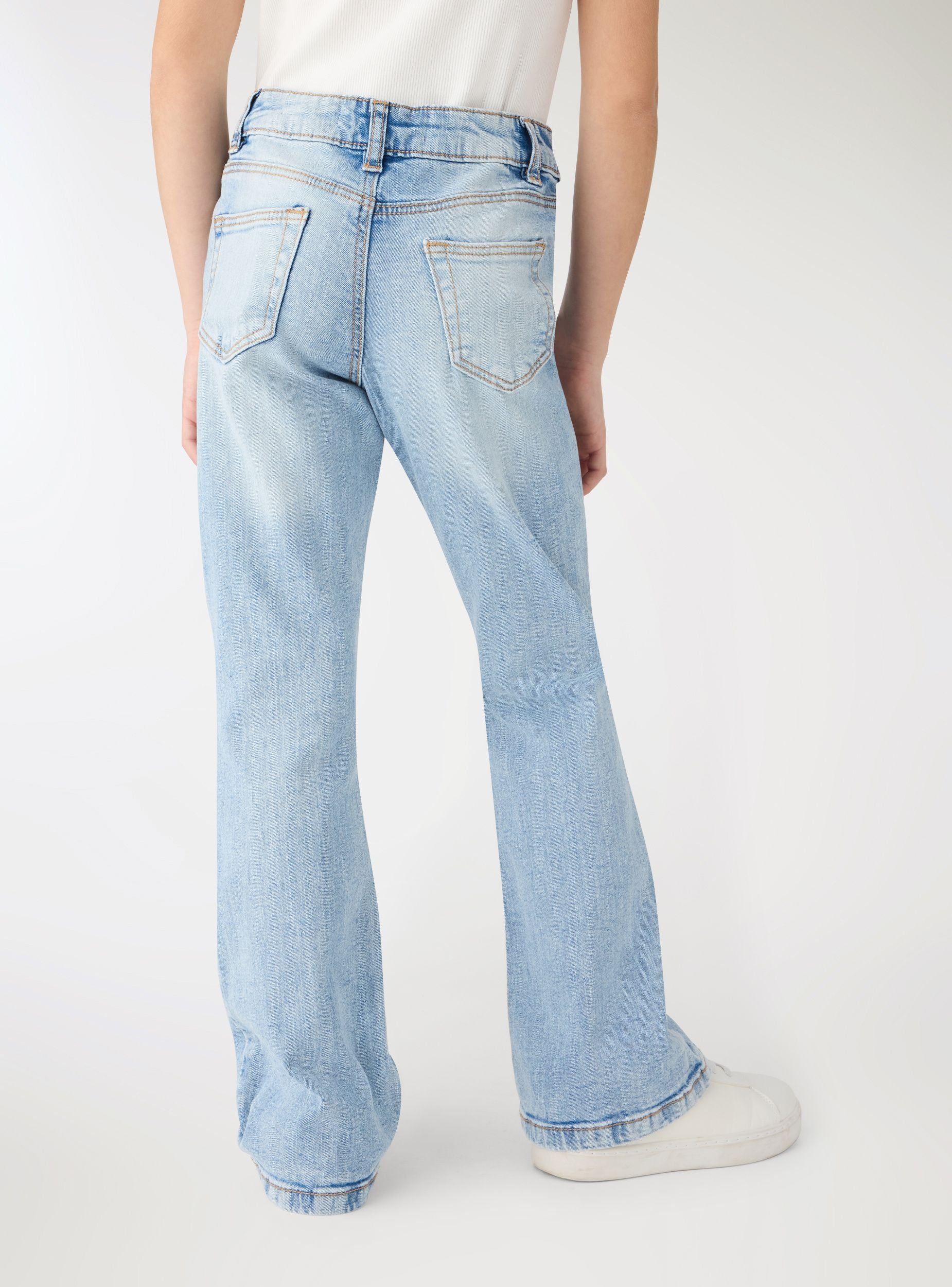 Farmerke za devojčice u jednobojnoj varijanti sa zvonastim nogavicama i laganim poderotinama napred, savršene za svakodnevni ležerni izgled. Model sa pet džepova i prorezima za kaiš u struku, zatvaranje na dugme i rajsferšlus. Regular kroj koji izdužuje figuru, idealan uz majicu i patike ili uz duksericu za slobodno vreme. Srednje pranje sa nijansama koje daju izbledeli i trendi izgled.Detalji