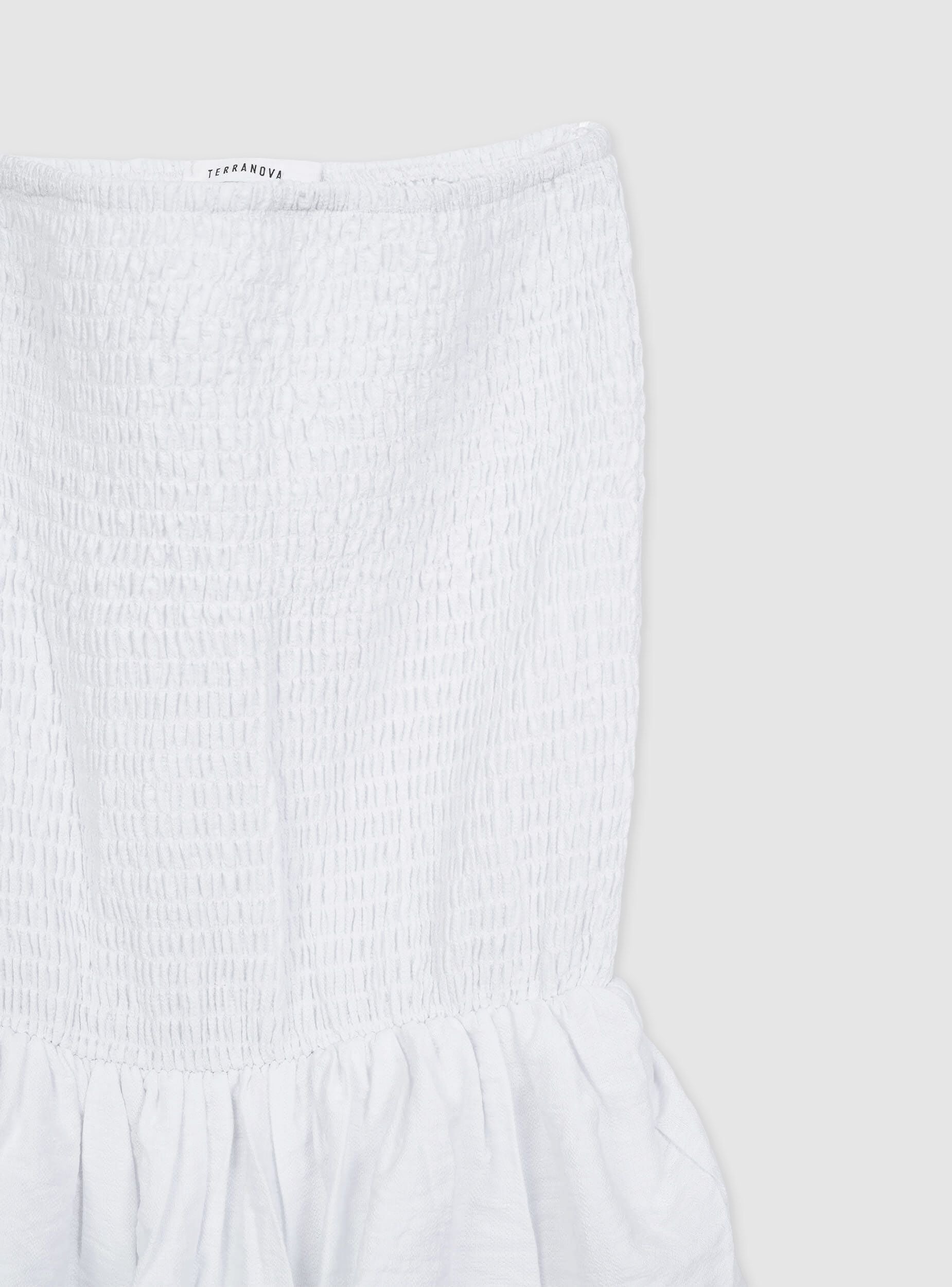 Abito da donna corto a tinta unita, caratterizzato da una fascia superiore con lavorazione a punto smock che garantisce un'aderenza perfetta al corpo, lasciando le spalle scoperte. La gonna è arricchita da morbide balze che aggiungono movimento e leggerezza all'intero capo, creando un effetto voluminoso e dinamico. La linea a balze conferisce un aspetto femminile e giovanile, ideale per le giornate estive e le occasioni casual.Detalji