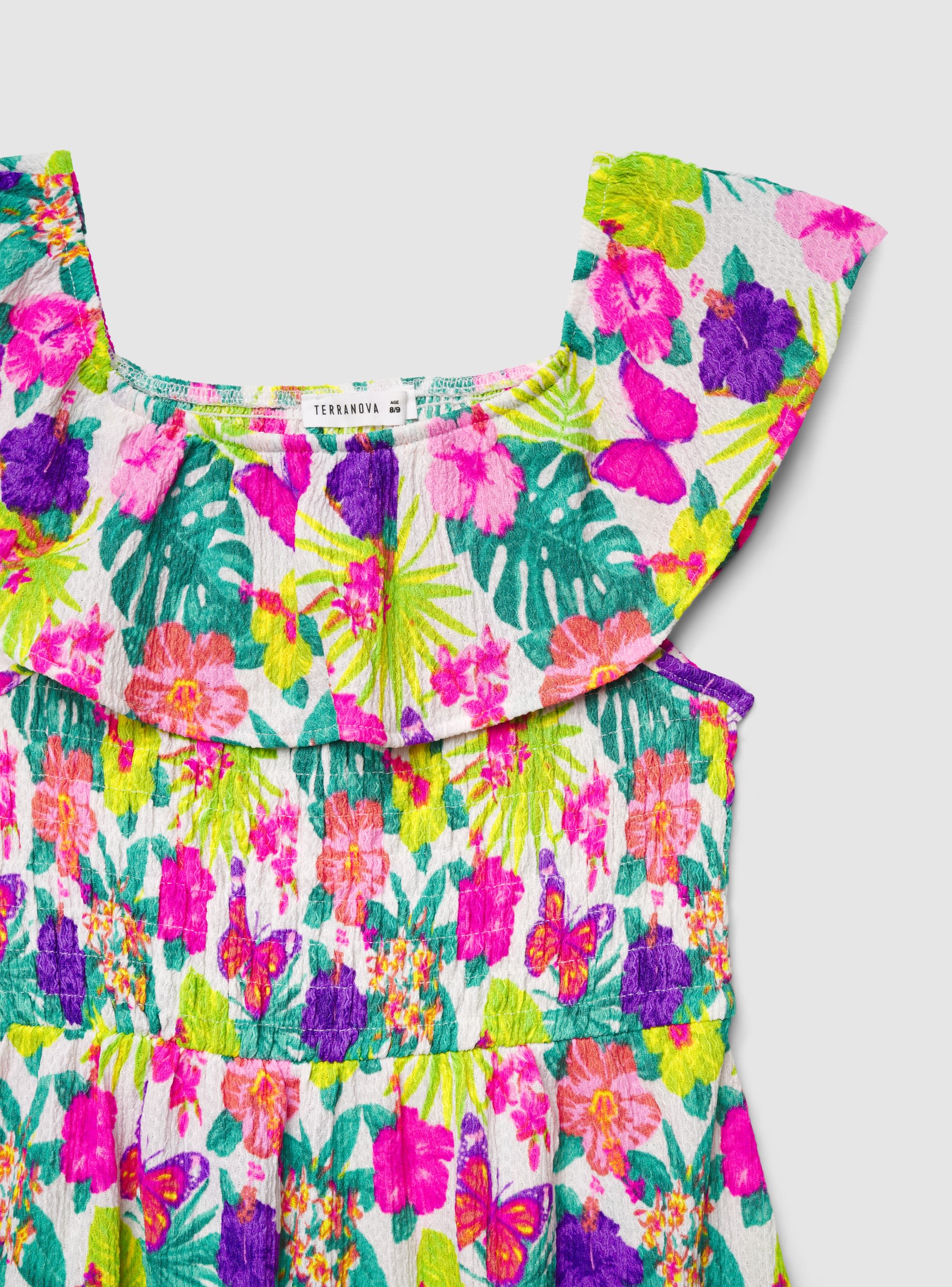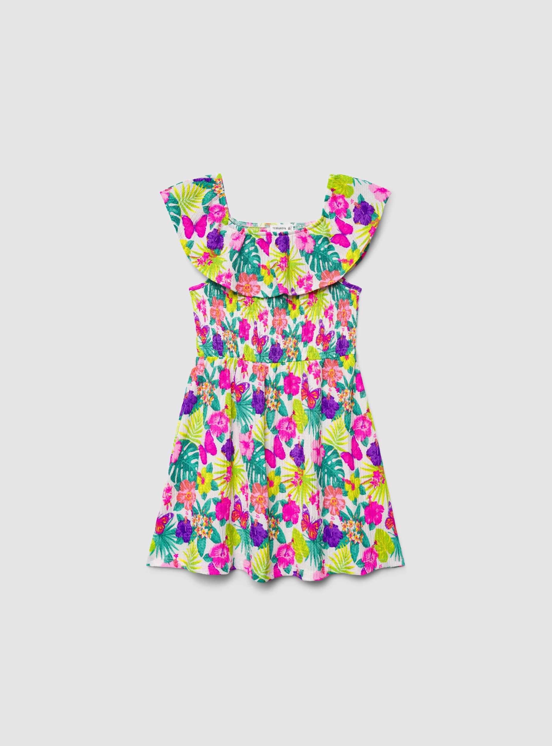 Haljina za devojčice sa cvetnim i leptir printom, dizajnirana za letnje dane i neformalne proslave. Model bez rukava sa tankim bretelema i okruglim izrezom, ukrašen širokim volanima na ramenima. Gornji deo sa naborima i elastičnim strukom koji ističe kroj, suknja širokog kroja, udobna za kombinovanje sa sandalama ili patikama.Detalji