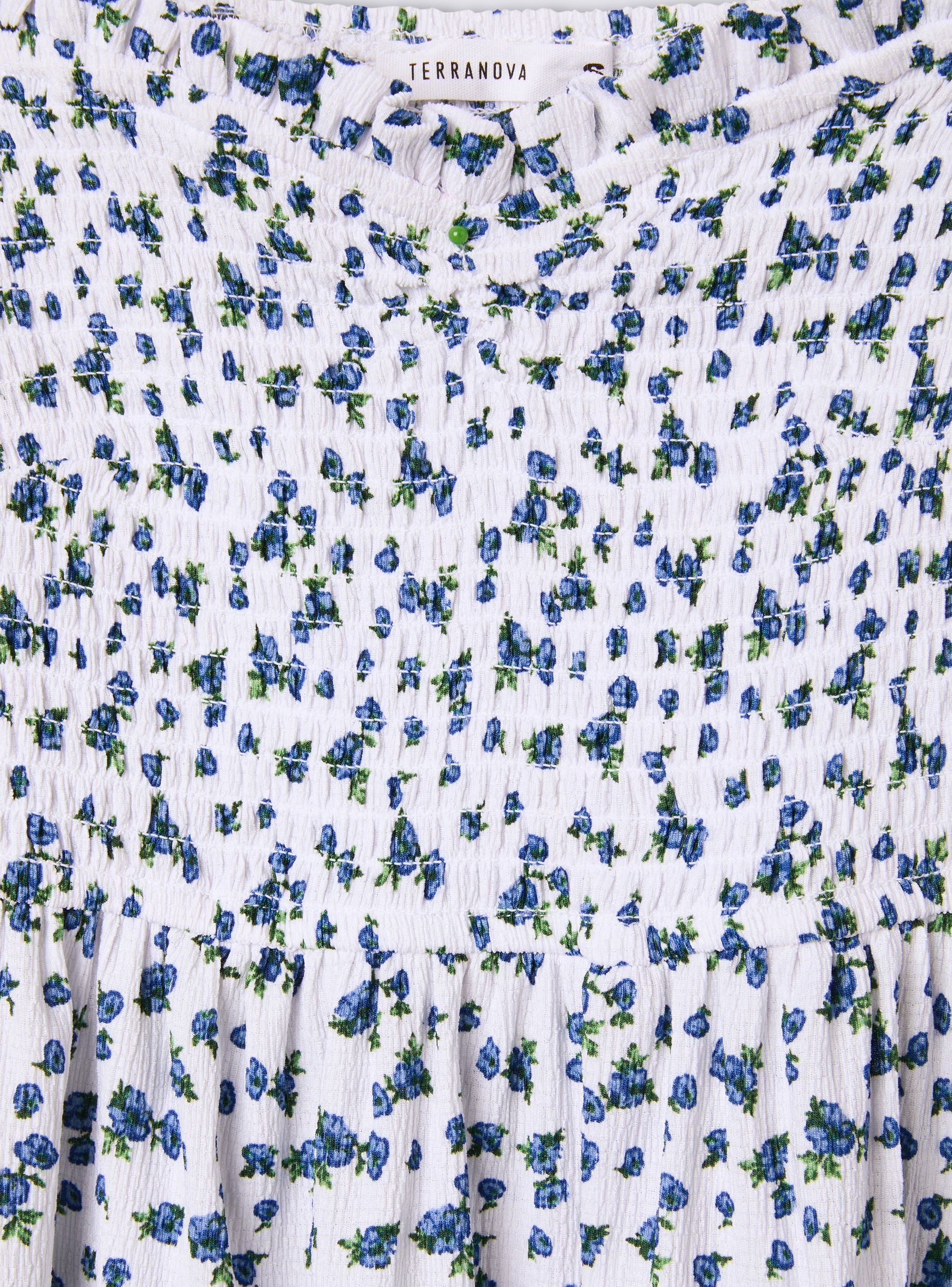 Abito da donna corto a fantasia floreale, ideale per un look fresco e romantico. La parte superiore presenta un delicato punto smock che si adatta al corpo, enfatizzando la silhouette. Le maniche corte aggiungono un tocco femminile rendendolo perfetto per giornate estive. La gonna è leggermente svasata, cadendo morbida per un effetto fluido e leggero. Un capo versatile che unisce comfort e stile, perfetto da indossare per diverse occasioni con un tocco di eleganza naturale.Detalji